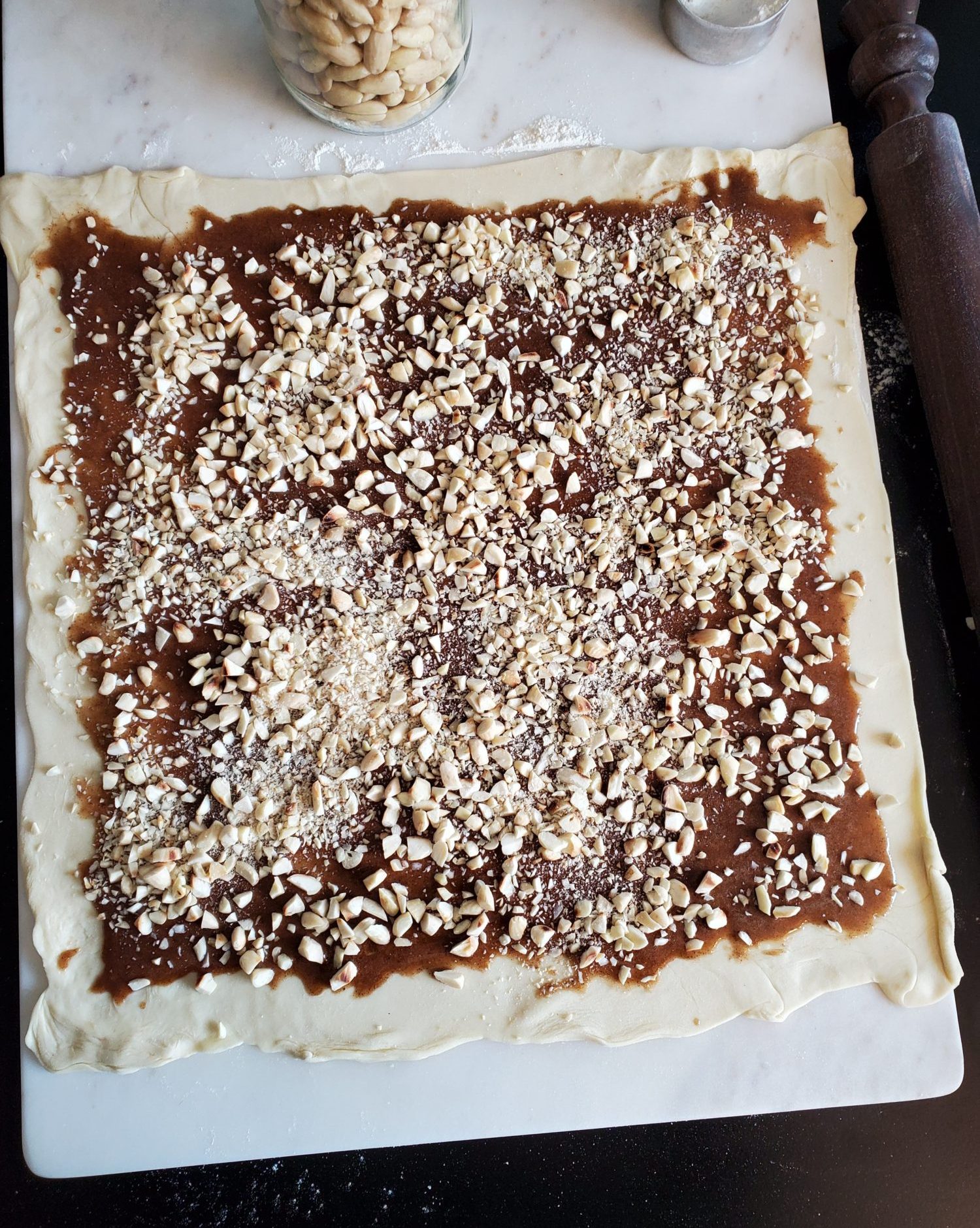 I have to say, I’ve made quit a few changes to the original recipe. Katie calls for her homemade puff pastry to be rolled out to a 20″ square. Maybe the amount of pastry in her recipe allows for this. Using store bought pastry, and using a typical one block (397 grams, approx 14 ounces) or 2 sheets layered on top of each other, only gave me a 12″ x 16″ rectangle. I could have stretched it further, but I didn’t want to run the risk of it tearing open as I rolled the nuts and apple chunks over it. These days I actually like rolling out the pastry just to a 13×15 inch rectangle. It means that there is enough dough to fill out the final baked pastry, and I’m not forcing the dough to stretch further than it should. Plus you get more of the layers of pastry this way!