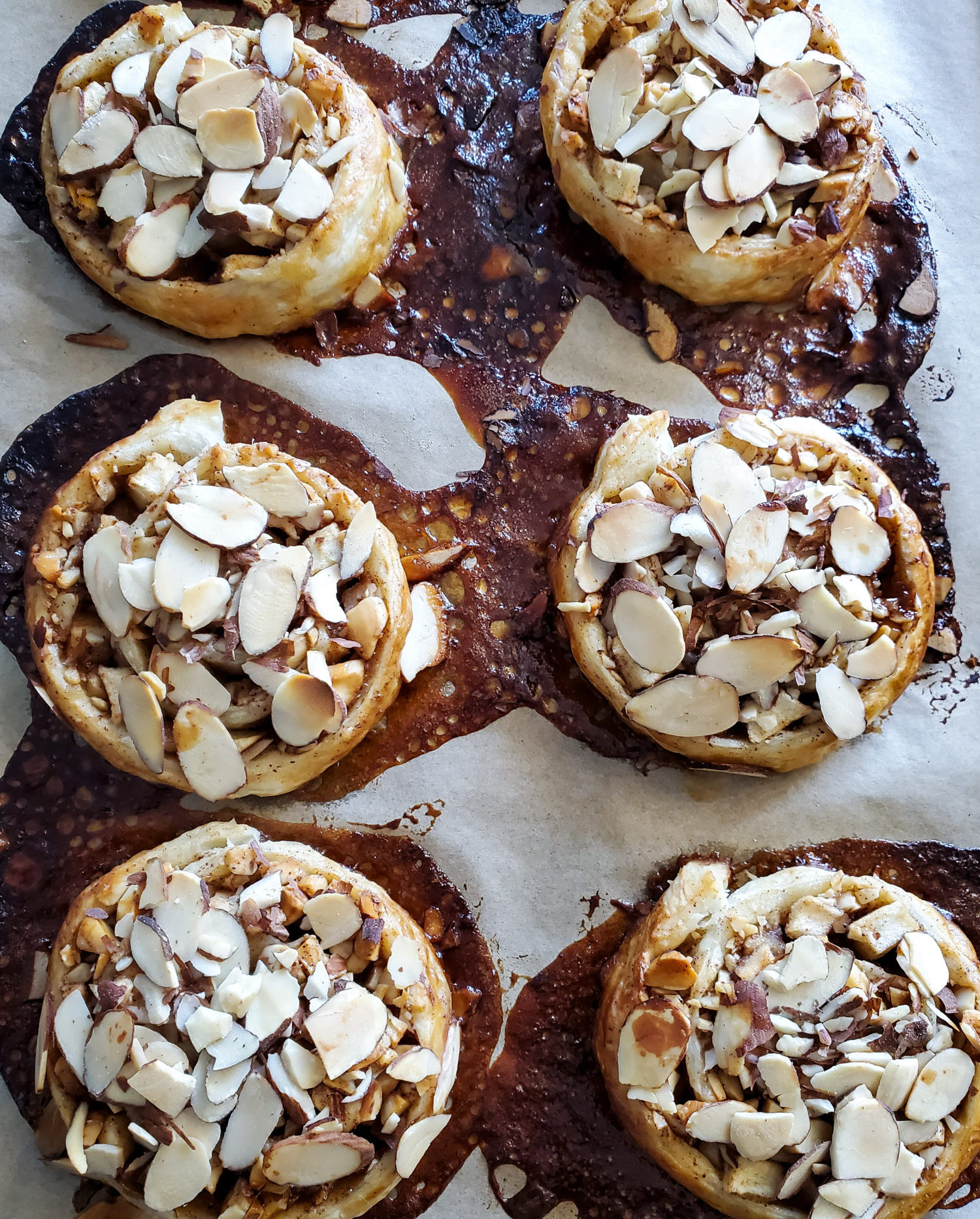 Once you have your pastry rolled out, the recipe comes together pretty quickly. It’s not unlike making cinnamon rolls, but thinner. The nuts and apples combined with maple syrup, vanilla paste and spices just makes the perfect filling for these little goodies. And then a bit of an egg wash and sliced almonds sprinkled over them all, and into the oven they go.