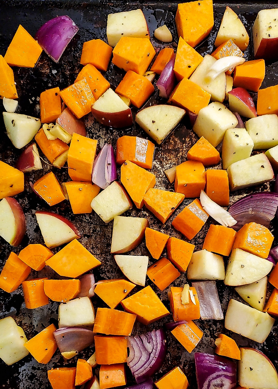 - Combine the sweet potatoes, carrots, apples, onion, garlic and ginger on a large baking sheet. If necessary, use two baking sheet to ensure that the vegetables can all sit in one layer.
