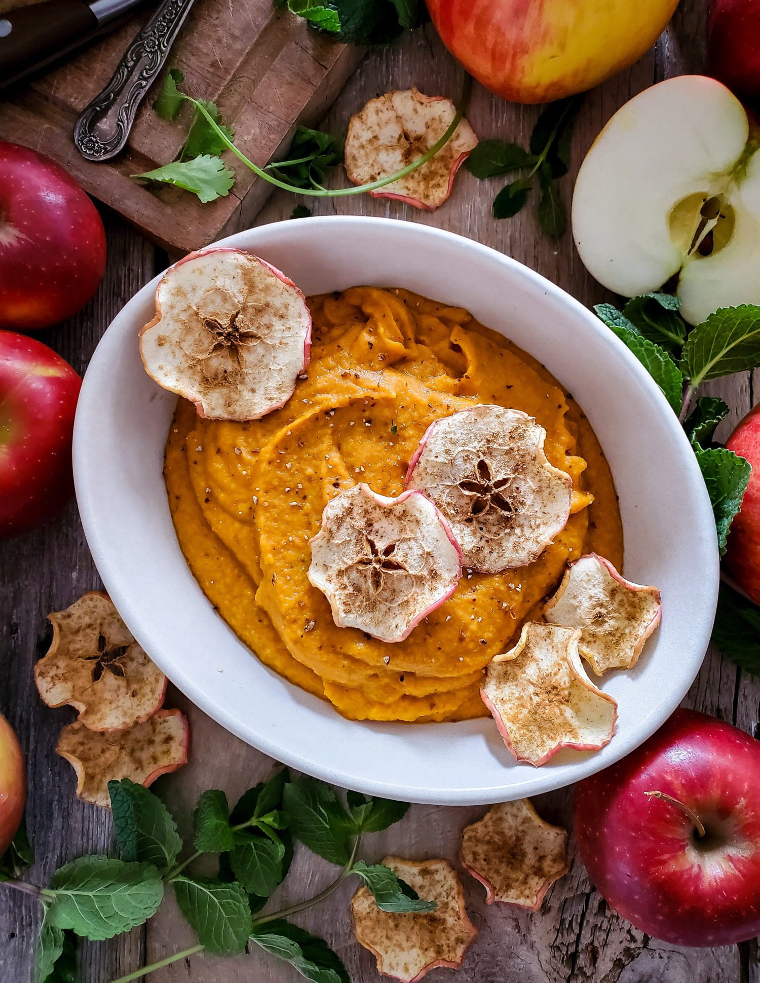 Creamy, aromatic, and yet light in texture, this lovely root vegetable and apple purée is a perfect side to roast chicken or pork. Ginger, apple cider and apple chips all add their flavours and crunch for contrast.