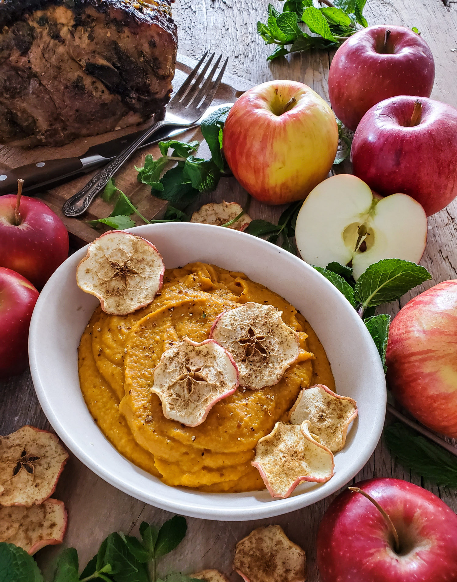 I decided to garnish the dish with apple chips. But instead of frying mine up like we did that evening, I think baking is a whole lot easier, and less messy. But of course, it does take more time. In fact, you can do this step first, earlier in the day. Make heaps for snacking on! Usually I just sprinkle the thinly sliced apples with cinnamon and sugar before putting the baking sheet of them into the 200F oven for a few hours. This time however, I sprinkled them with ground coriander and ginger. This way they would be a great accompaniment to the purée and the Mojo Pork roast I decided to serve it all with.