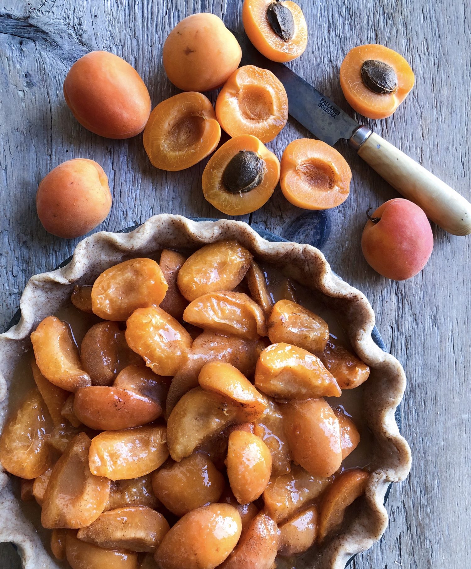 Then I thought about the filling.  Usually I use ground almonds or almond flour at the bottom of my pie shell to soak up any extra juices from the filling as it’s baking up.  And yes, almonds and apricots go beautifully together.  But I wanted to switch it up.  Hazelnuts and apricots are lovely together, at least they are in my favourite nut and dried fruit combo.  So out came the jar of ground hazelnuts.  If you don’t have ground hazelnuts or hazelnut flour (Bob’s Red Mill carries it, or get it here)  you can easily just grind some in a small food chopper or mill.  You only need about 2 or 3 tbsp of the ground hazelnuts.  If you are looking to have nut flour options in your pantry, hazelnut flour is a great one to have on hand.