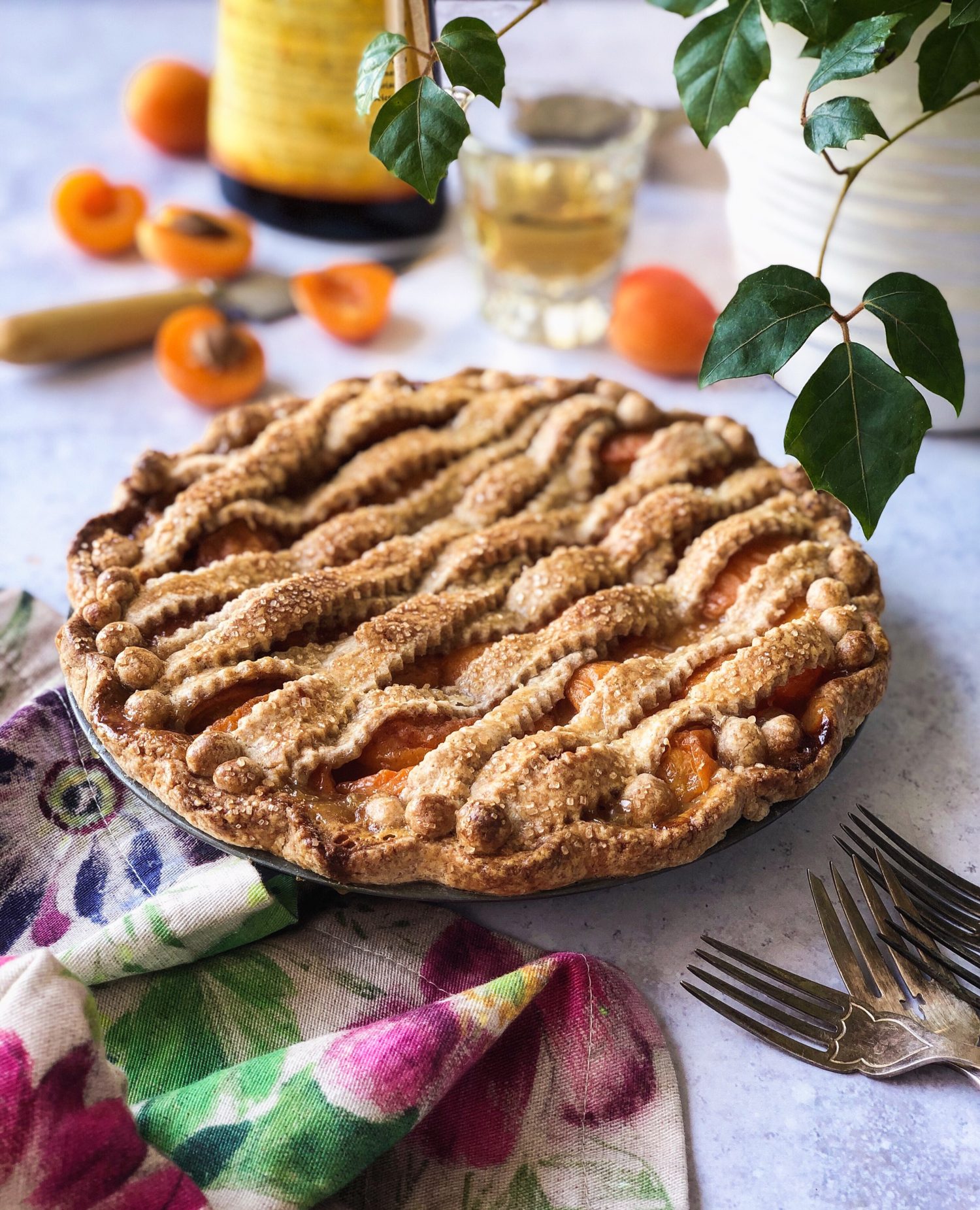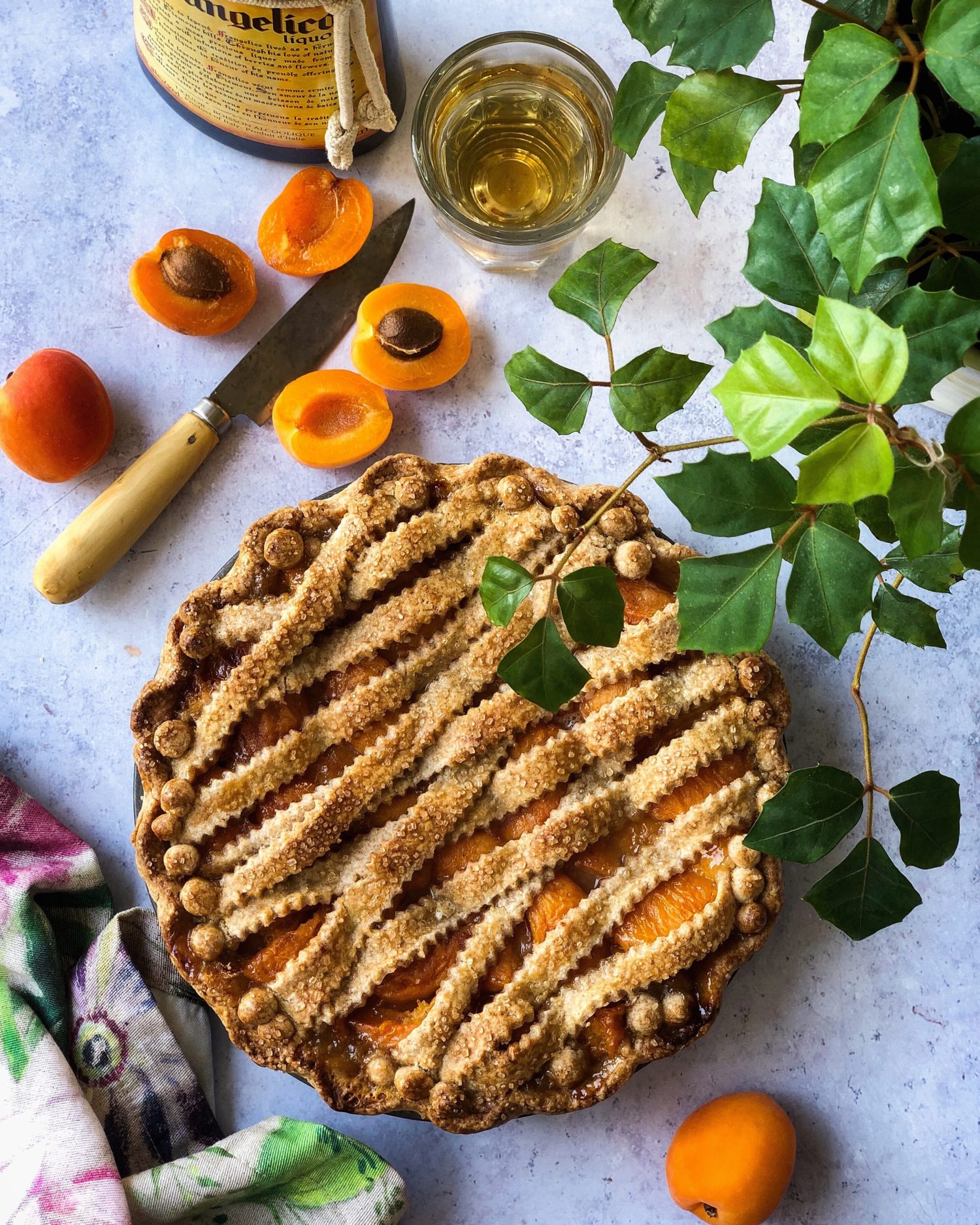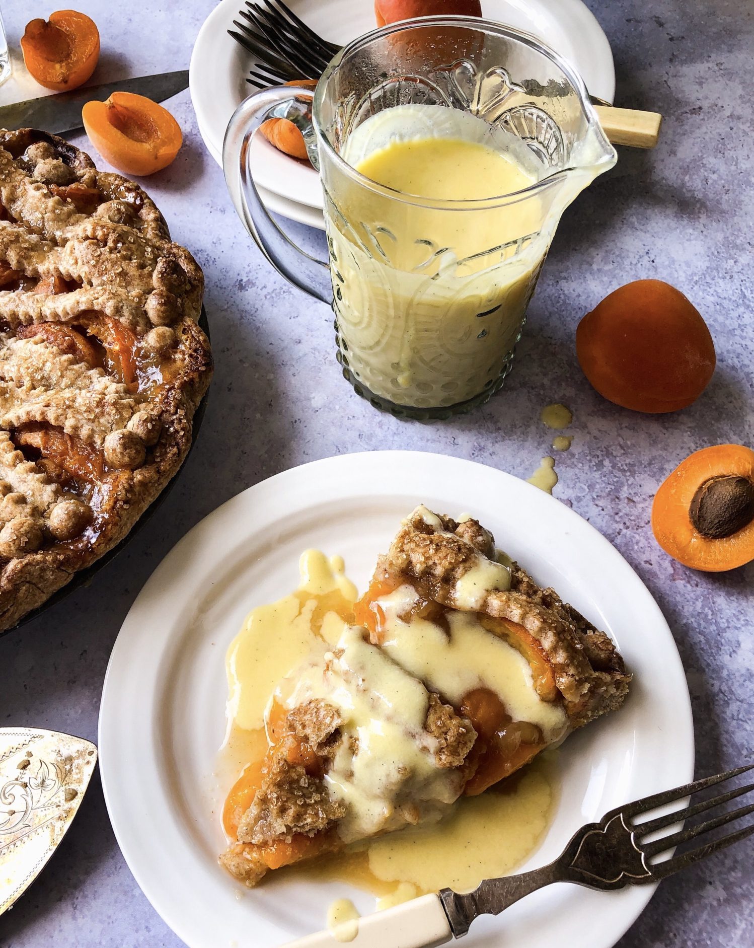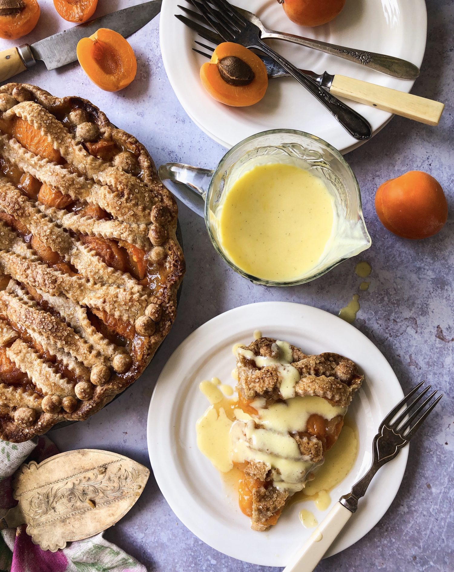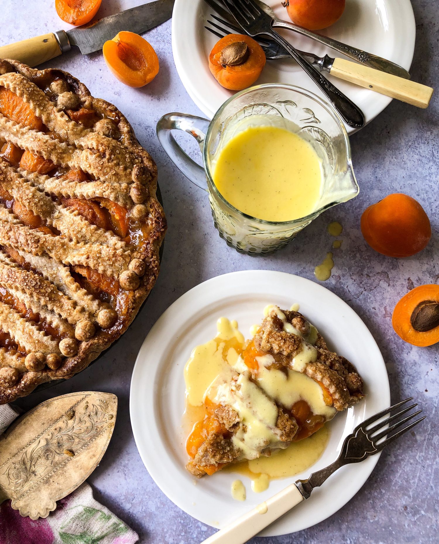 Bright apricots combine with ground hazelnuts and hazelnut liqueur for a tasty summery filling.  The crust is a Spelt and cinnamon one.  The finished pie is drizzled with creamy vanilla sauce for a perfect early summer pie.