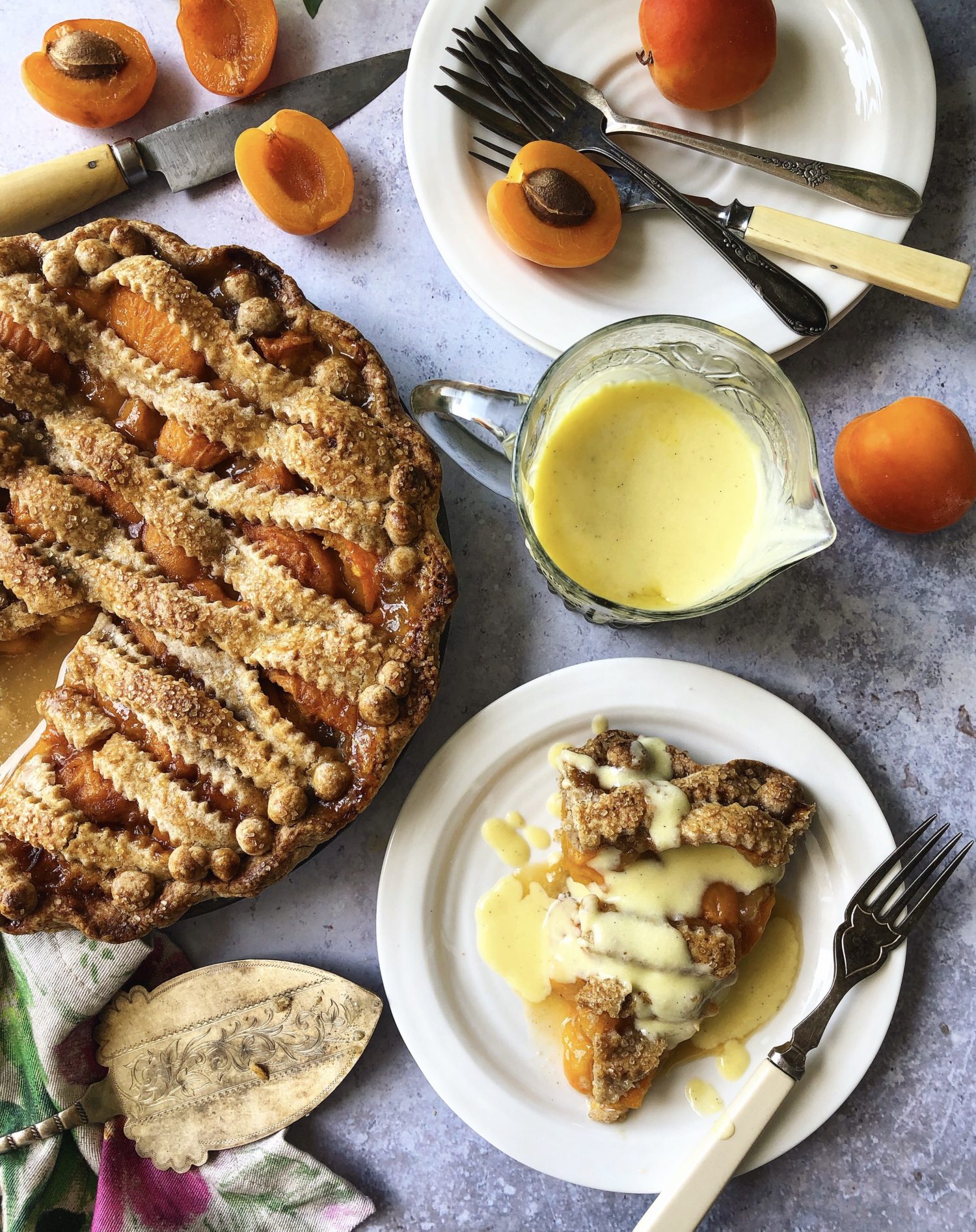 A book that I go to for reference all the time is The Four and Twenty Blackbirds Pie Book.  It has guided me as I started experimenting with pie fillings, and has given me the confidence to create my own fillings through the years.  So of course, I did check to see if there was an apricot pie in the book.  There is.  What this told me, is that I wasn’t completely out to lunch when I first thought of using apricots for a pie filling!  What their recipe inspired me with, was how they served it.  They serve the apricot pie with a vanilla sauce of sorts.  Sometimes it’s called custard sauce.