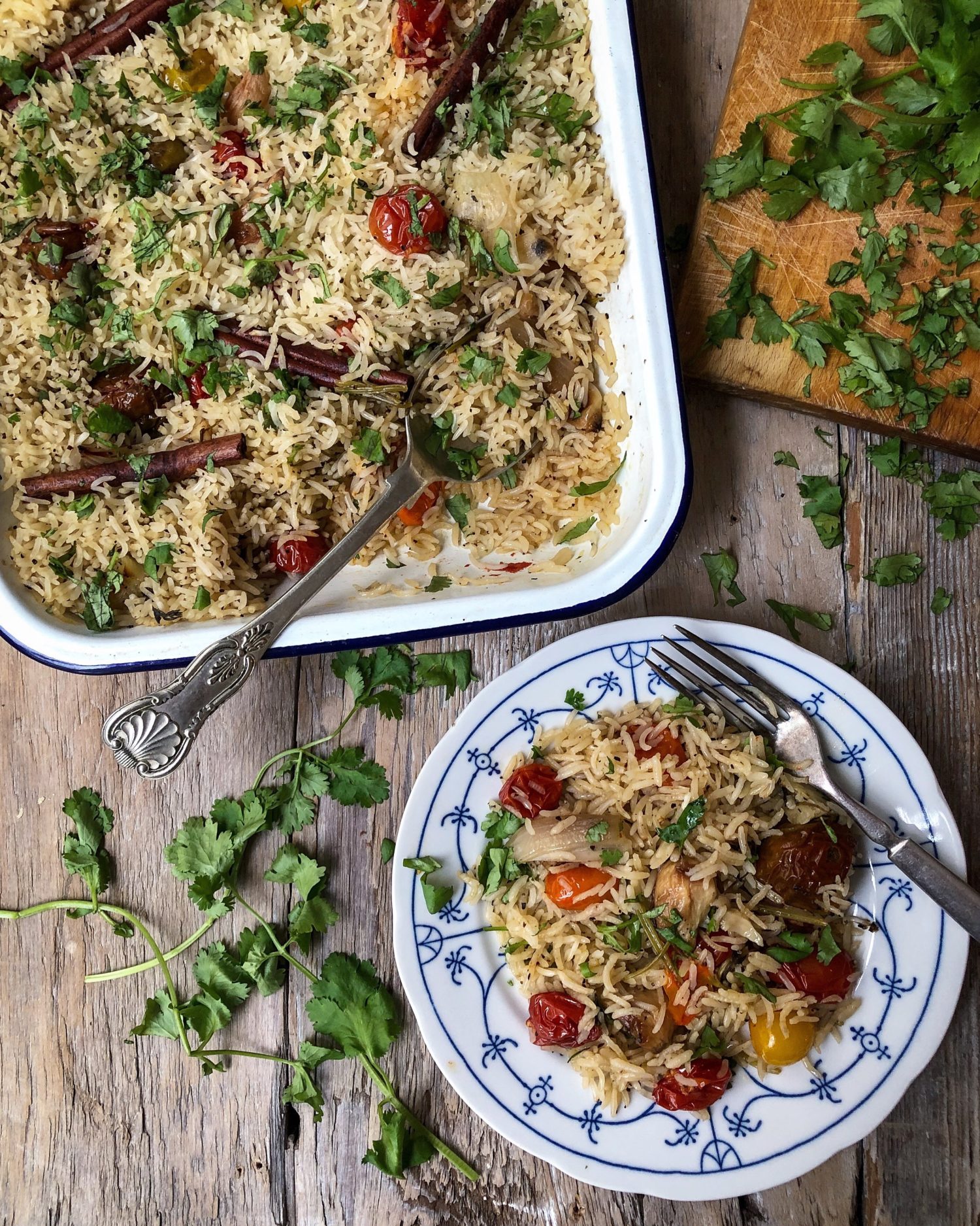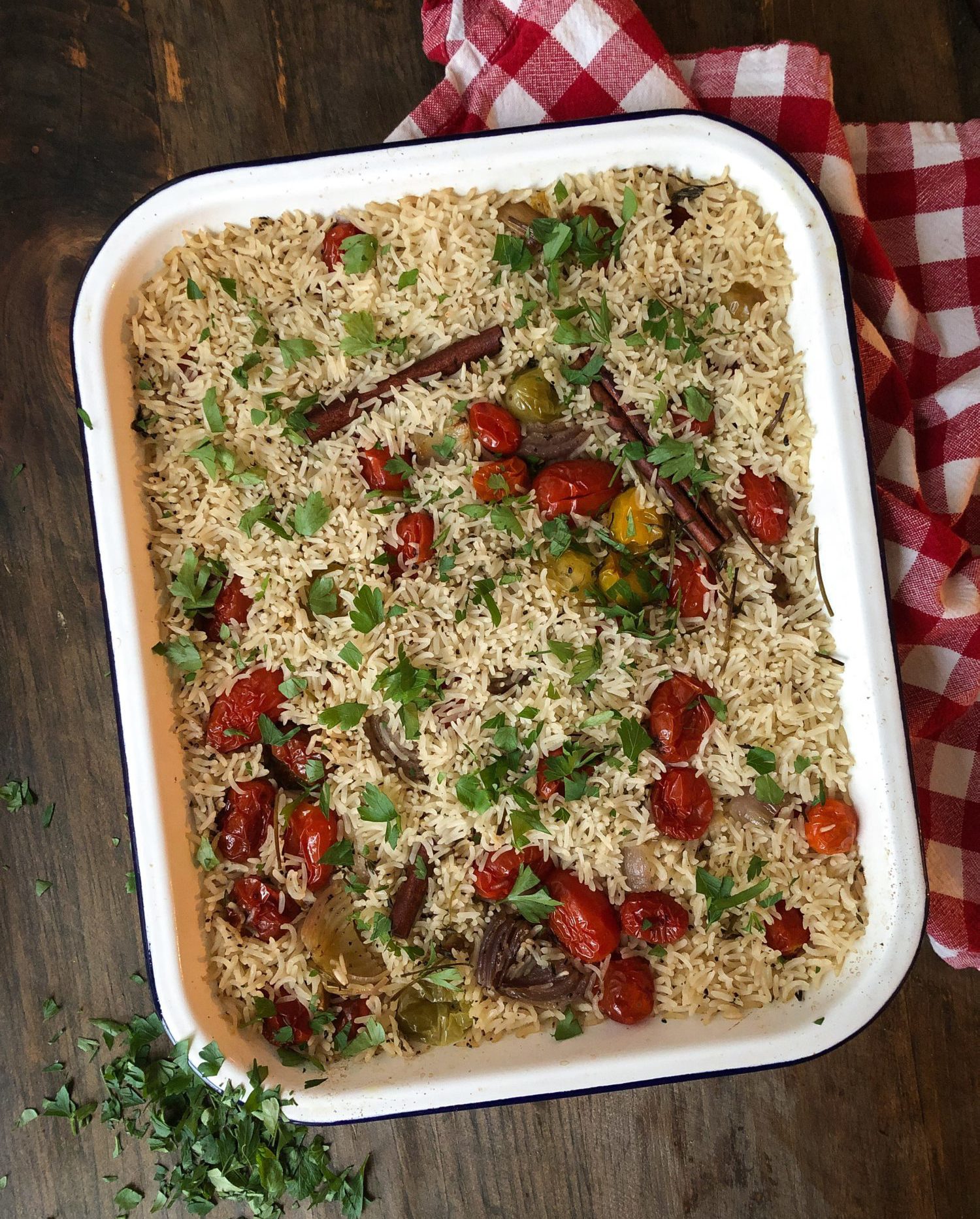 Filed Under: Sides, Vegetarian Tagged With: baked rice, basmati rice, cherry tomatoes, cilantro, cinnamon stick, garlic, healthy, january, shallots, side dish, thyme, vegetarian