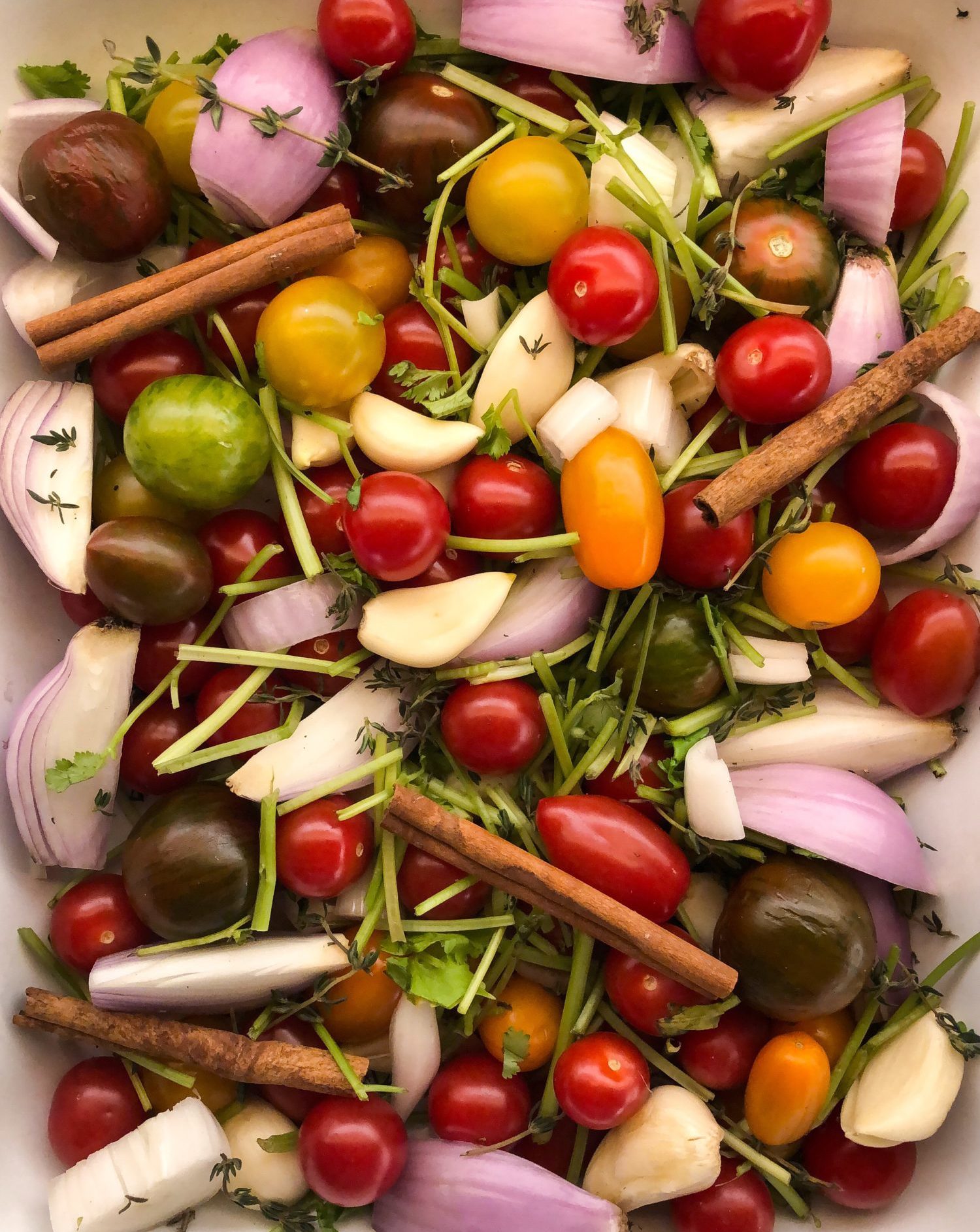 2. Arrange the tomatoes, garlic, shallots, cilantro stems, thyme and cinnamon sticks in a large high sided casserole or baking dish. (it should be about 8×12 iches or 20 x 30 cm)