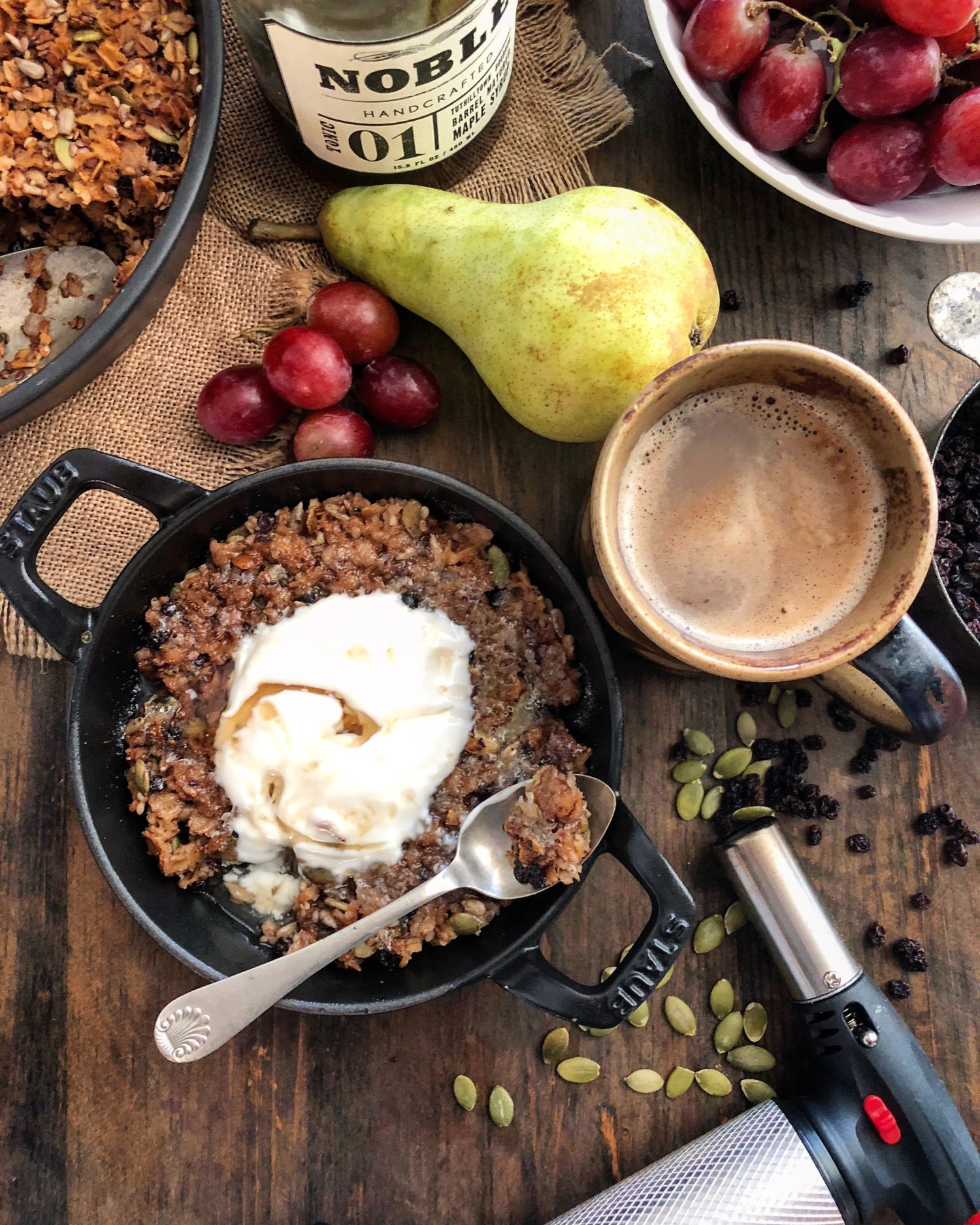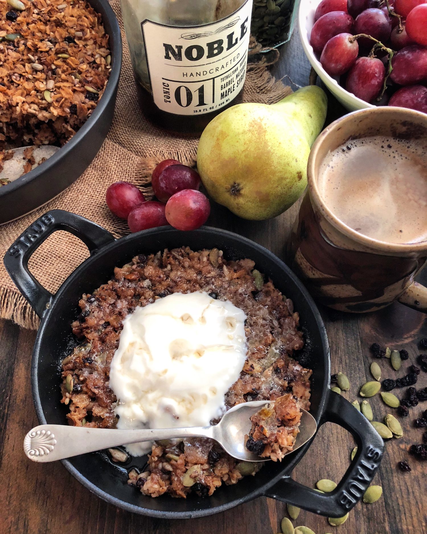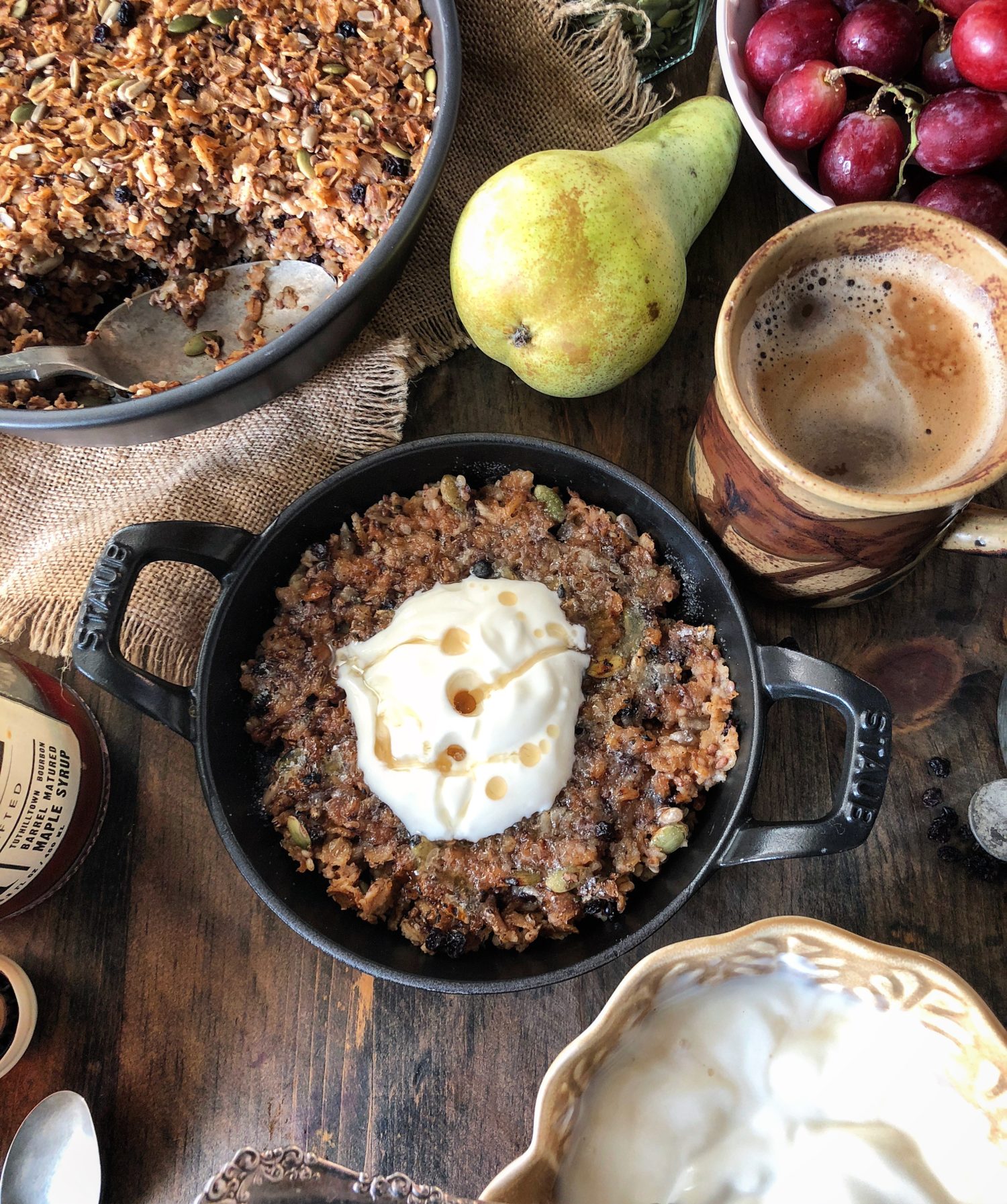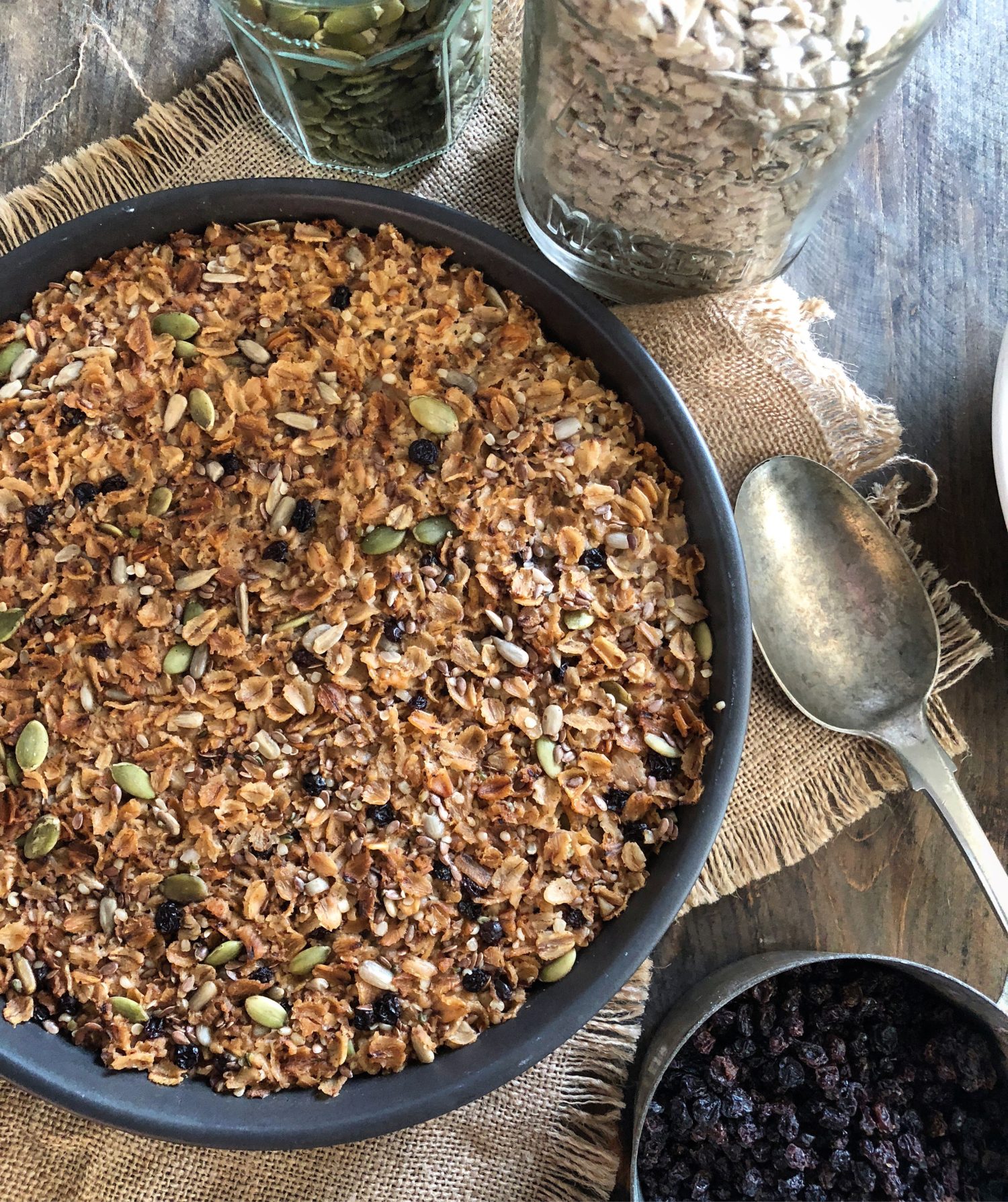 Oatmeal is first toasted in the oven, which gives it a fabulous nuttiness. Then after a quick stove top soak in water, seeds and dried currants are added, and everything is put into a baking dish and baked till perfectly cooked through. Sugar is added to create a crème brûlée top. Just add maple syrup infused skyr or yogurt, and you have a fabulous cold weather brunch!