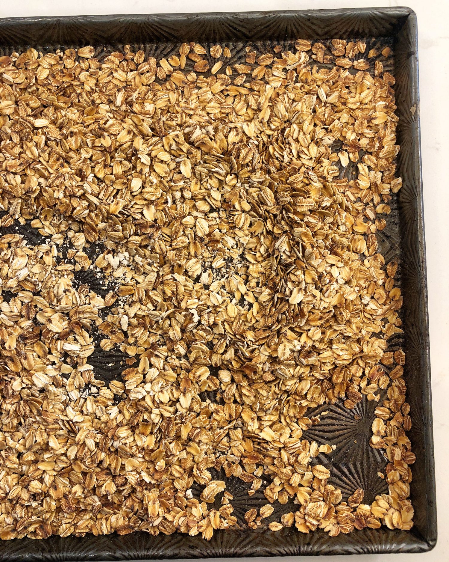 - Place the oats on a baking sheet and bake, stirring occasionally till they smell toasty and are golden brown. About 10 minutes. Keep the oven on.