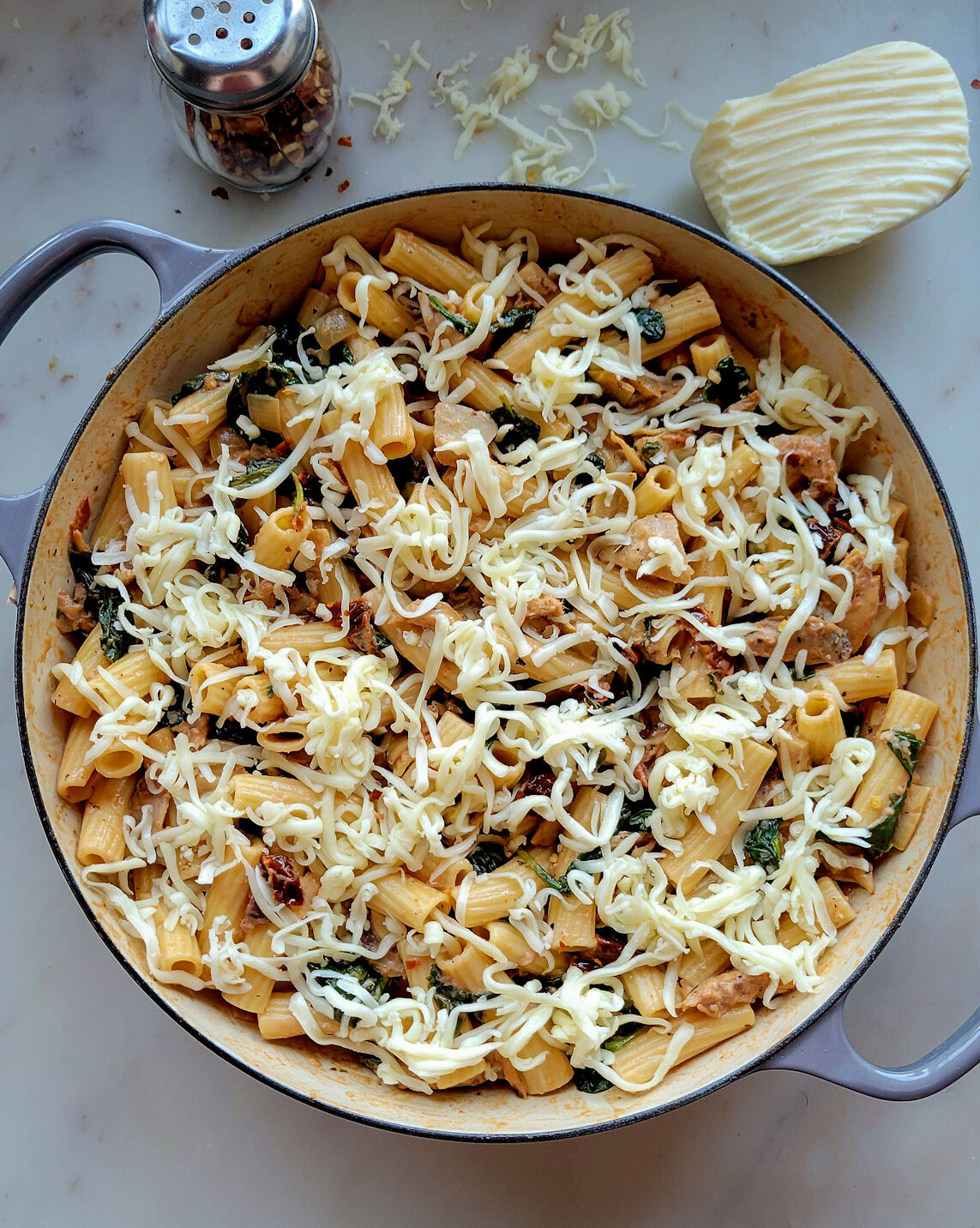 Baked Tuscan Pasta in a skillet, covered with shredded mozzarella ready to go into the oven.