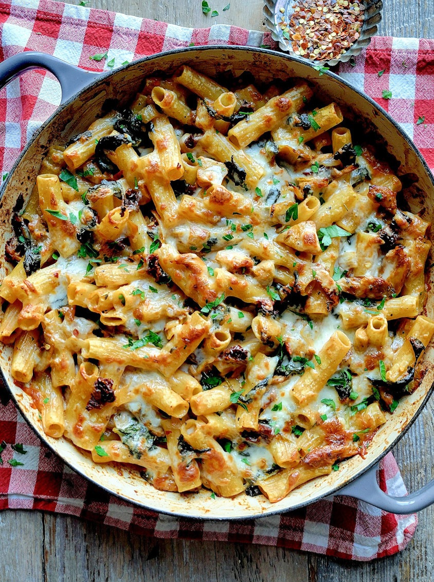 A skillet filled with Baked Tuscan Pasta fresh out of the oven, the cheesy top all gooey on top sits on the counter.