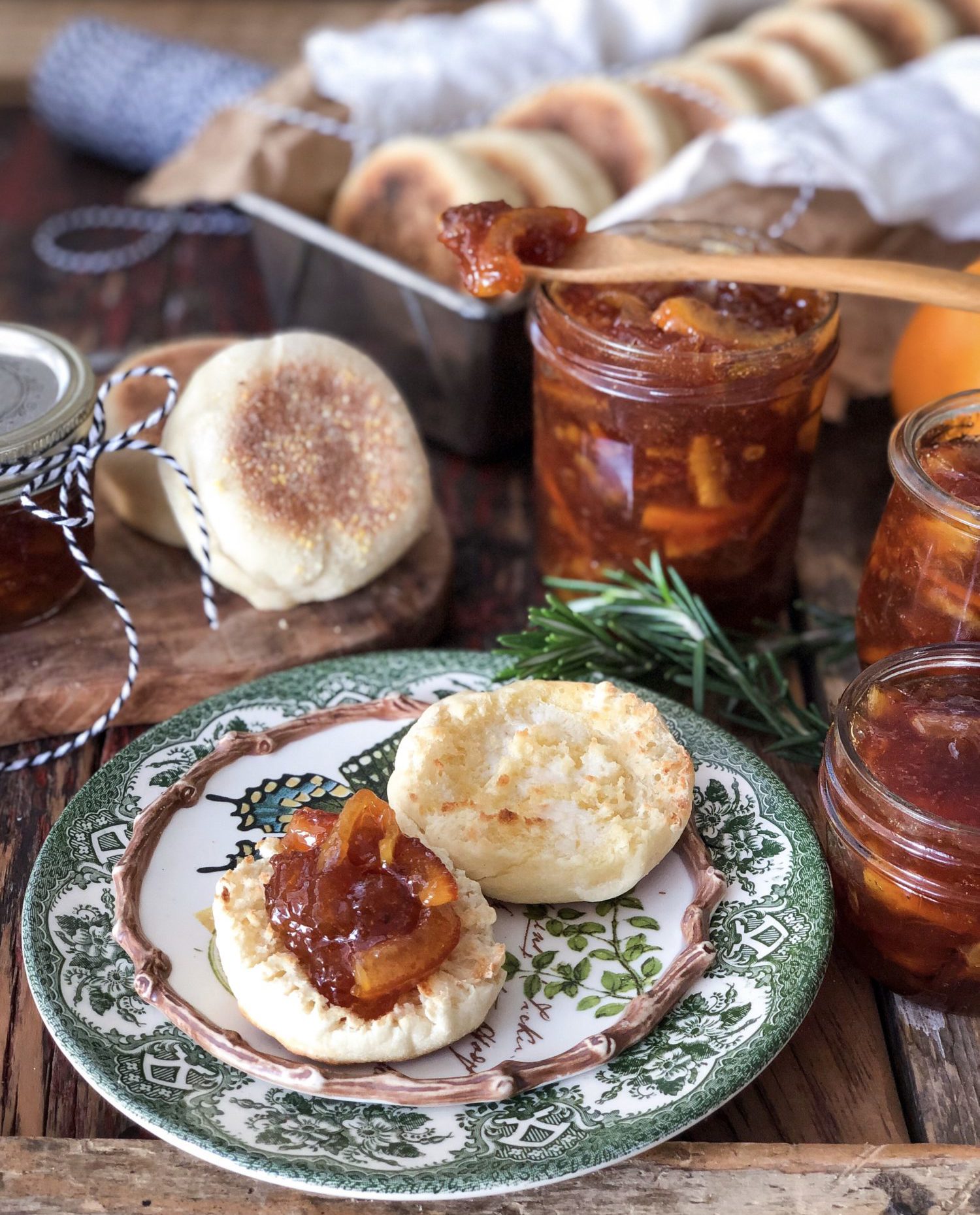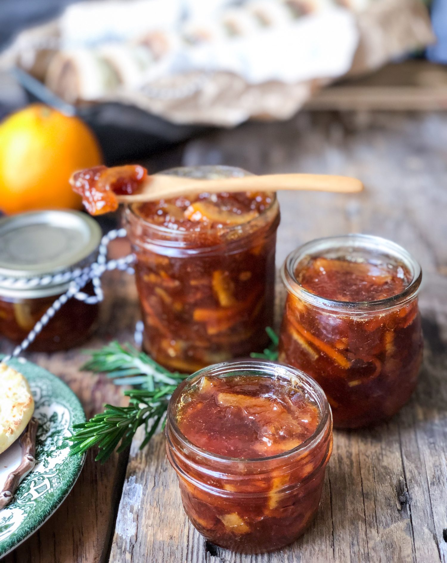 A wonderfully savoury scented preserve, using vibrant blood oranges.  This will be a great addition to your breakfast table, or cheeseboard, or even as a glaze for a roast chicken!