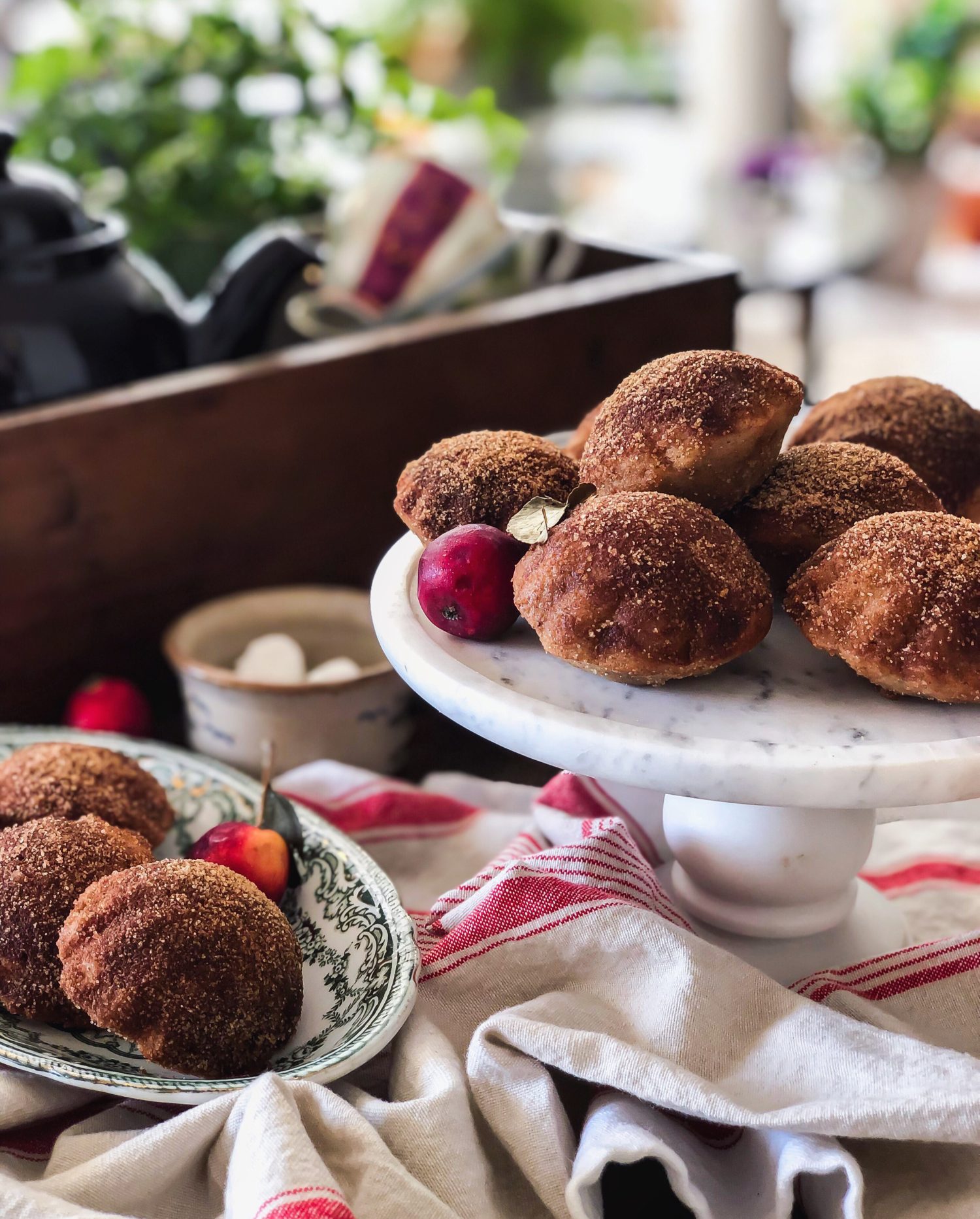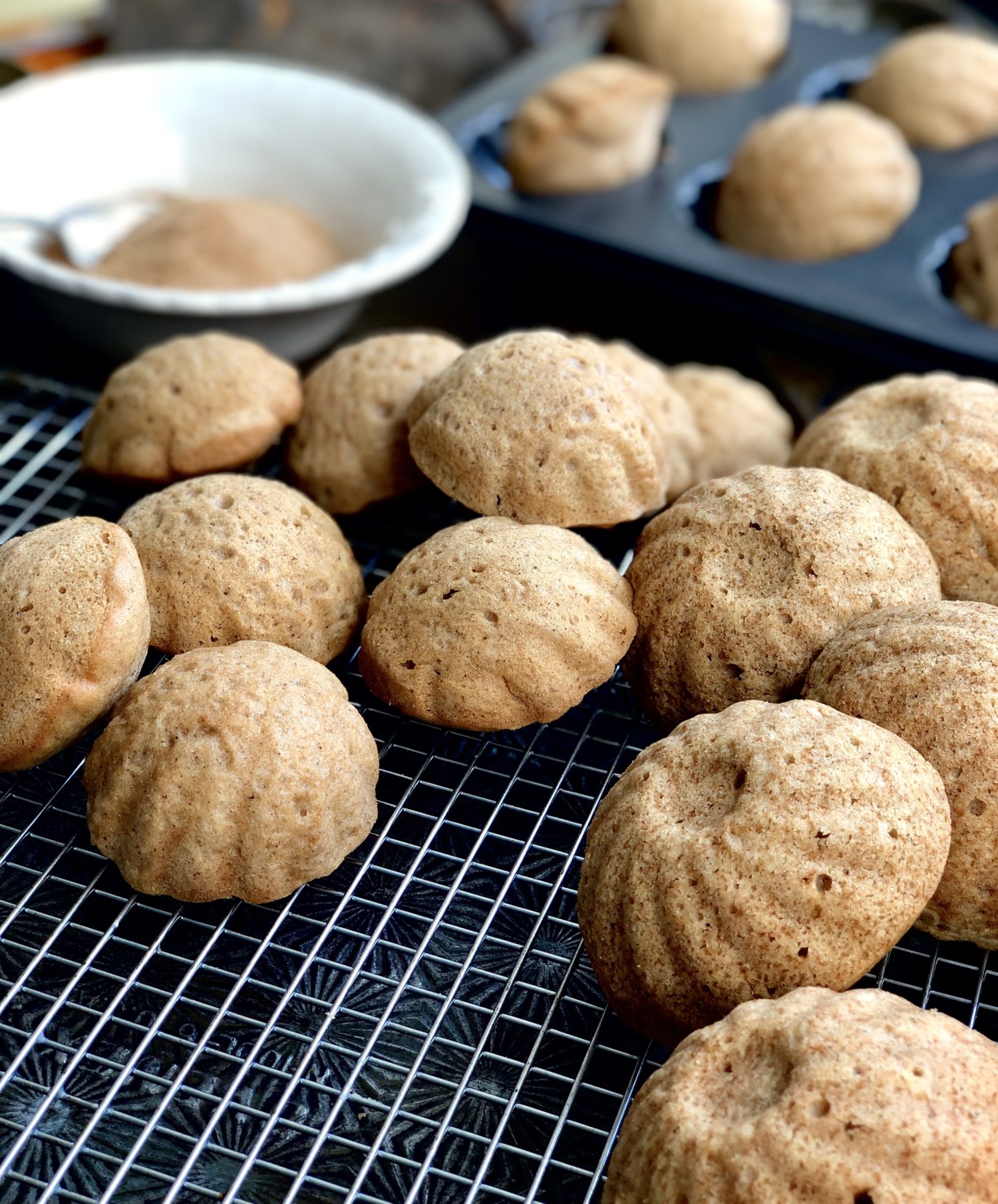 So I made the whole recipe. And froze half of the little darlings. I did this before adding the butter, and cinnamon sugar. Then after defrosting, I warmed them through in a 325F oven till warm. And finished them off. They were as tender as the fresh batch a couple of days earlier. You can also rewarm any sugared ‘cakelets’ the next day in a toaster oven for a few minutes to bring back the fluffy interior.