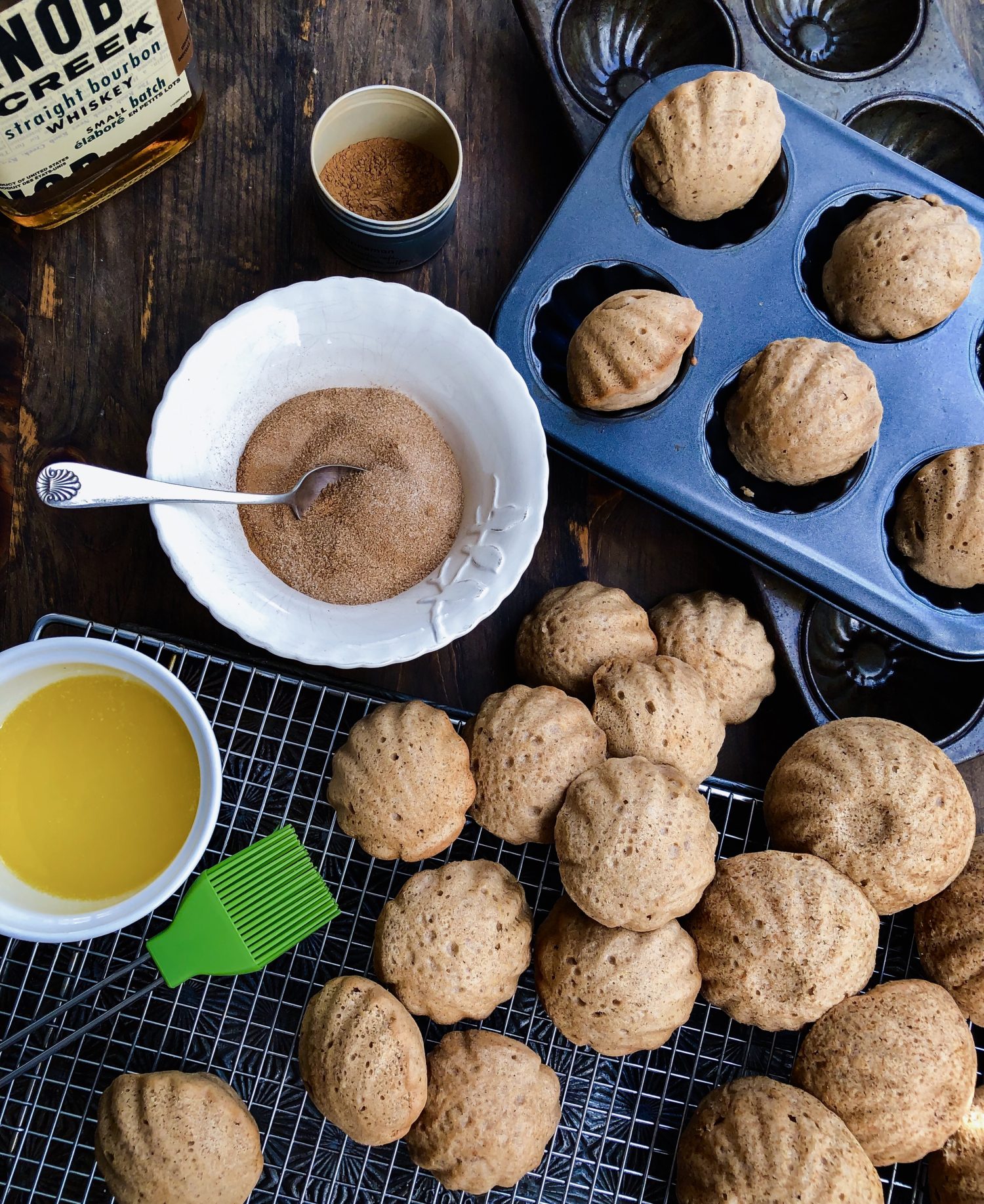 The best part of this recipe, is that you can bake up the batter in just about anything you want: mini bundt pans, baked donut pan, muffin tin, even a madeleine pan, as I did. You could drizzle them with caramel or top them with a cider glaze. And either option would be amazing. But I decided to stick to the recipe for this part. Brush the baked donuts with melted butter and sprinkle with cinnamon sugar. This really gives them that donut appeal.