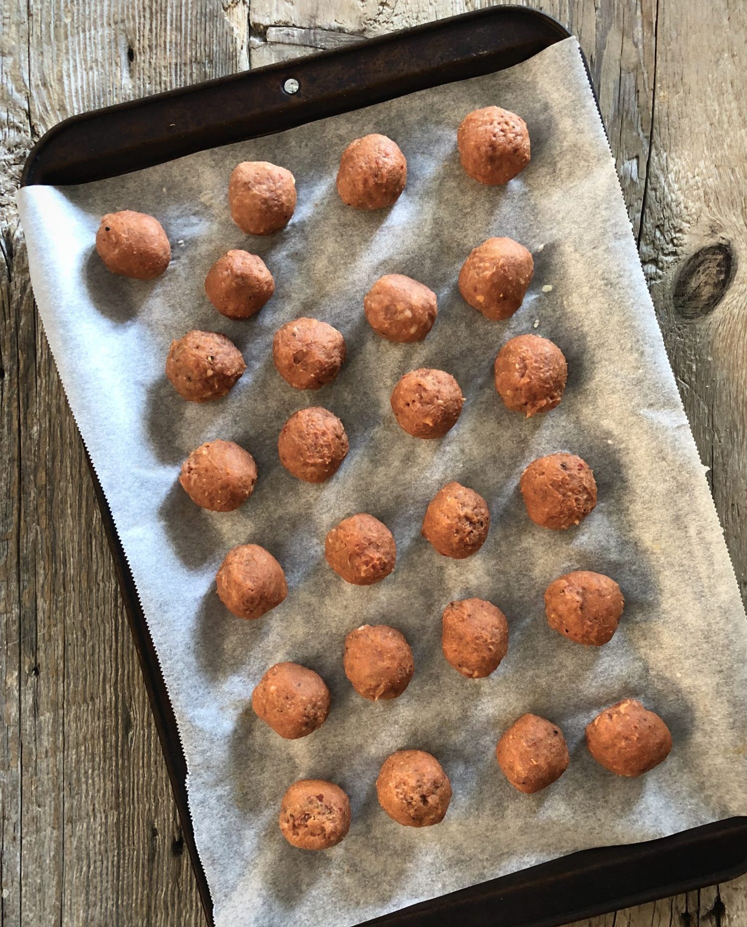 4. With dampened hands, roll each section into a ball. Place each onto a parchment lined baking sheet. Once it is filled, place it into the freezer to freeze the meatballs. From this point you can freeze them all, use them all, or a bit of both. You will want 5 or so meatballs per person.