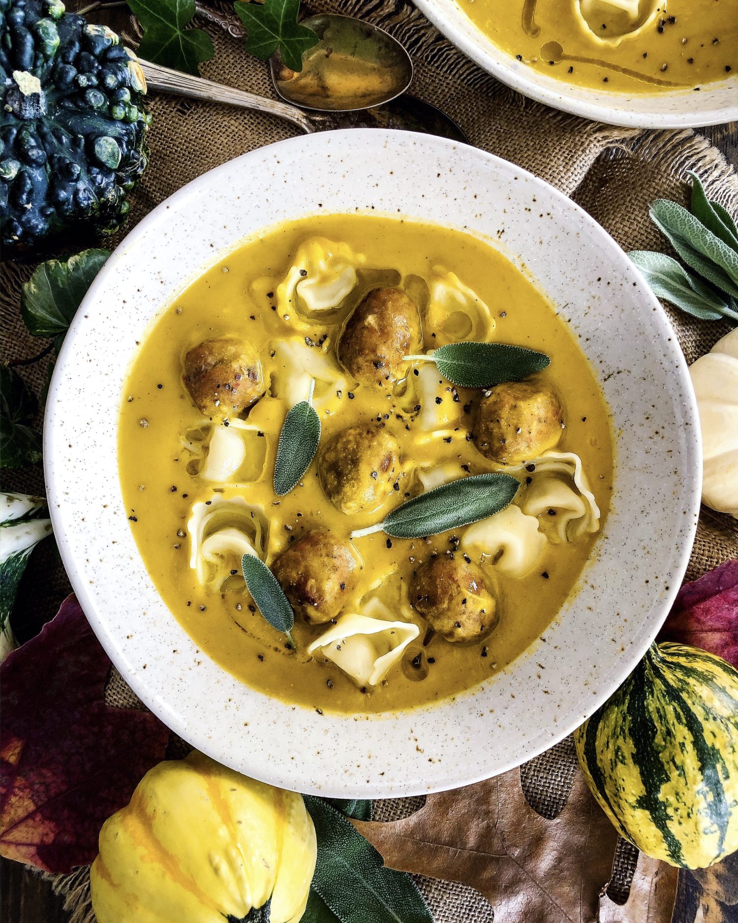 Butternut Squash Soup with Turkey Meatballs and Tortellini