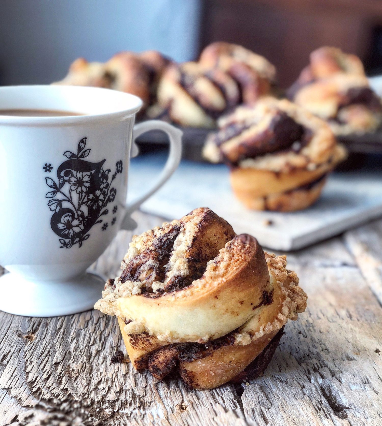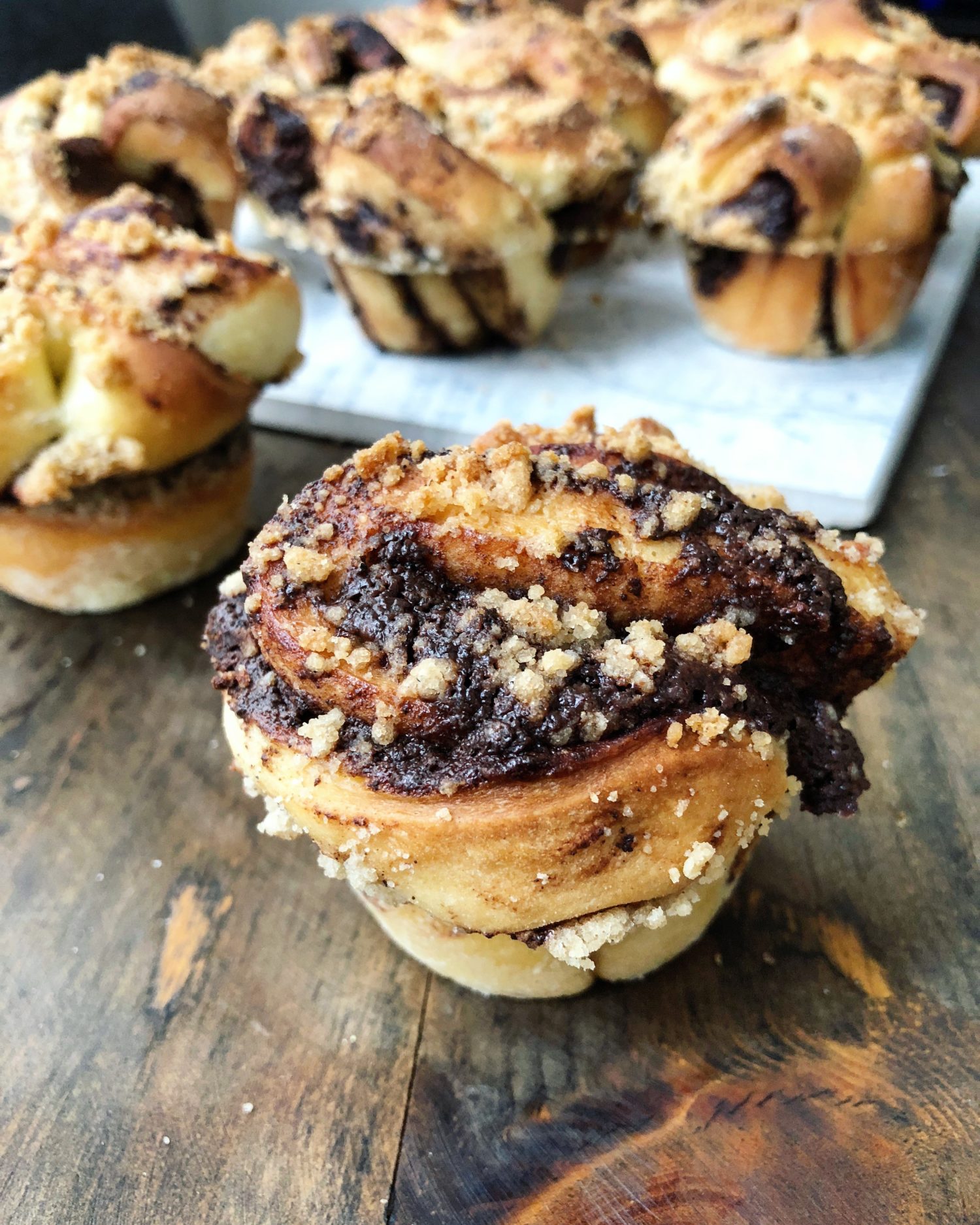 All the goodness of the airy yeasty layers in a babka loaf, but in a muffin.  Add some espresso and cocoa nibs to the filling, and this can be breakfast, or even dessert with a good cup of coffee!