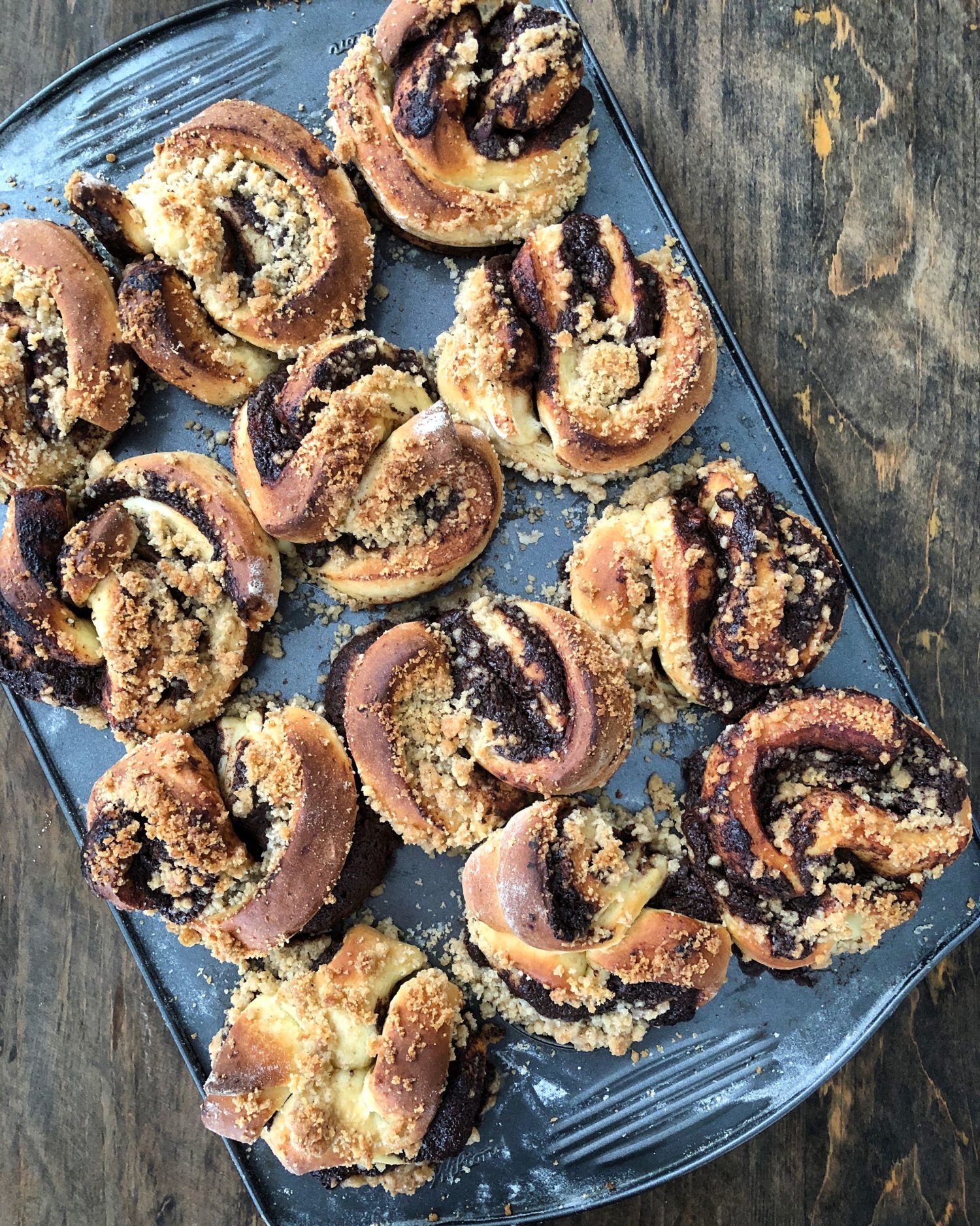 It all starts with a yeast challah type dough made with butter, which is proofed, and then rolled out into a large rectangle.  The filling gets spread over the entire sheet of dough.  But… instead of rolling it, like for cinnamon rolls, it gets folded like a letter, three times. So that it looks like a really flat cinnamon roll log.  The entire log gets cut into short strips.  Then two strips are squished and wrapped around each other and then squished into a prepared muffin tin. This gets repeated till the muffin tin is filled. Streusel topping is scattered over them all. A bit more proofing, and then they get baked off.  And the aroma coming out of the oven is so dreamy!