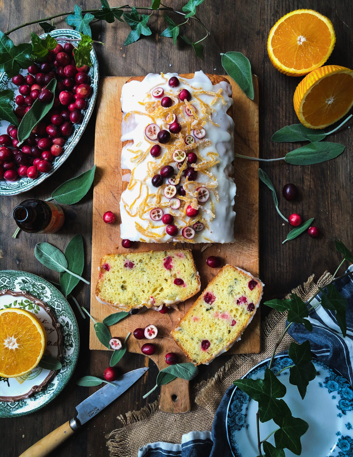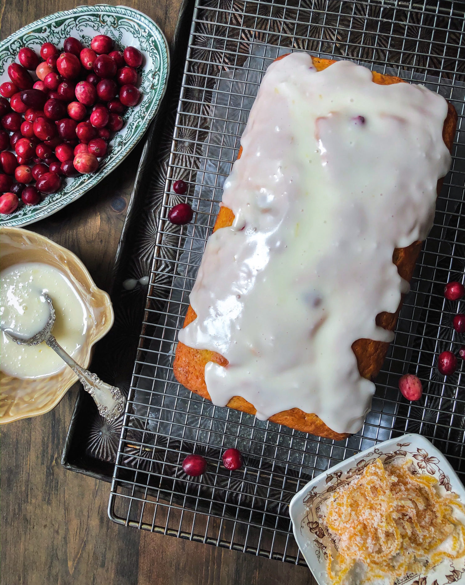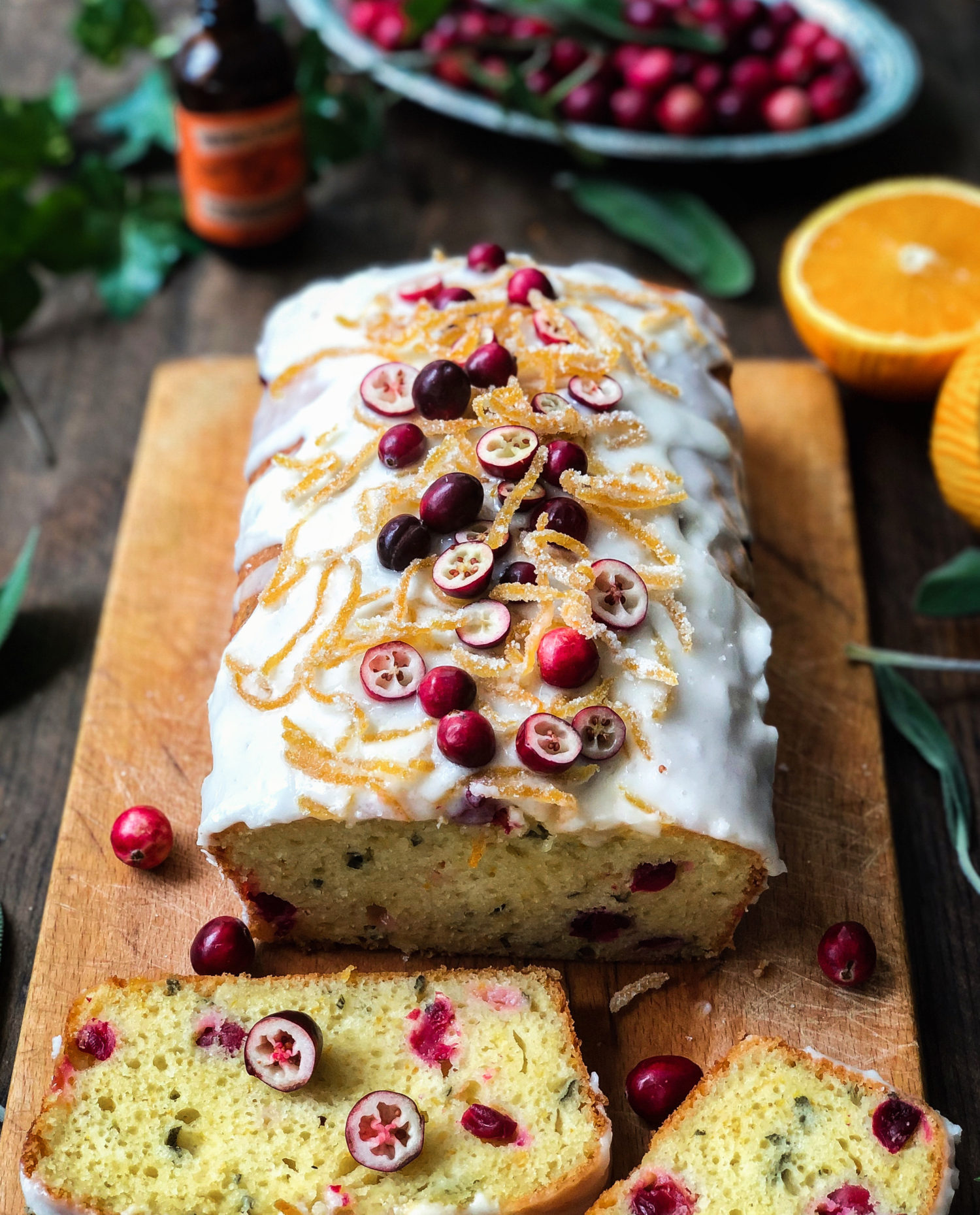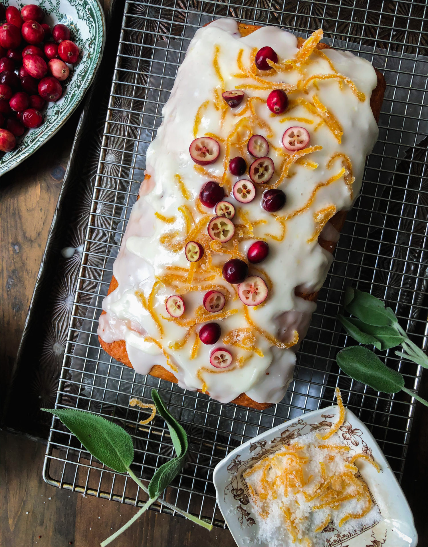 A fun garnish is slicing the cranberries in half, revealing their inner hollow air chambers. Sprinkle these onto the glaze along with the candied orange peel, and let the glaze completely set before slicing into the cake. I keep calling it a cake. Is it a cake or is it a loaf? Does it matter?!
