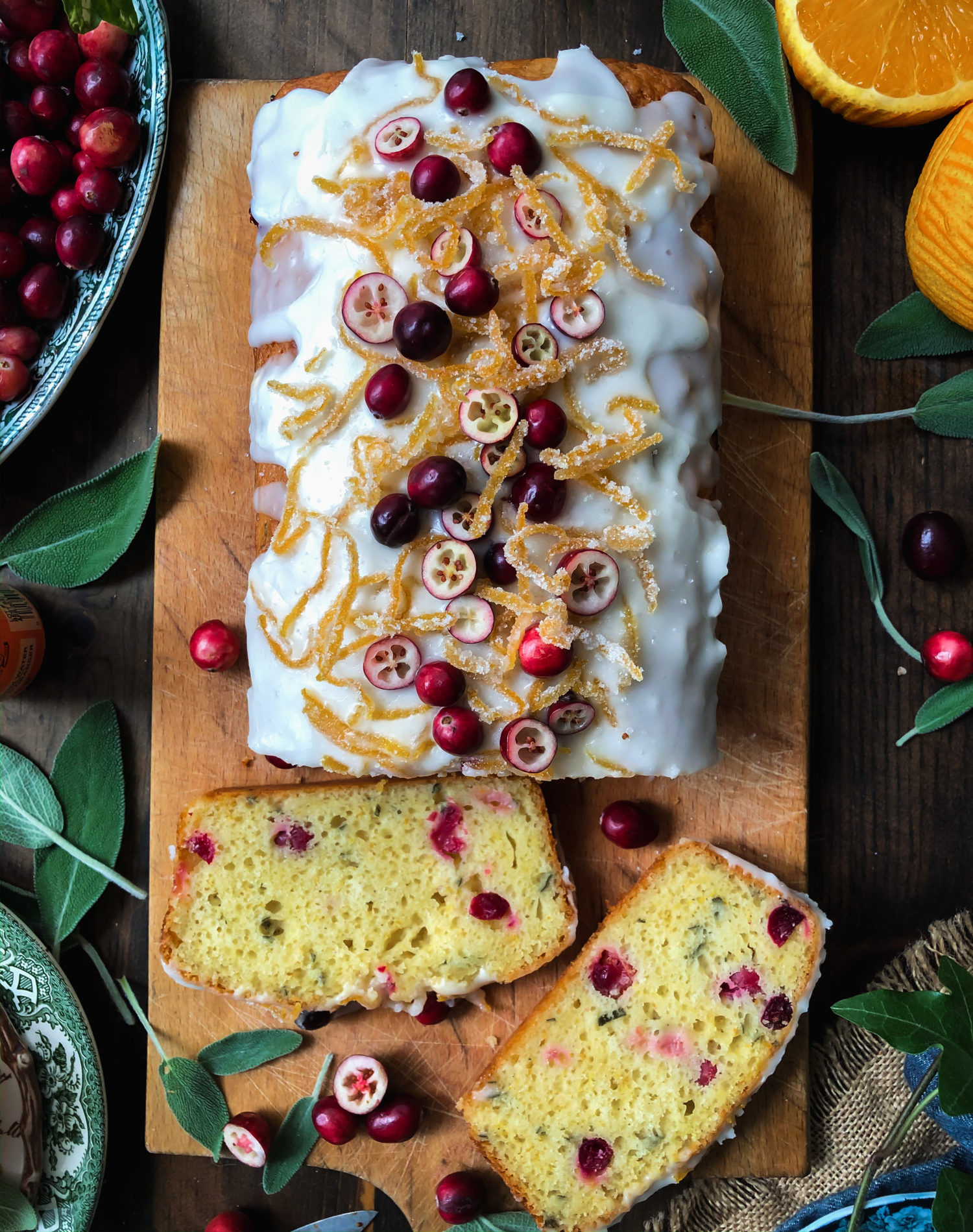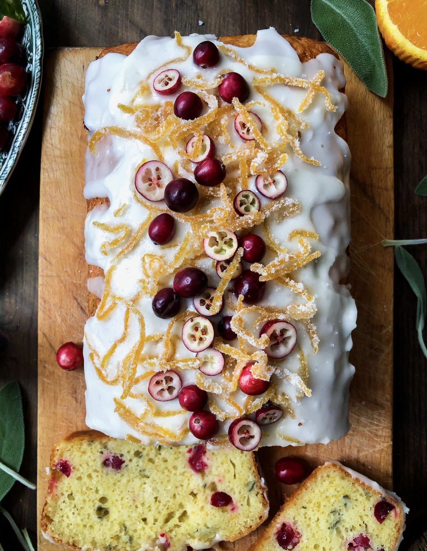 A moist, tender orange scented cake is the base for fresh cranberries and chopped sage. Orange also shows up as candied ribbons for a garnish. This will take you from breakfast to afternoon breaks.