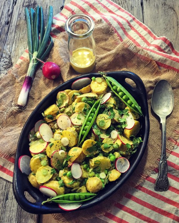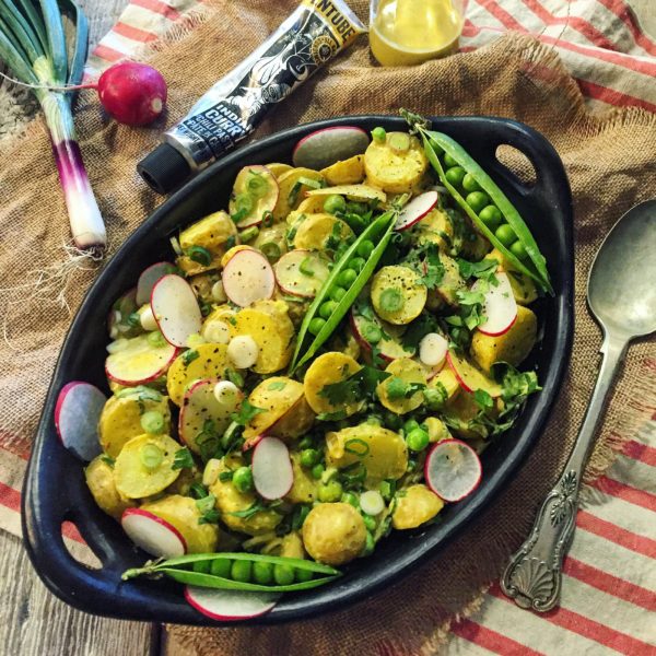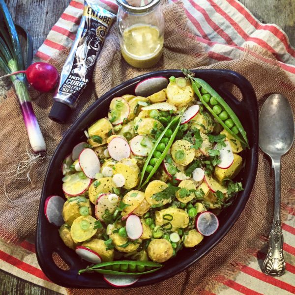 But I am such a renegade and now I say, “Potato Salad for All, All Year Round!” Especially this potato salad. It has all the freshness of summer, with freshly shelled peas, radishes, and spring onions. And it has the warmth and creaminess of a good plate of ‘Aloo Gobi’, minus the Gobi. For my non Indian cuisine aficionados, this is a lovely curried potato and cauliflower dish that I could eat once a week. All year round. So this salad is really a nod to that dish, utilizing the flavours and spices, and making them ‘summer worthy’. But just as comforting in the cold days of winter.