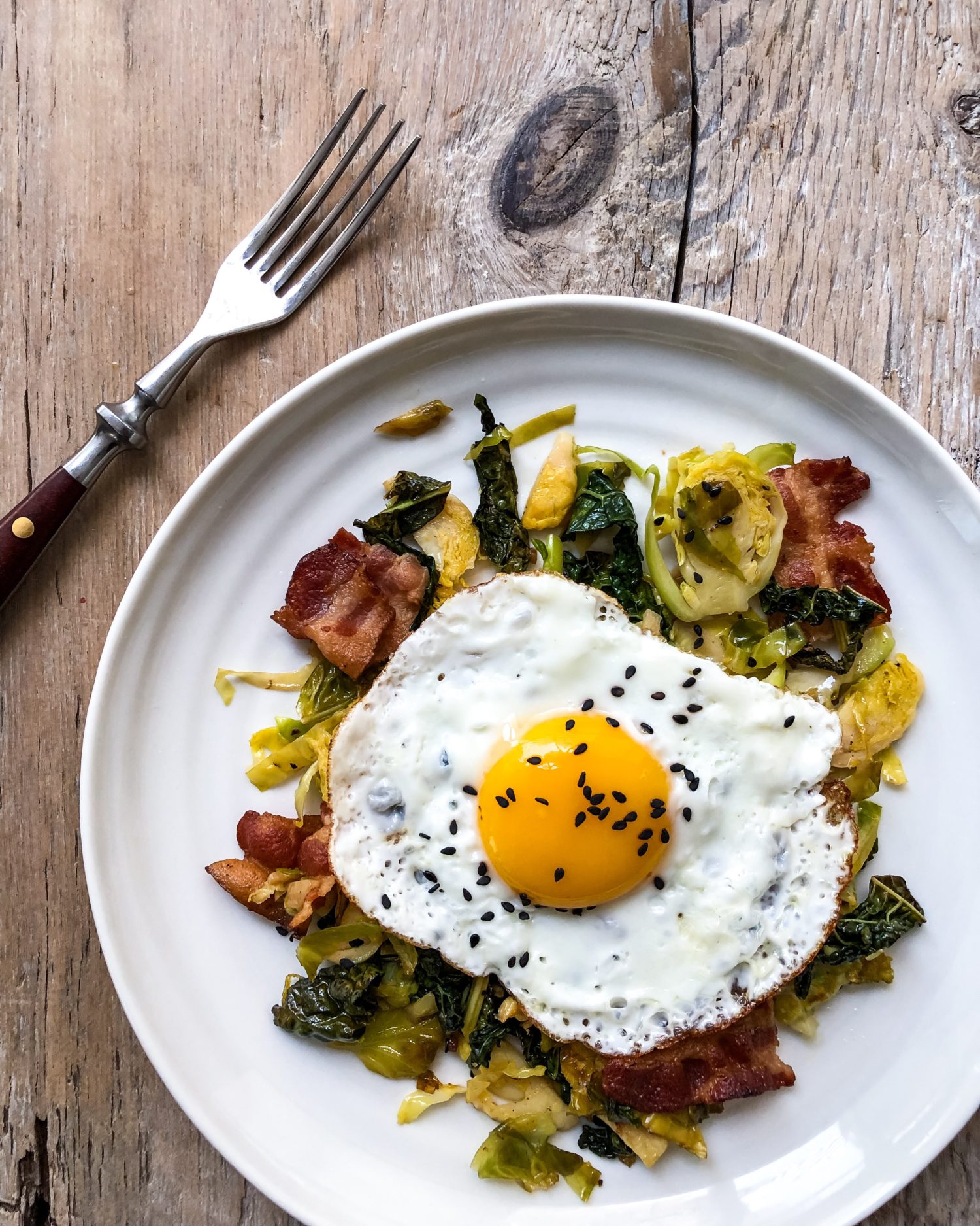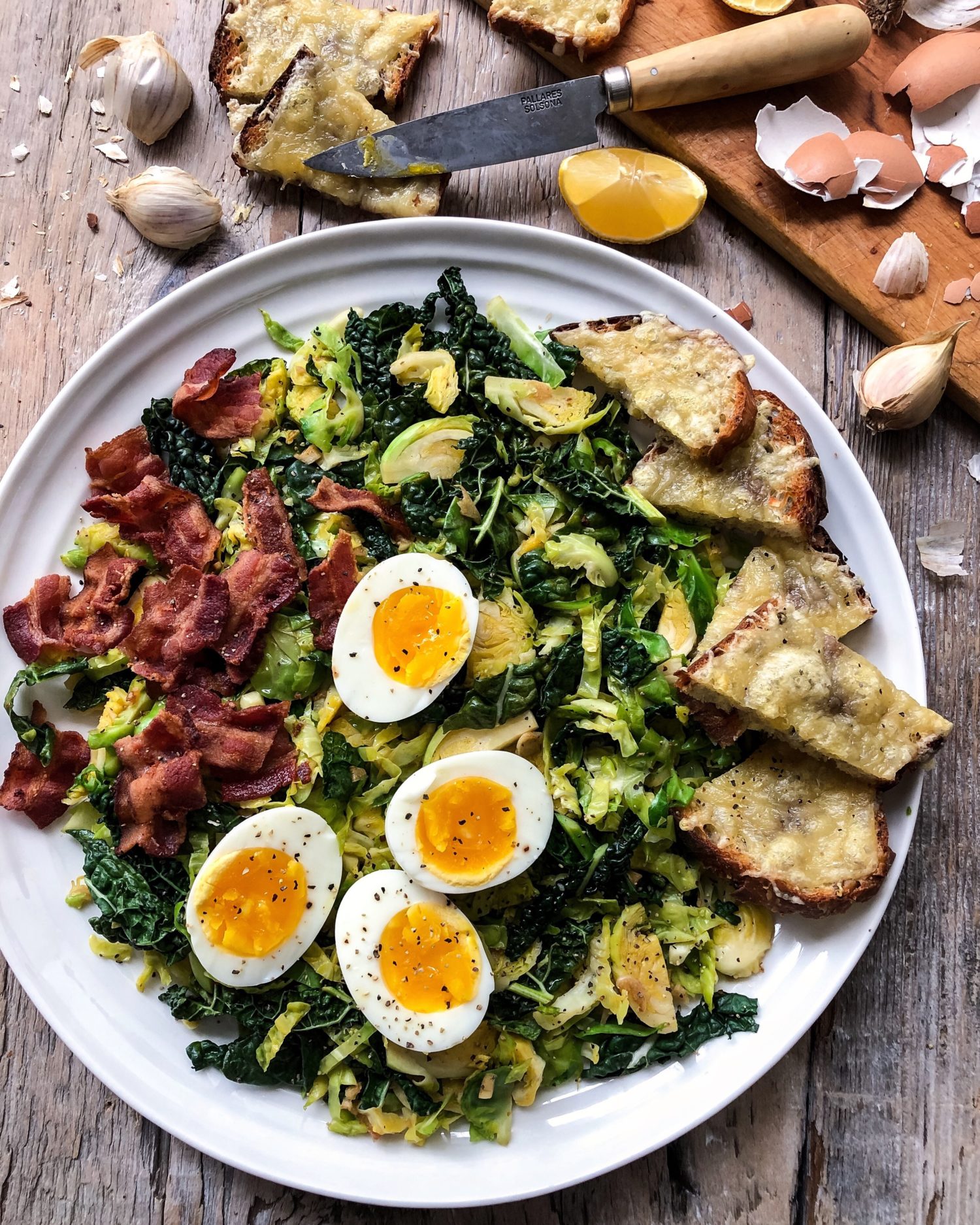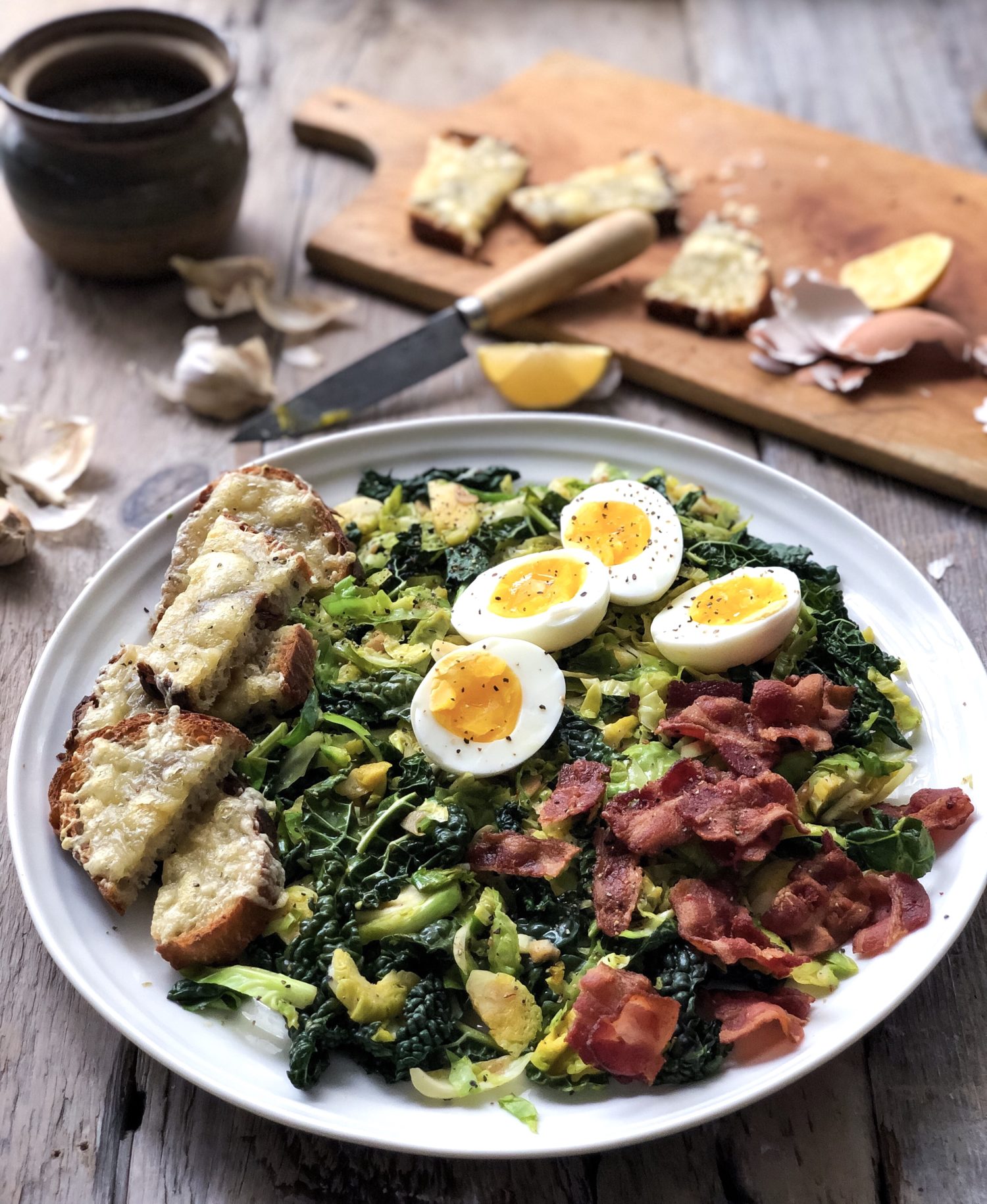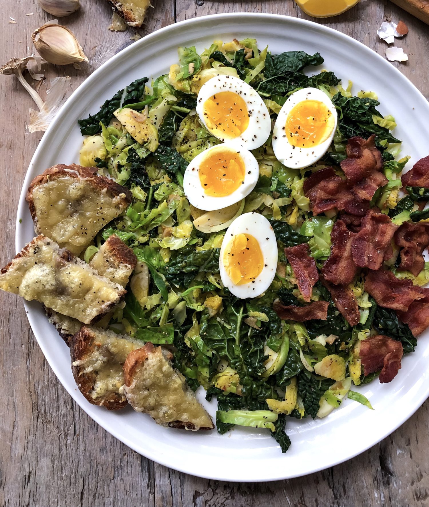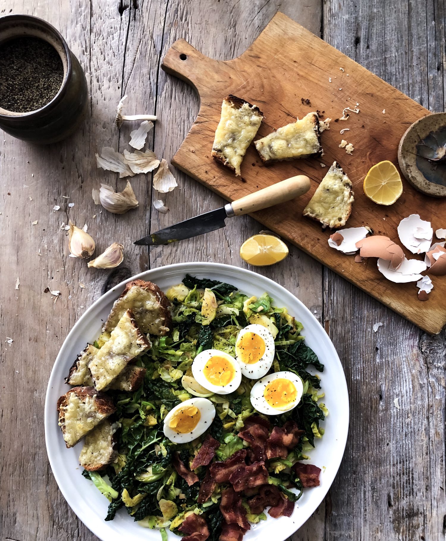 Everything that goes into a classic Caesar Salad, but in a fresh new way. The greens are lightly wilted in anchovy and garlic infused bacon fat, or olive oil. Then they get drizzled with freshly squeezed lemon juice. Add some jammy soft boiled eggs, and parmesan toasts and you’ve got a winter salad fit for Caesar himself!