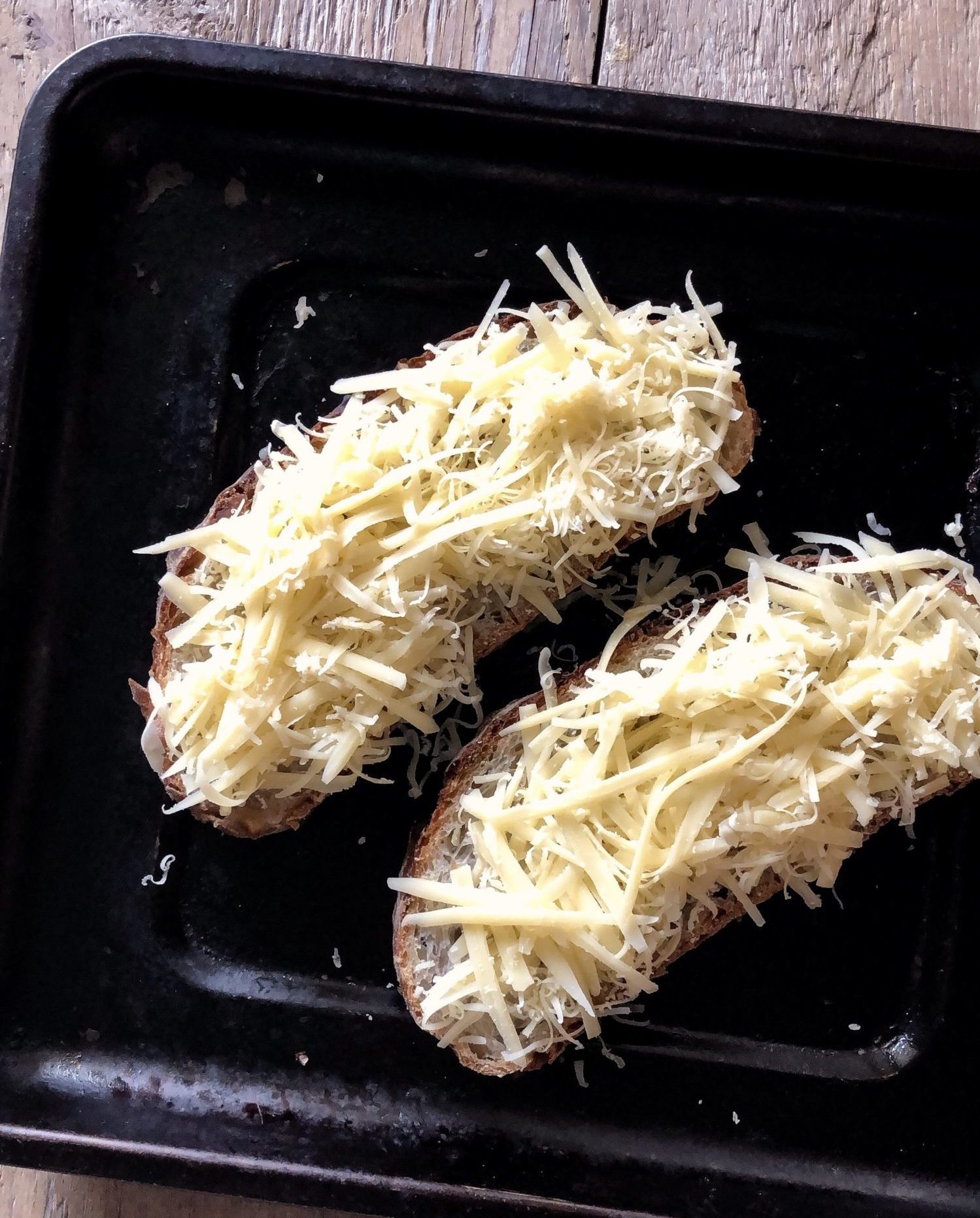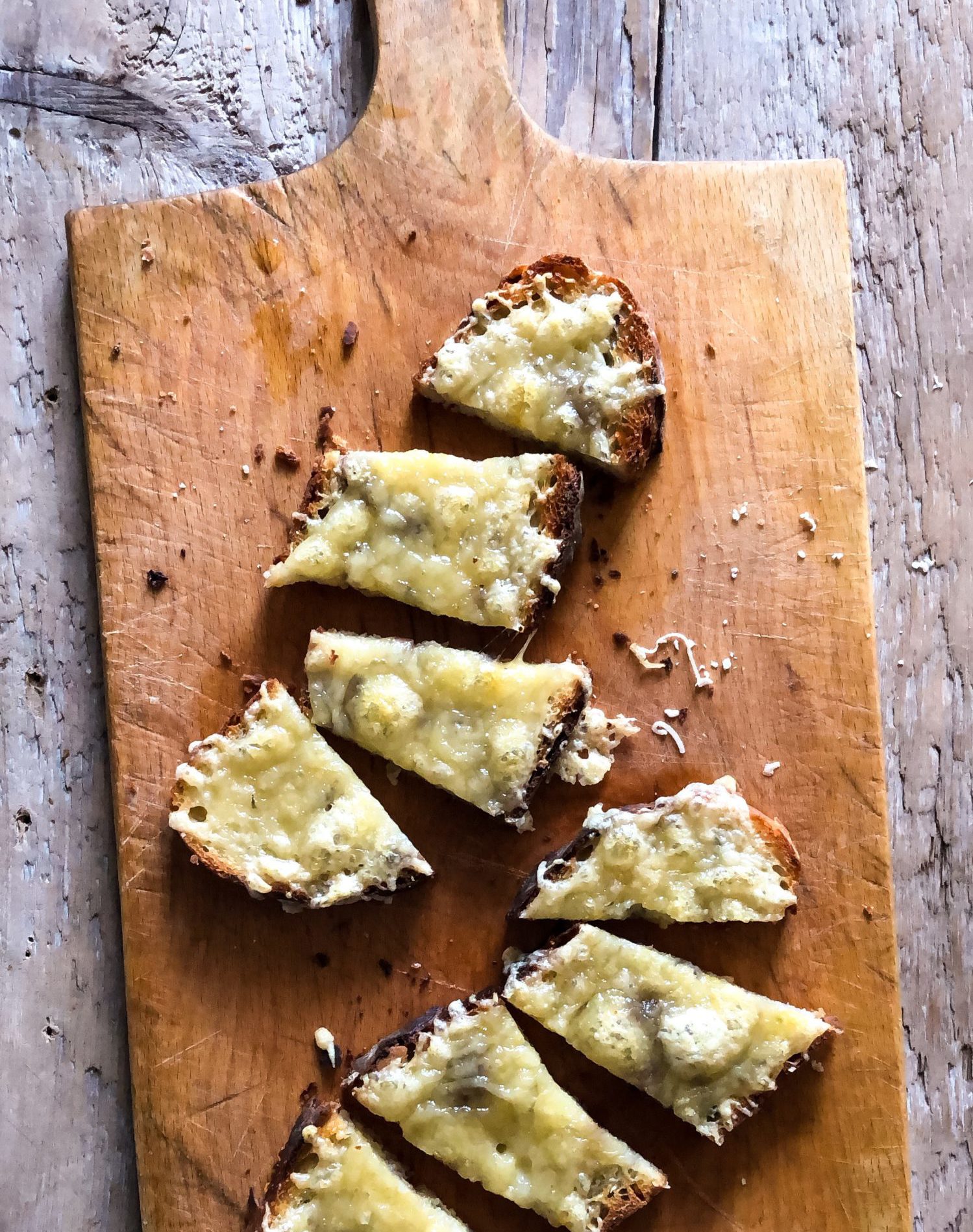 - Divide the cheeses evenly between the four slices of bread. Place under a broiler, not too close though, and cook until the cheeses are melted and bubbling. Remove and let sit for a moment before slicing into large croutons.