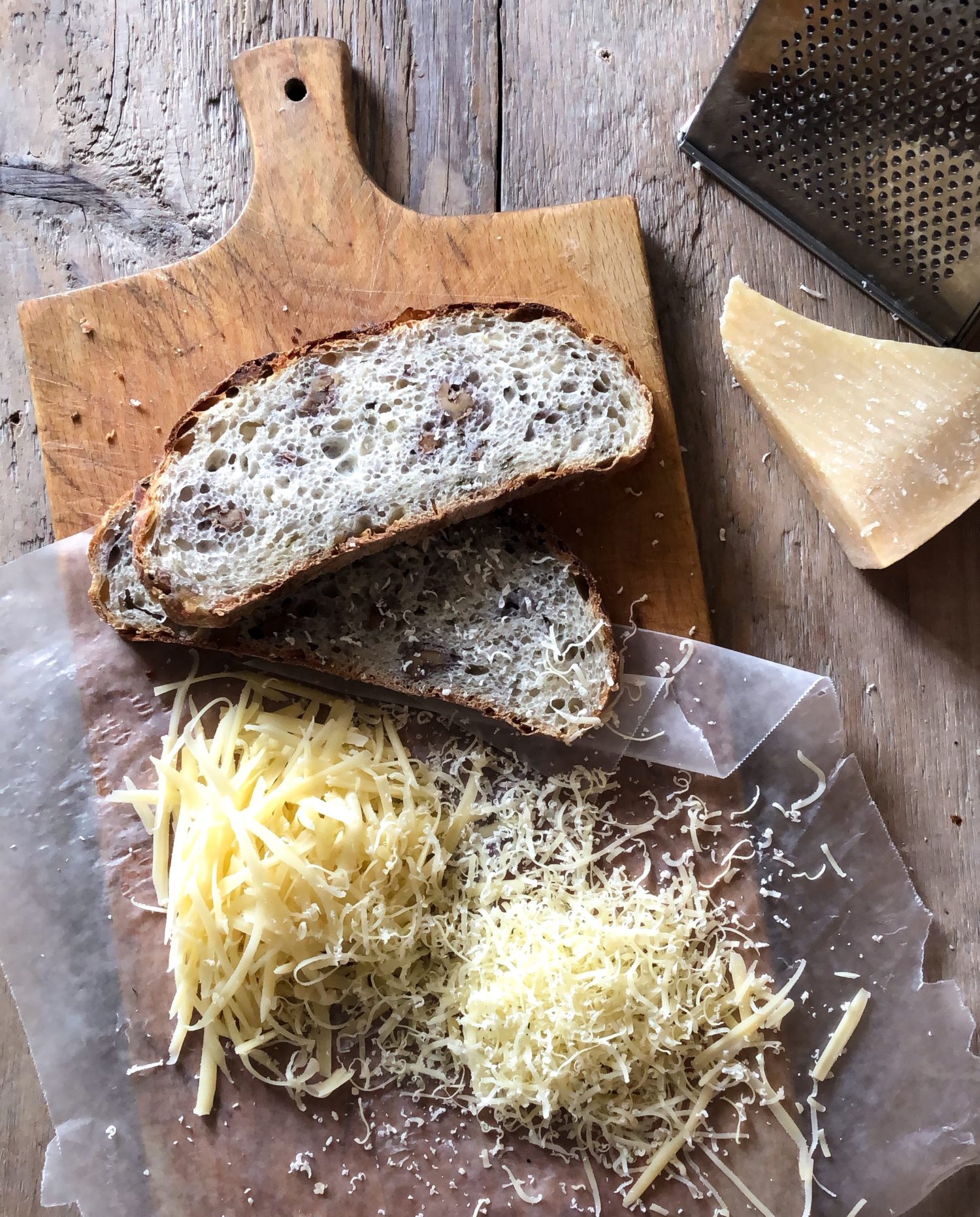 So now all I had to think about were the croutons and the parmesan cheese. And this is where I went: I would broil up some sourdough slices, covered in a goodly amount of cheese. Like really big croutons. But to get the full melty effect that cheese can offer, I would add an additional cheese. I just pulled out what was in the fridge cheese drawer. The melty cheese I had on hand was emmenthal. But gruyere, cheddar, swiss, provolone, even mozzarella would have worked. They became adulty grilled cheese toasts, on the side of the salad!