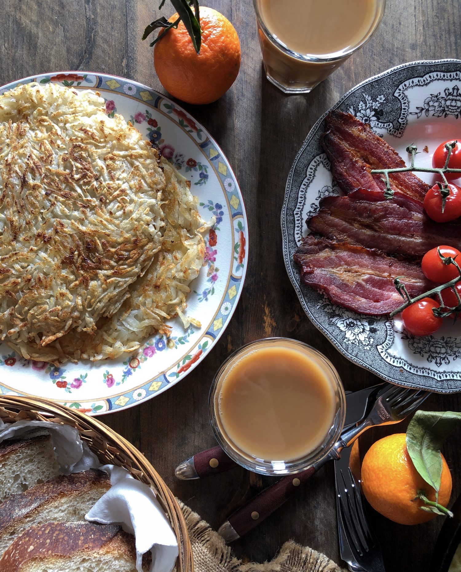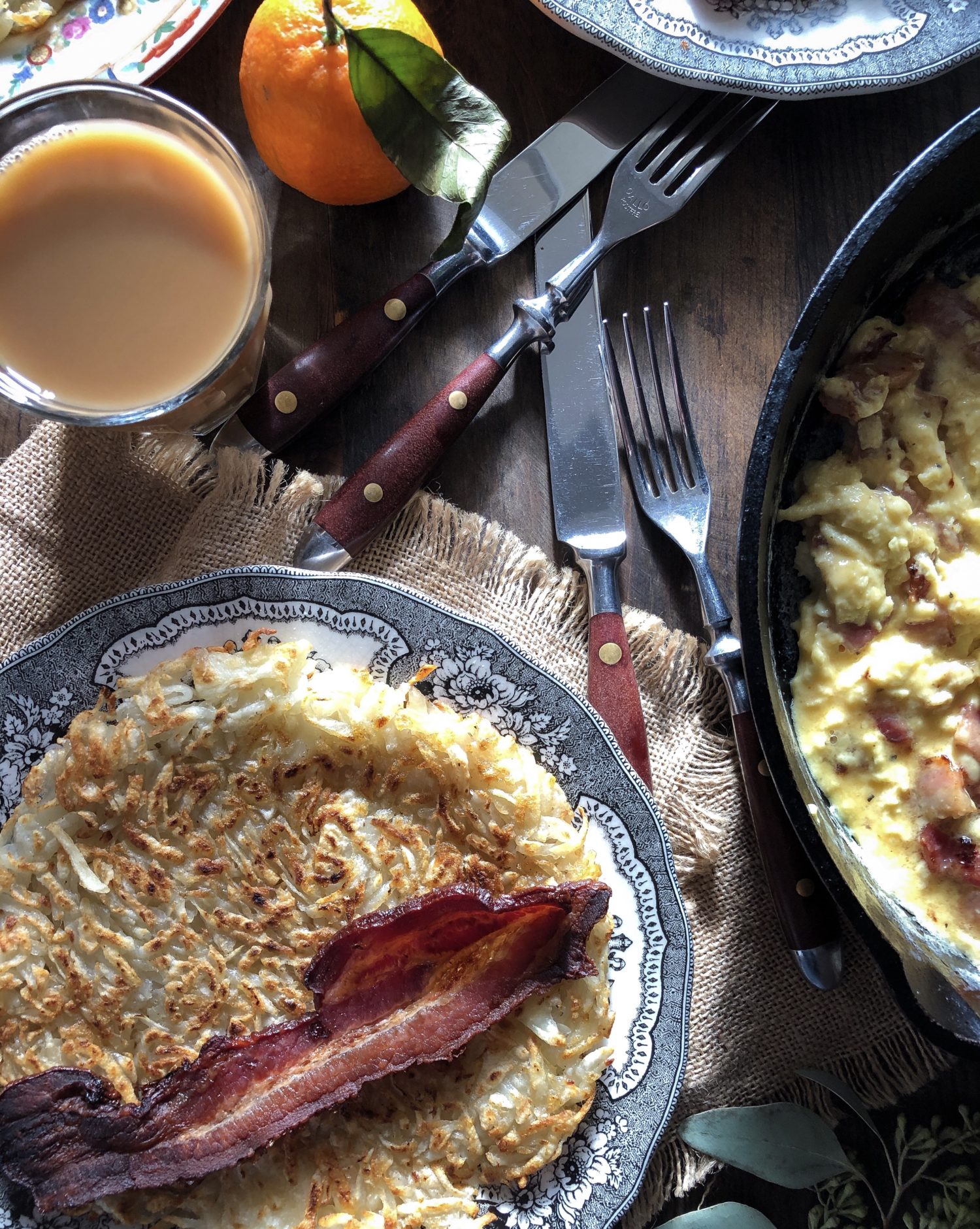 The creamiest scramble of eggs and bacon topping the crispy exterior and creamy interior of a classic potato rösti. Think shredded hash browned potatoes, but in pancake form!