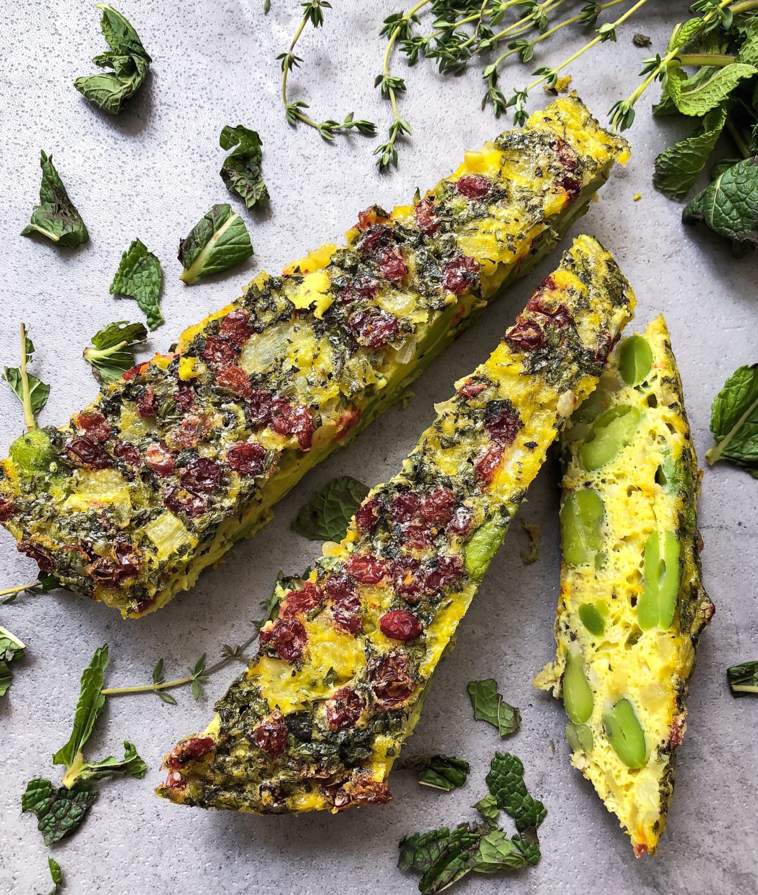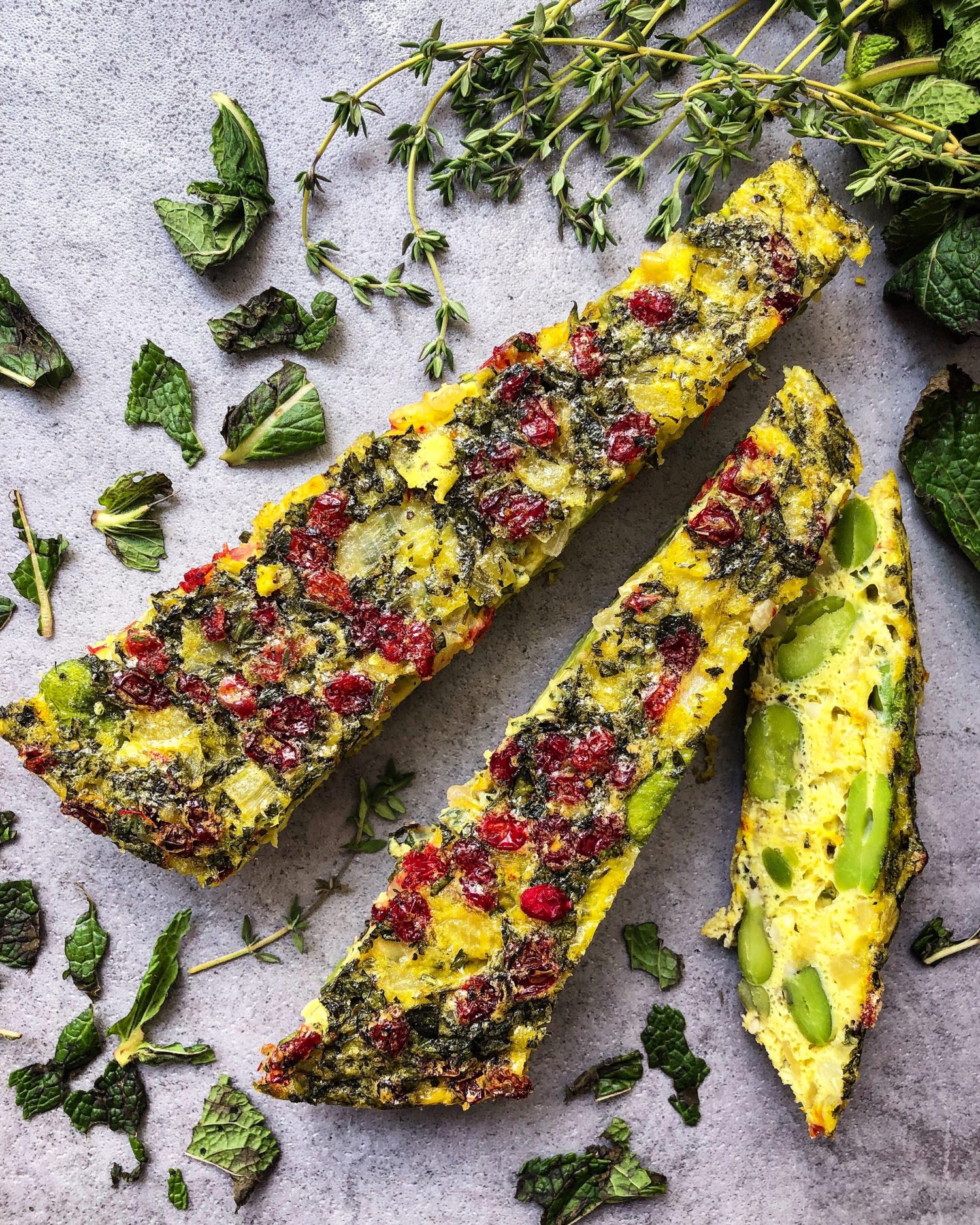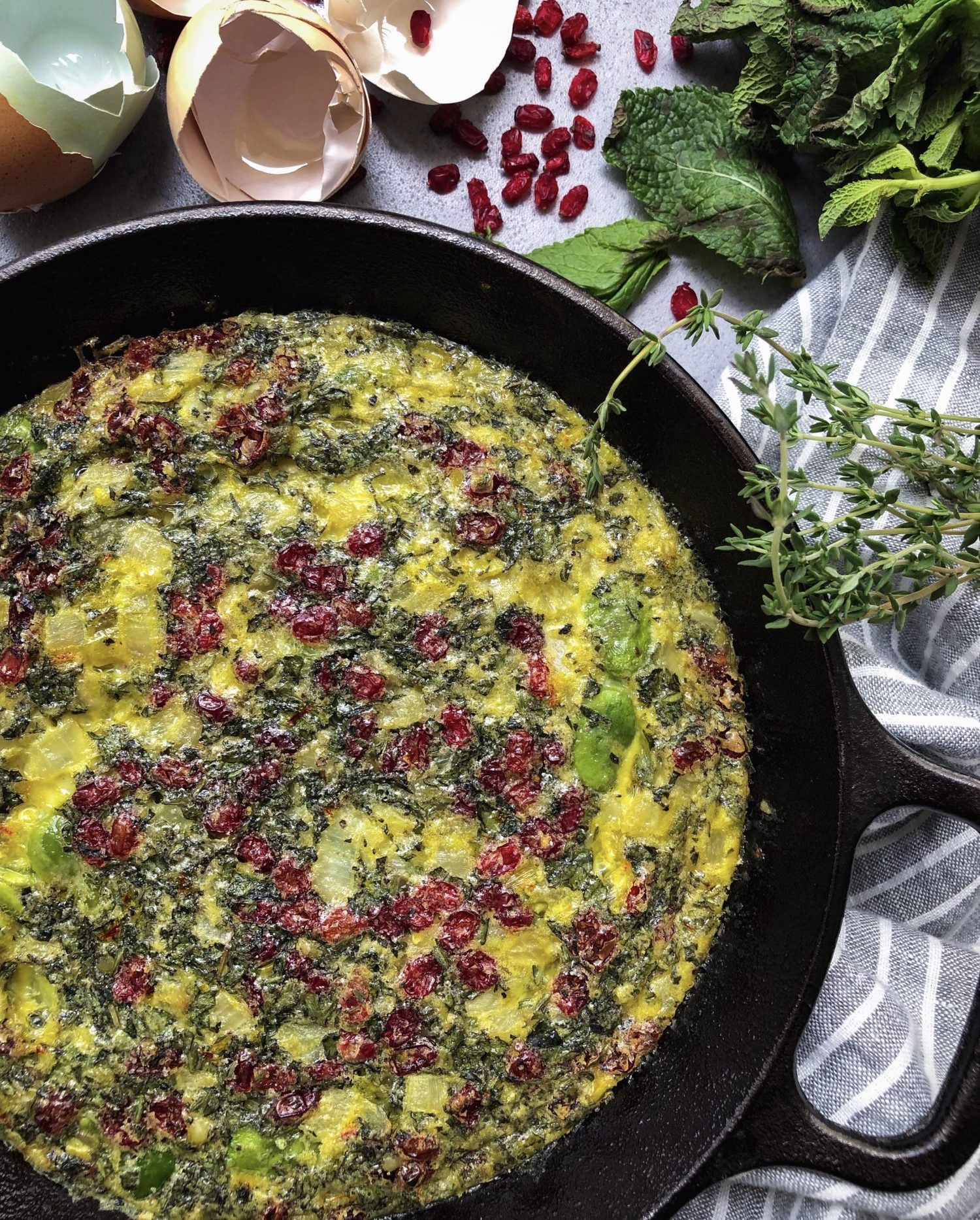 A creamy egg frittata-like dish is given the exotic treatment with bright and tart barberries, a plethora of herbs, and nutty fava beans.  This would make a great vegetarian dinner option, or sliced up, it will be a hit on your next brunch table.