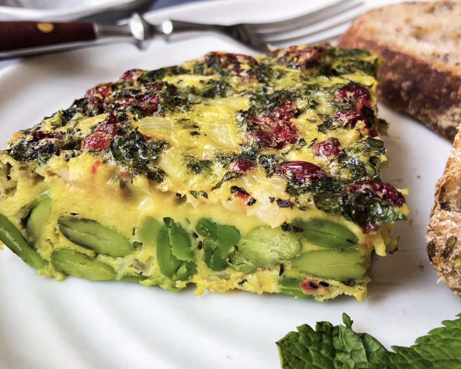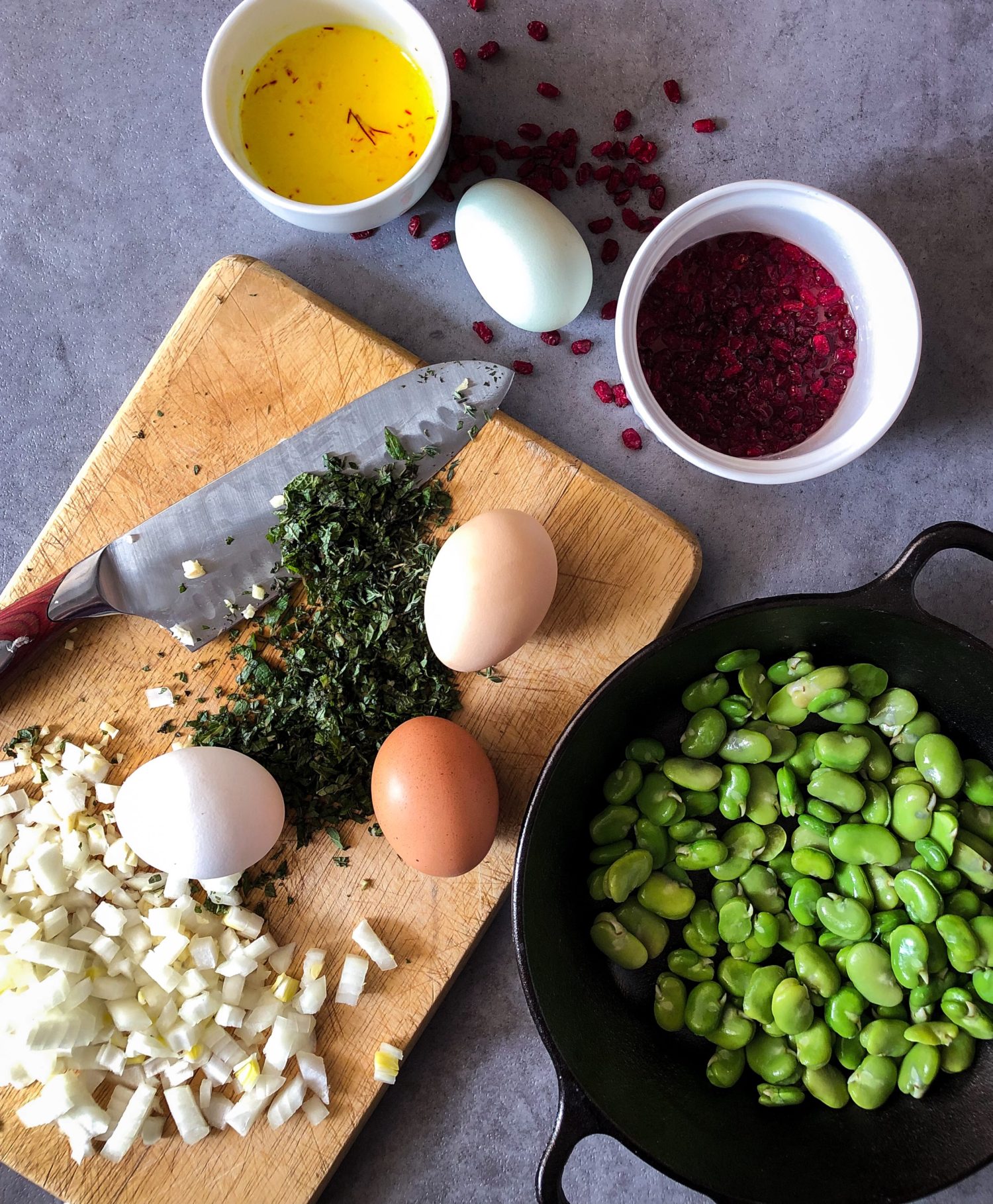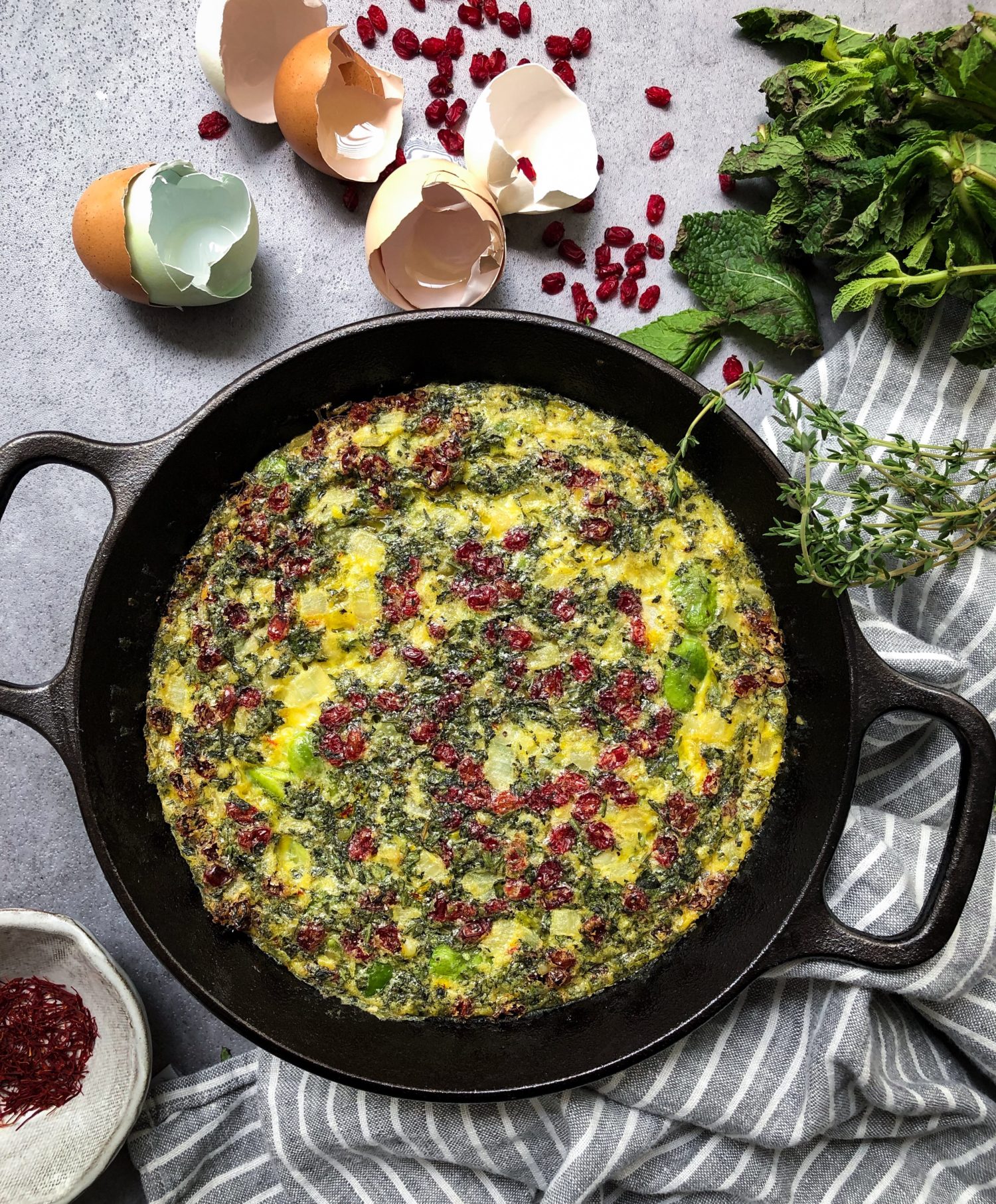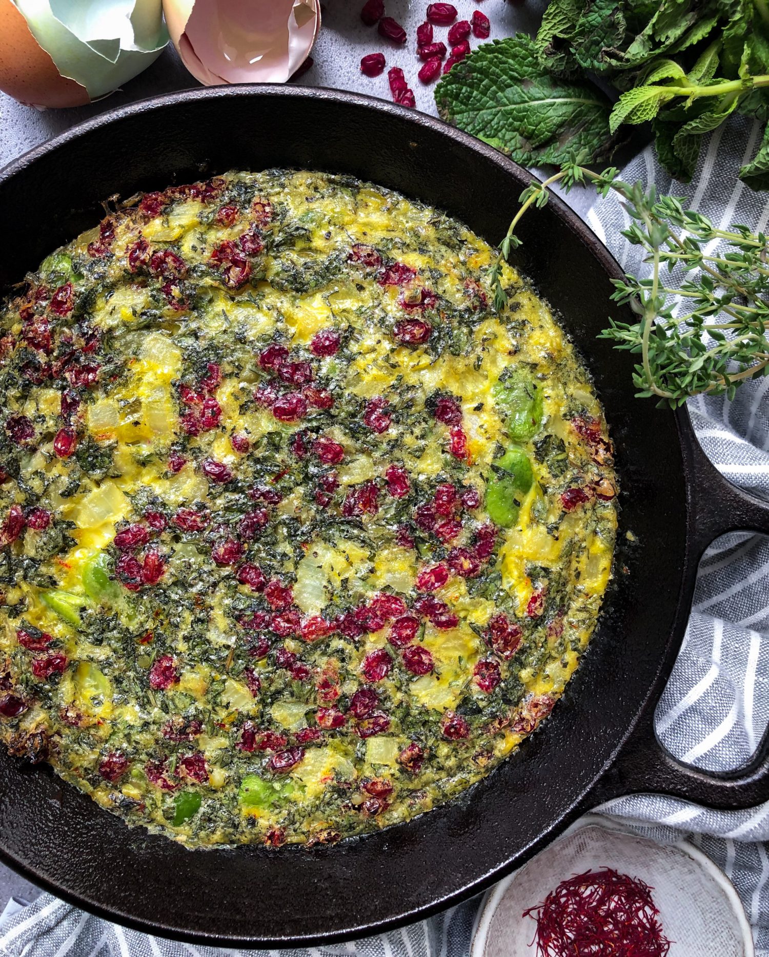Filed Under: Breakfast, Spring, Vegetarian Tagged With: barberries, cream, dill, eggs, fava beans, frittata, garlic, mint, onions, parsley, persian, saffron