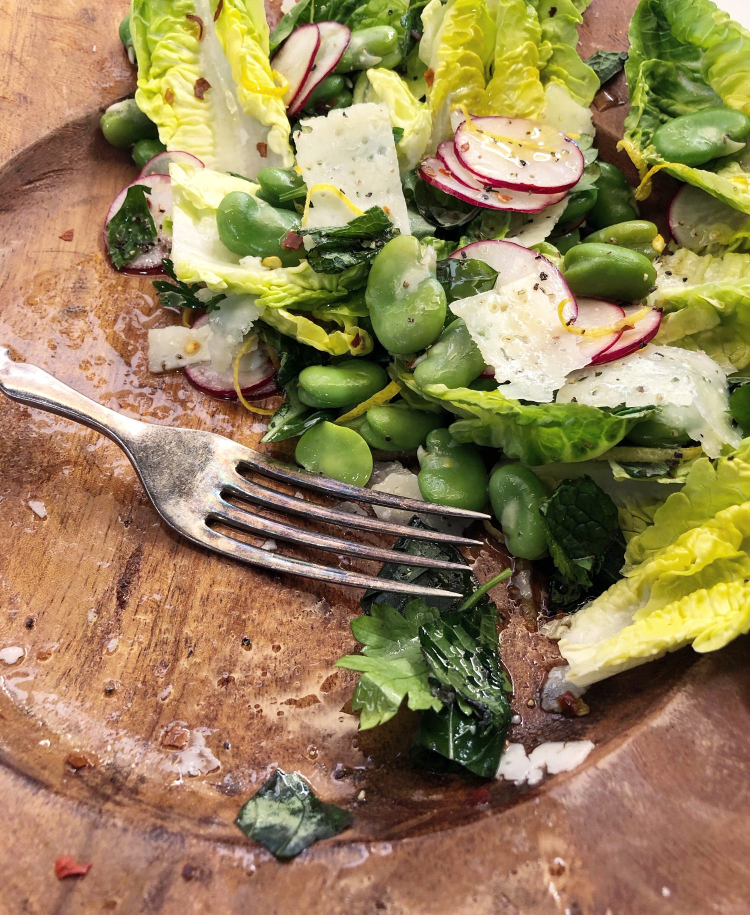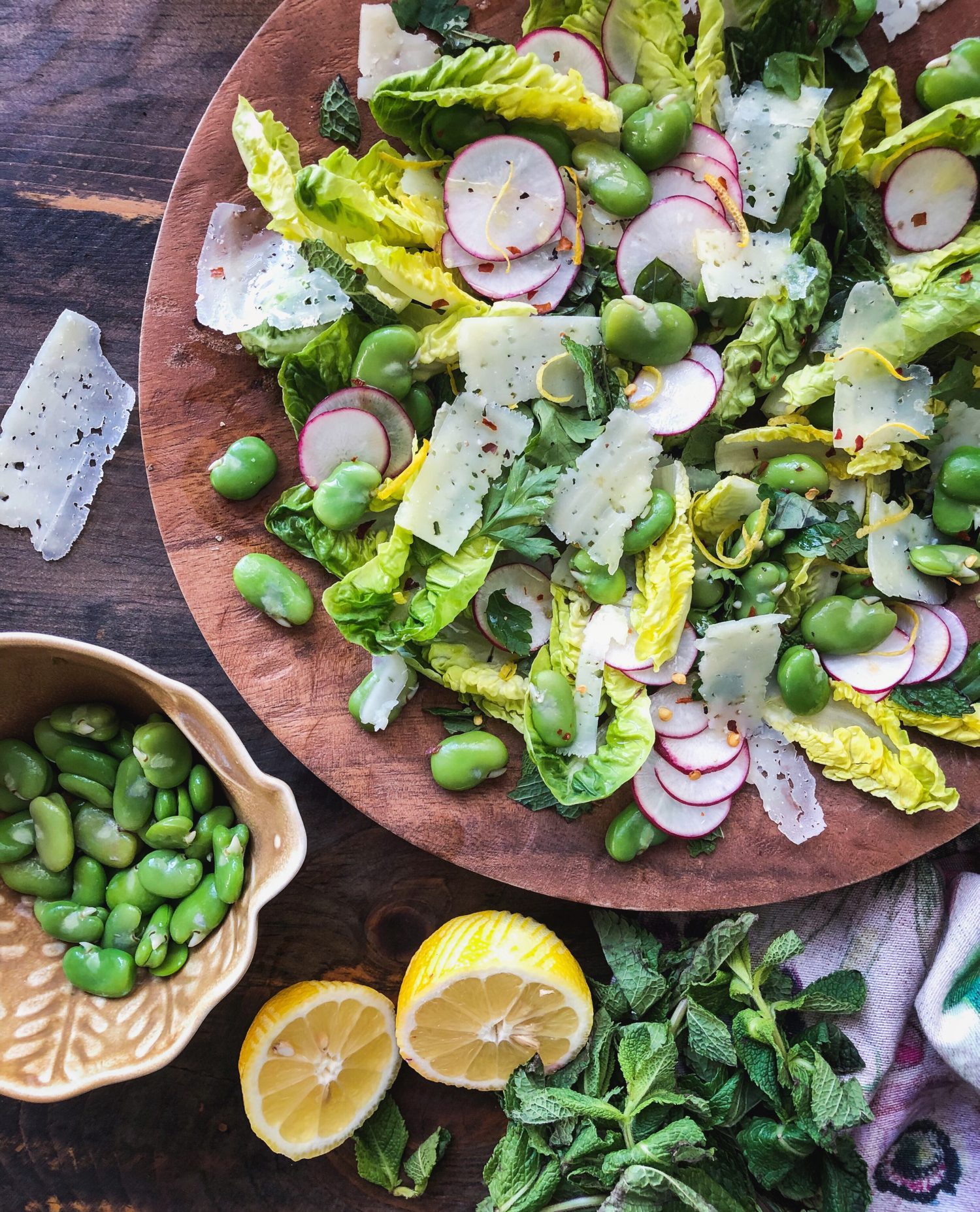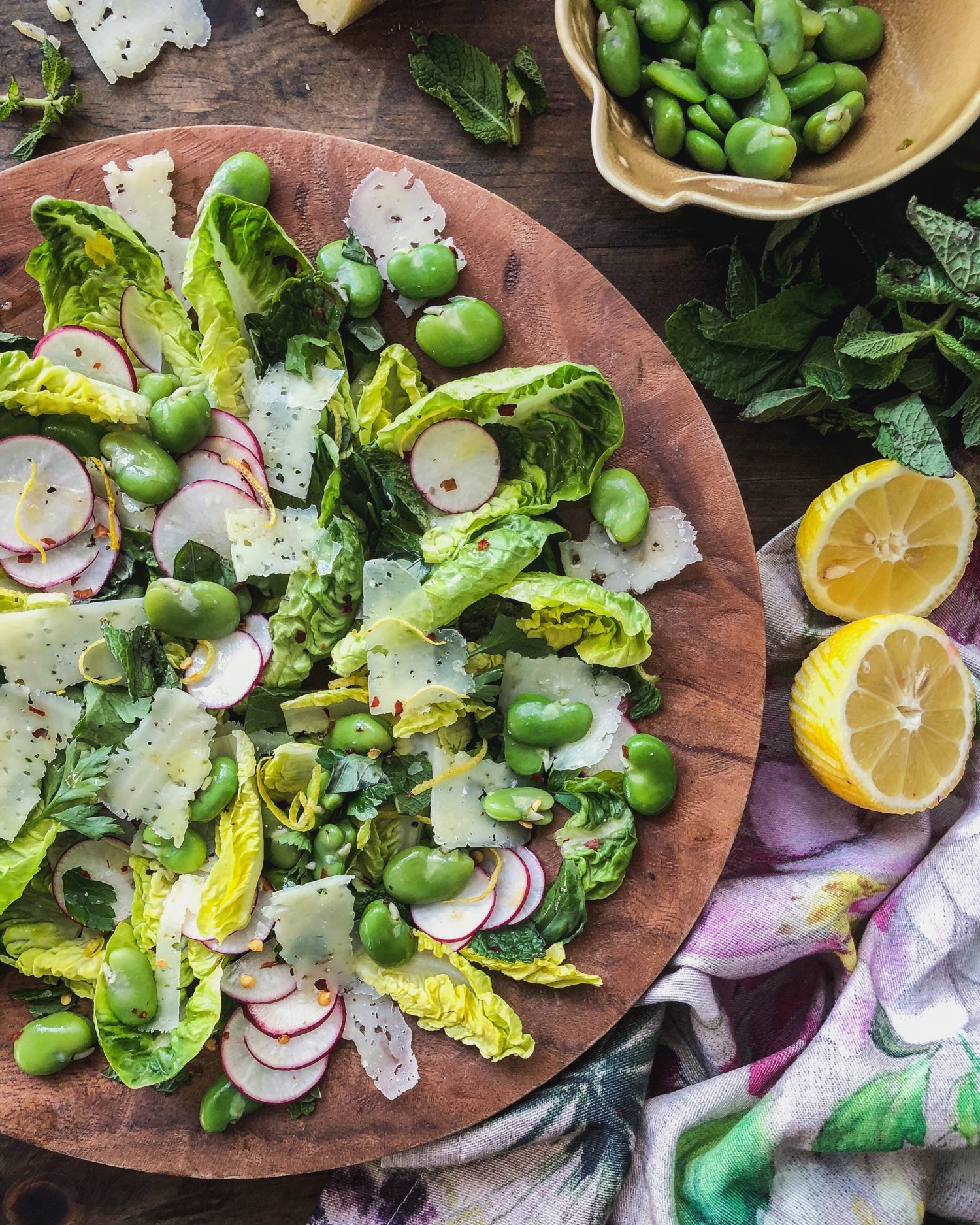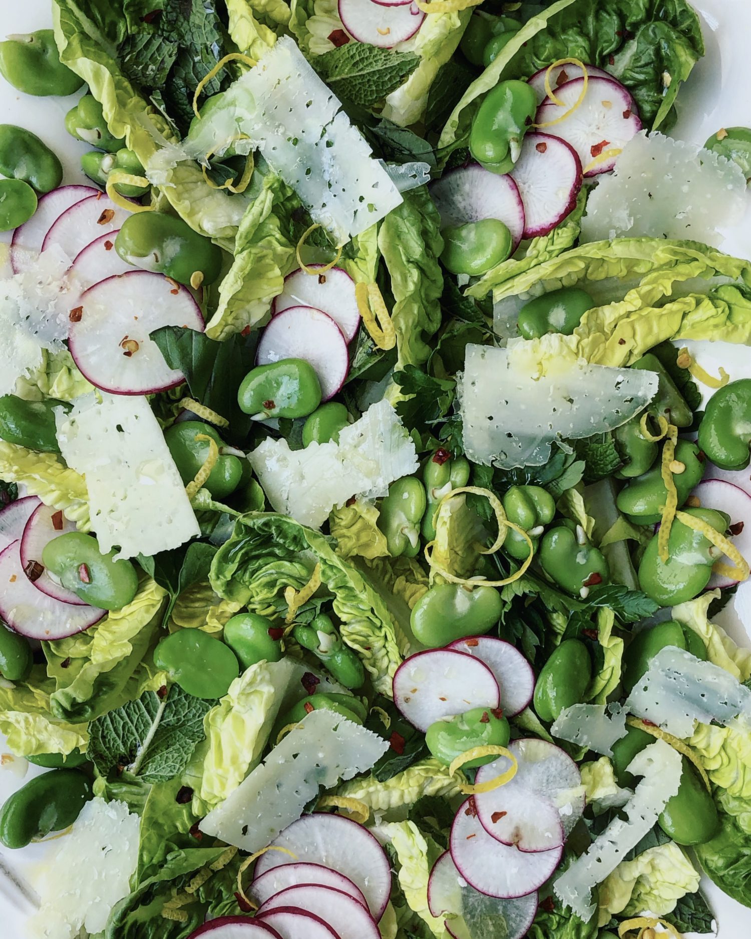 So for this salad, it will be the freshly blanched and peeled fava beans, little gems lettuce, mint, basil, and radishes. Fava beans and mint go together like milk and cookies. It’s a very Middle Eastern flavour combo. I like dressing salads like this in the most simple way possible. So it is lemon juice, olive oil, salt and pepper and some hot chilli flakes for this mixture. And to finish it all off, some shaved Manchego cheese. Manchego, Feta, Pecorino, theses all work really well in salads like these. They aren’t overtly strong or overpowering, and yet add a wonderful creamy salty presence. A great balance to all the greens going on.