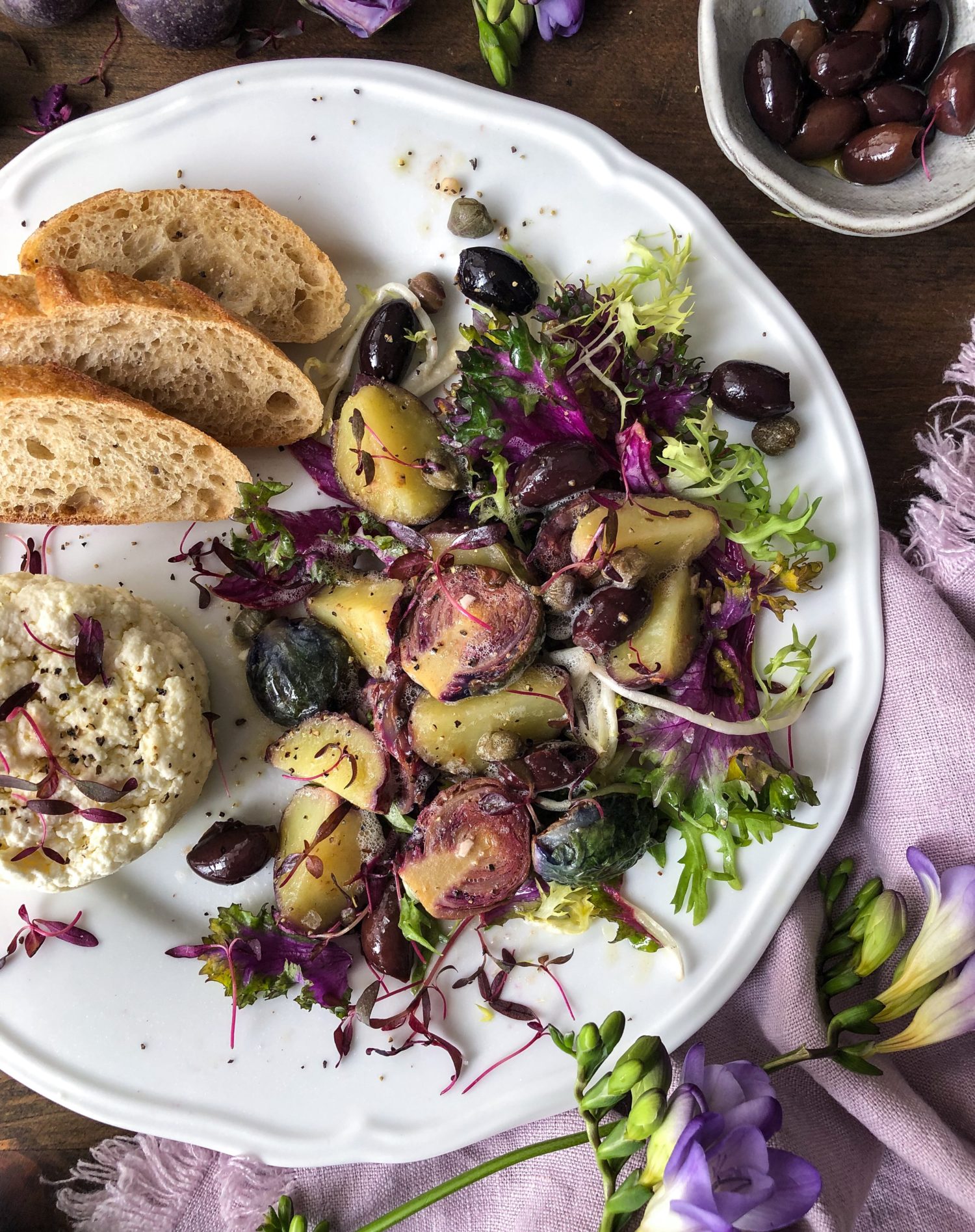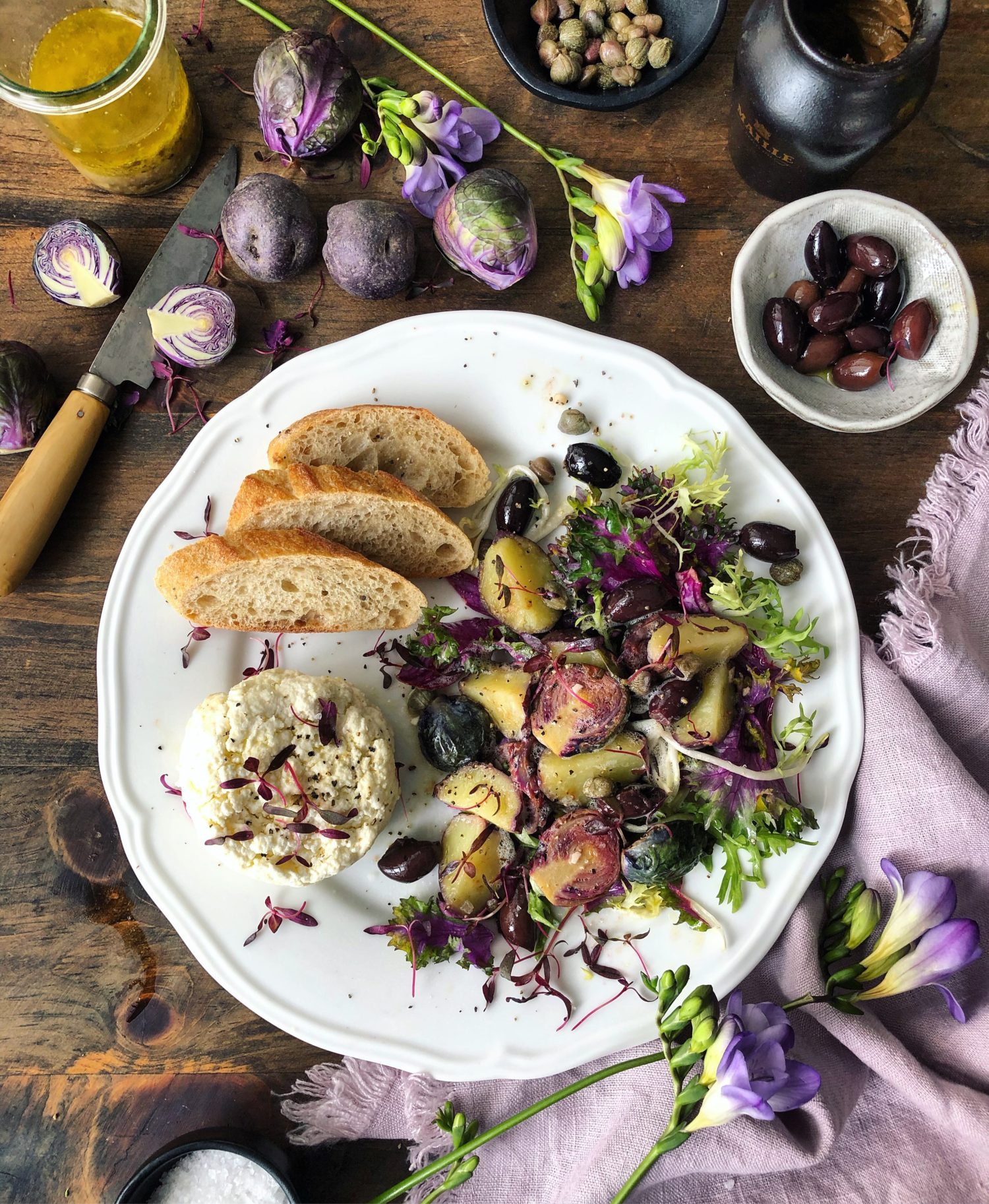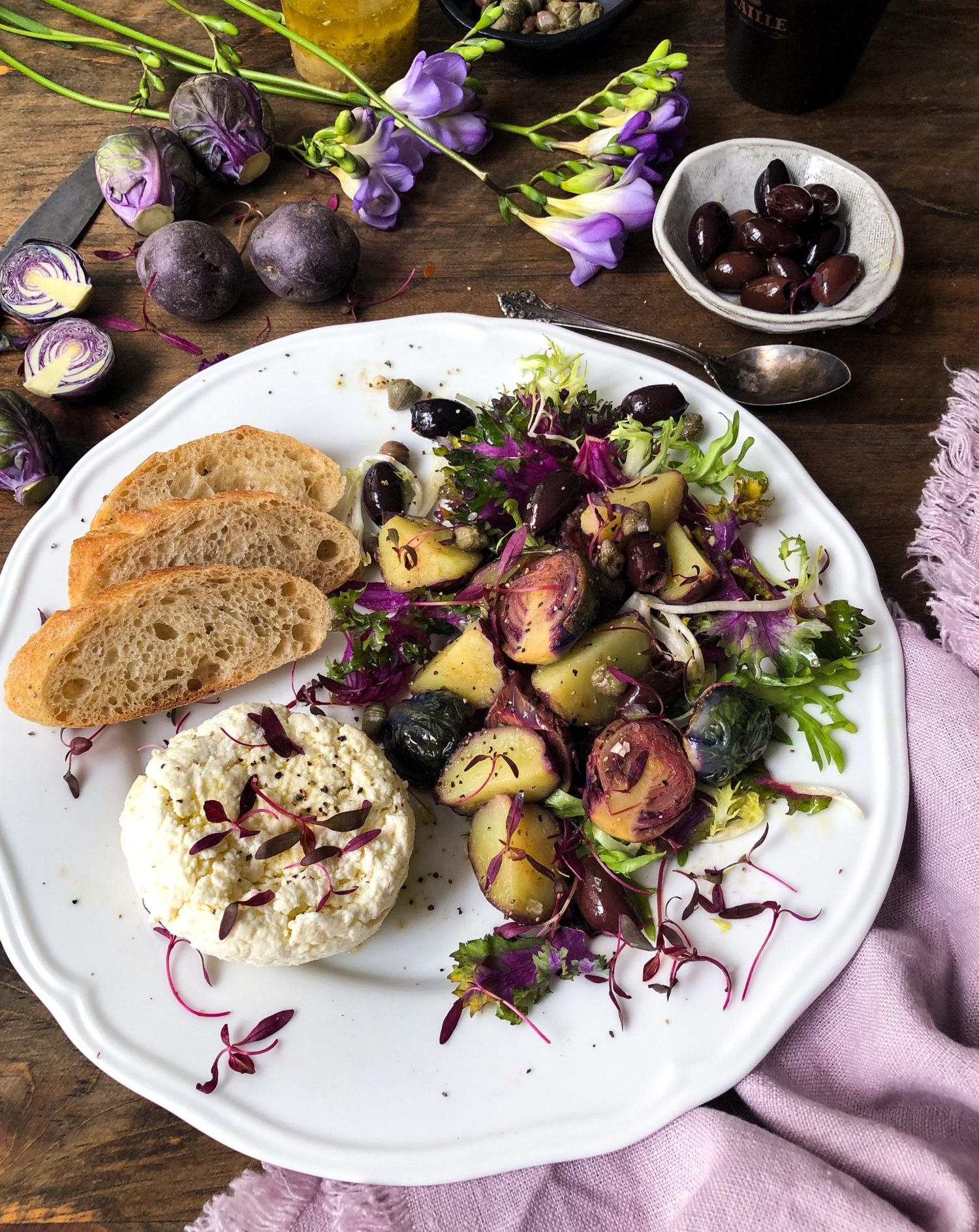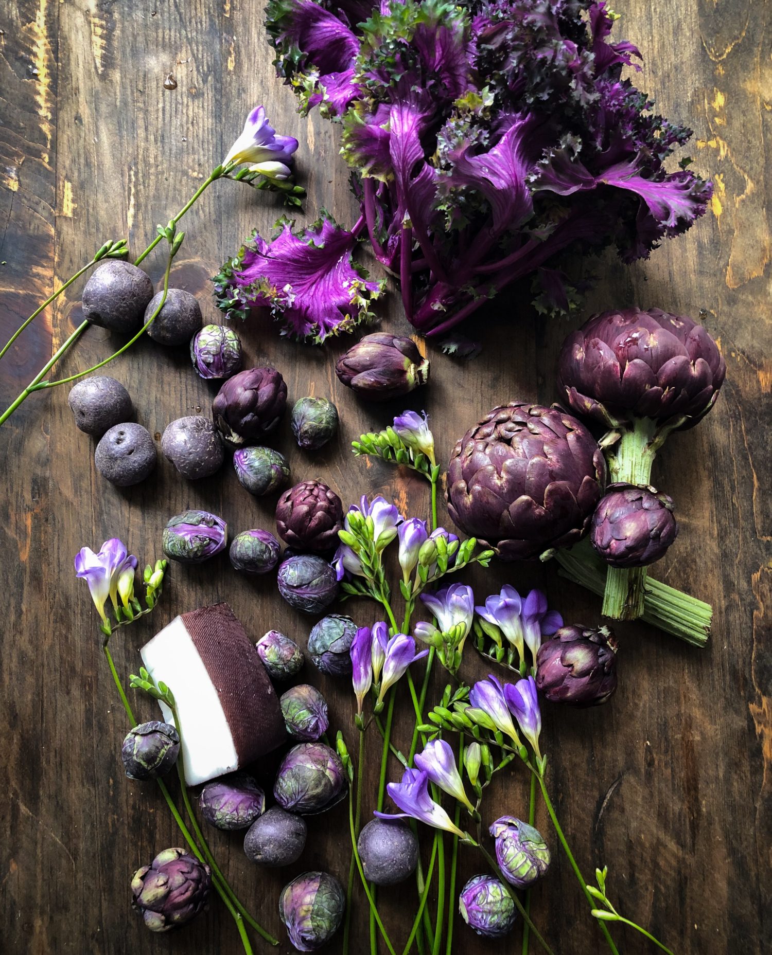 Purple brussels sprouts, artichokes, potatoes, flowering kale, goat cheese