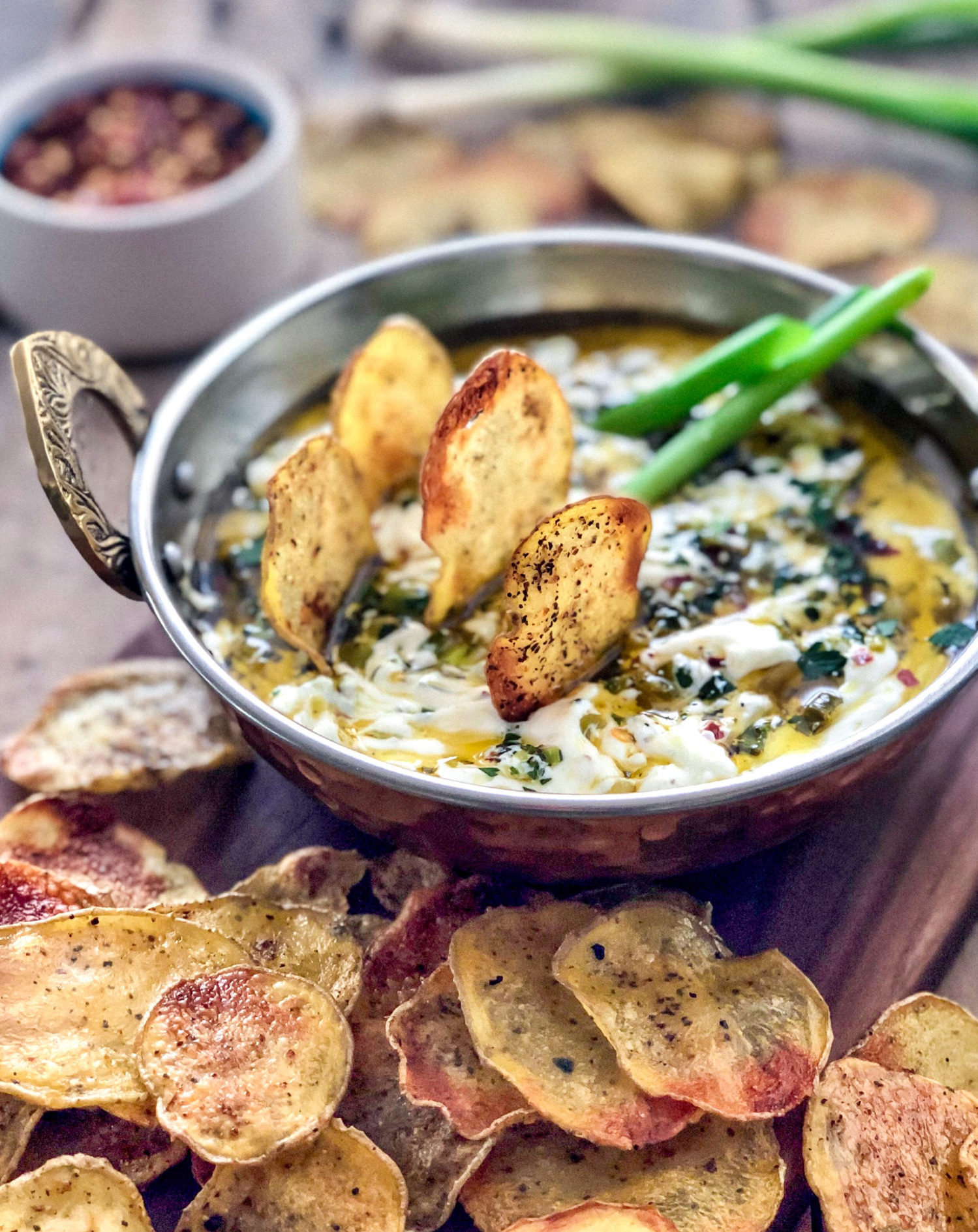 Labneh with Chilli Sizzled Scallions and Baked Potato Chips