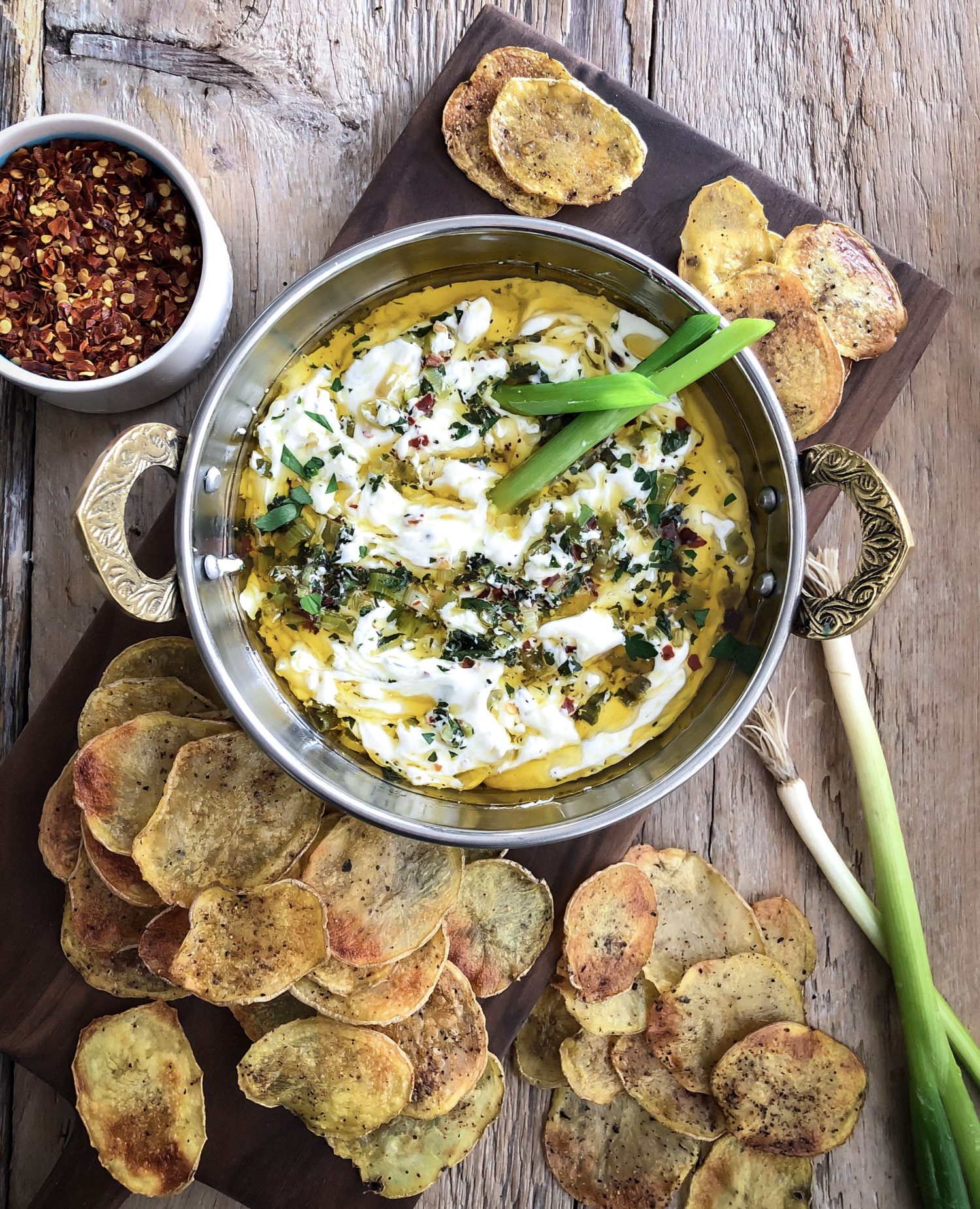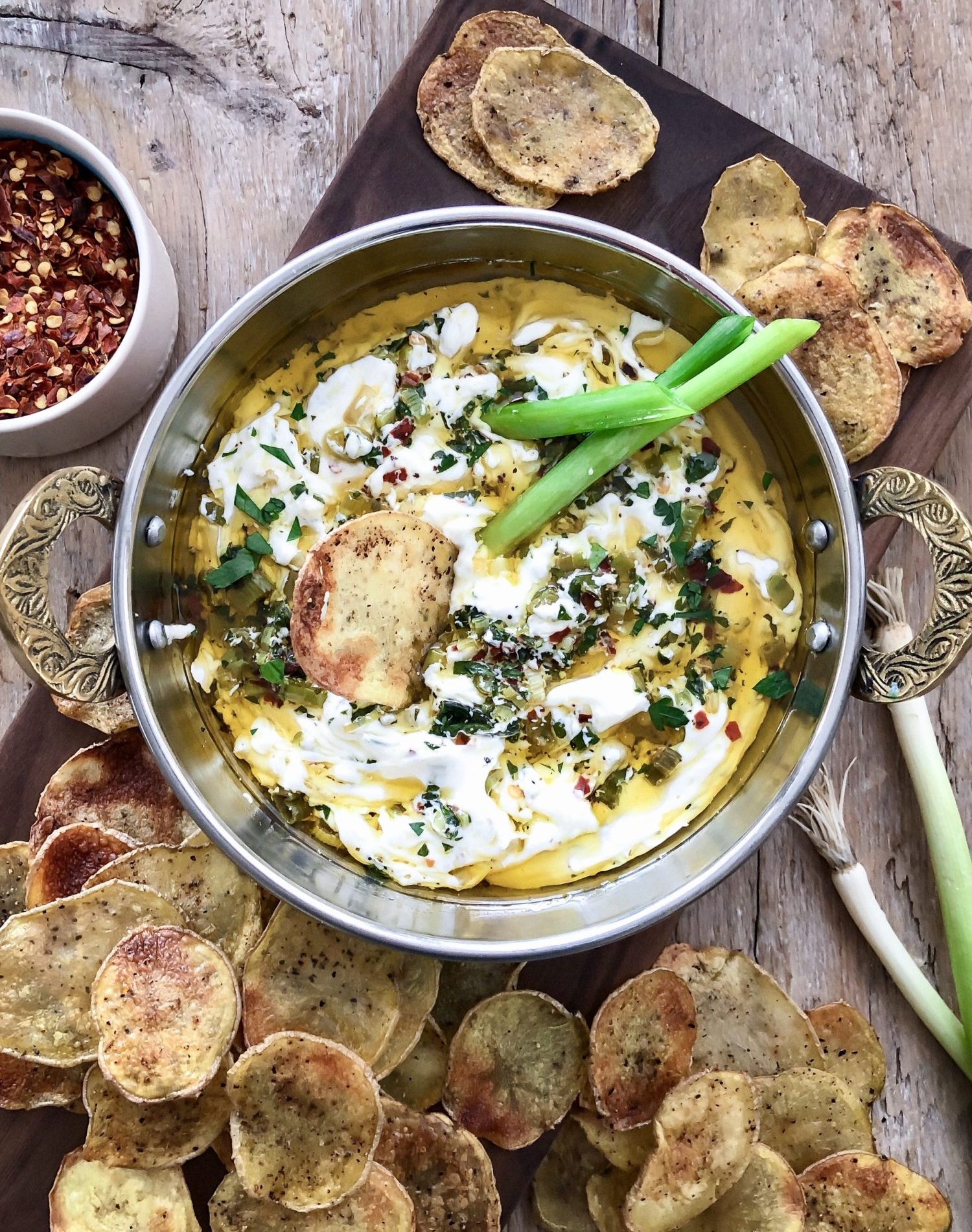 Creamy labneh or yogurt is transformed into a kicky onion dip with sautéed scallions and chilli flakes. The perfect dip for crispy homemade potato chips!