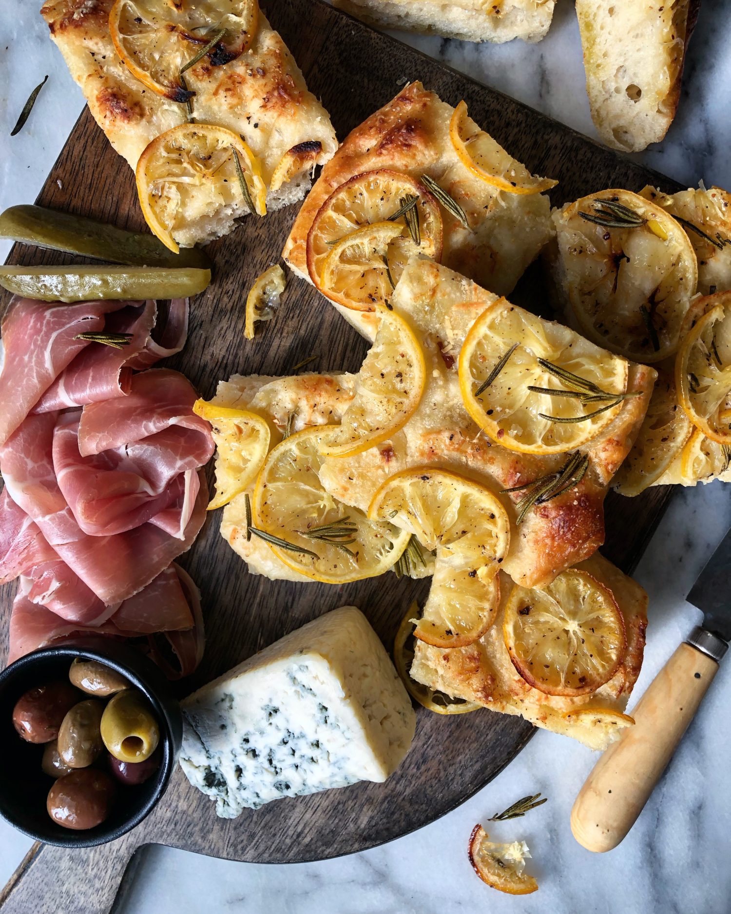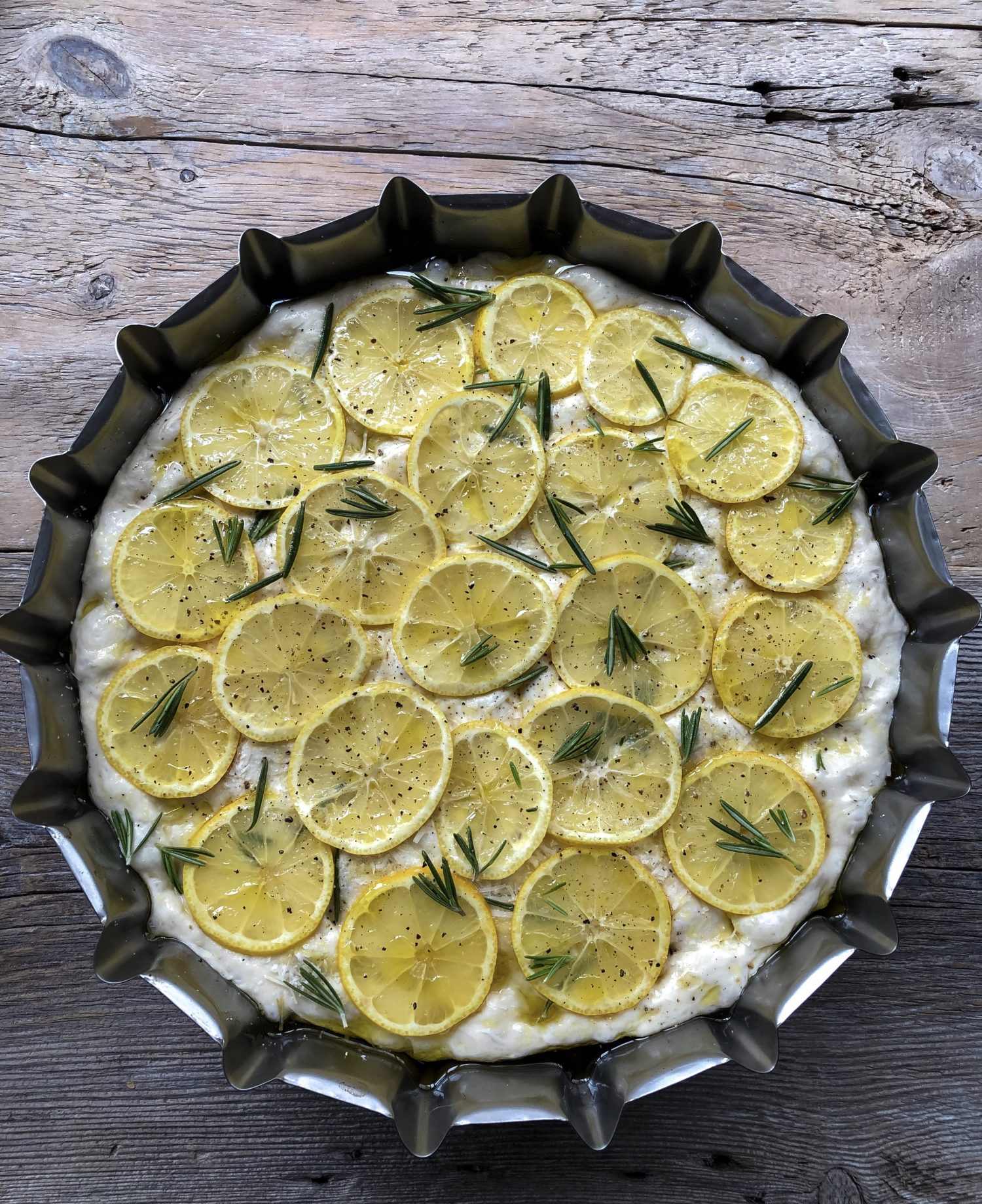 This is where you can really have fun with your focaccia, and personalize it.  For today’s recipe, I used thinly sliced lemon rounds, parmesan cheese, kosher salt, cracked pepper, and rosemary.  Ideally if you can get Meyer lemons, they would be wonderful.  They bake into an even sweeter version of themselves.  But good organic lemons work wonderfully as well.  The key is to slice them very thin.  A good sharp knife will be your friend at this point.  And once baked up, the rind cooks down and is quite edible.  But don’t feel obligated to eat it.  It can be removed easily be the eater him or herself.  I was going for the flavour profile of one of my favourite pasta dishes.  I love combining freshly grated parmesan, lemon juice and zest, cracked pepper and salt for a bright and simple sauce. The fresh rosemary helps to add an earthy element to the dish.  And they all work great on this bread as well!  Yay!