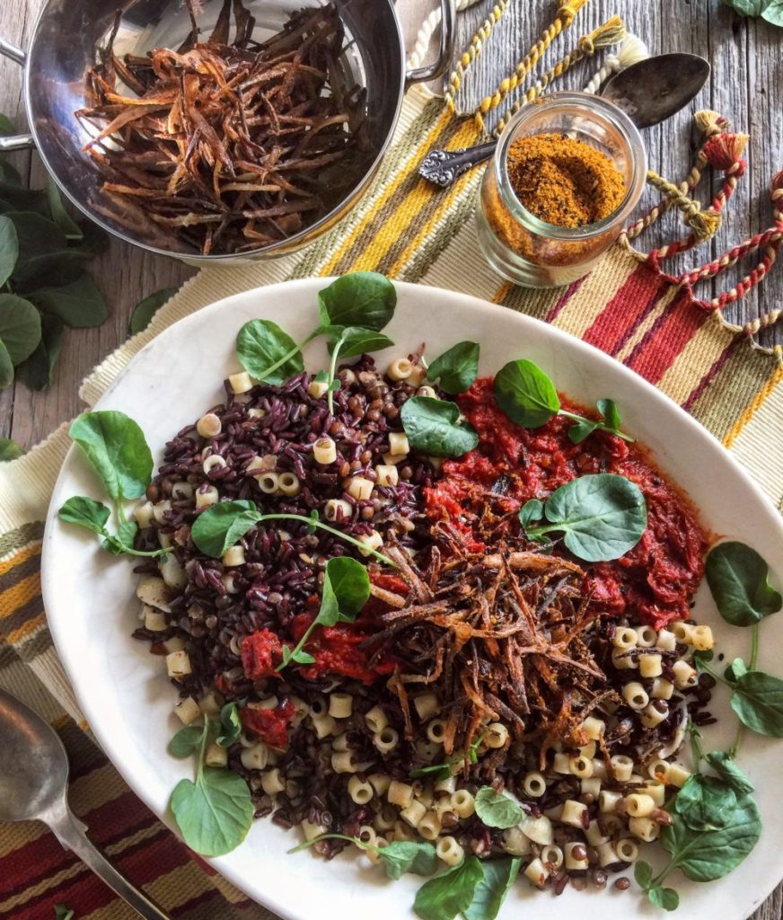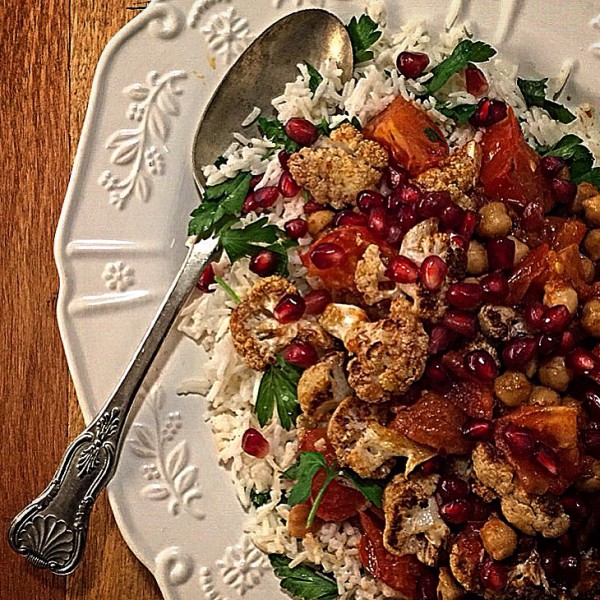 Spiced Roasted Cauliflower and Chickpea Salad over Coriander Rice
