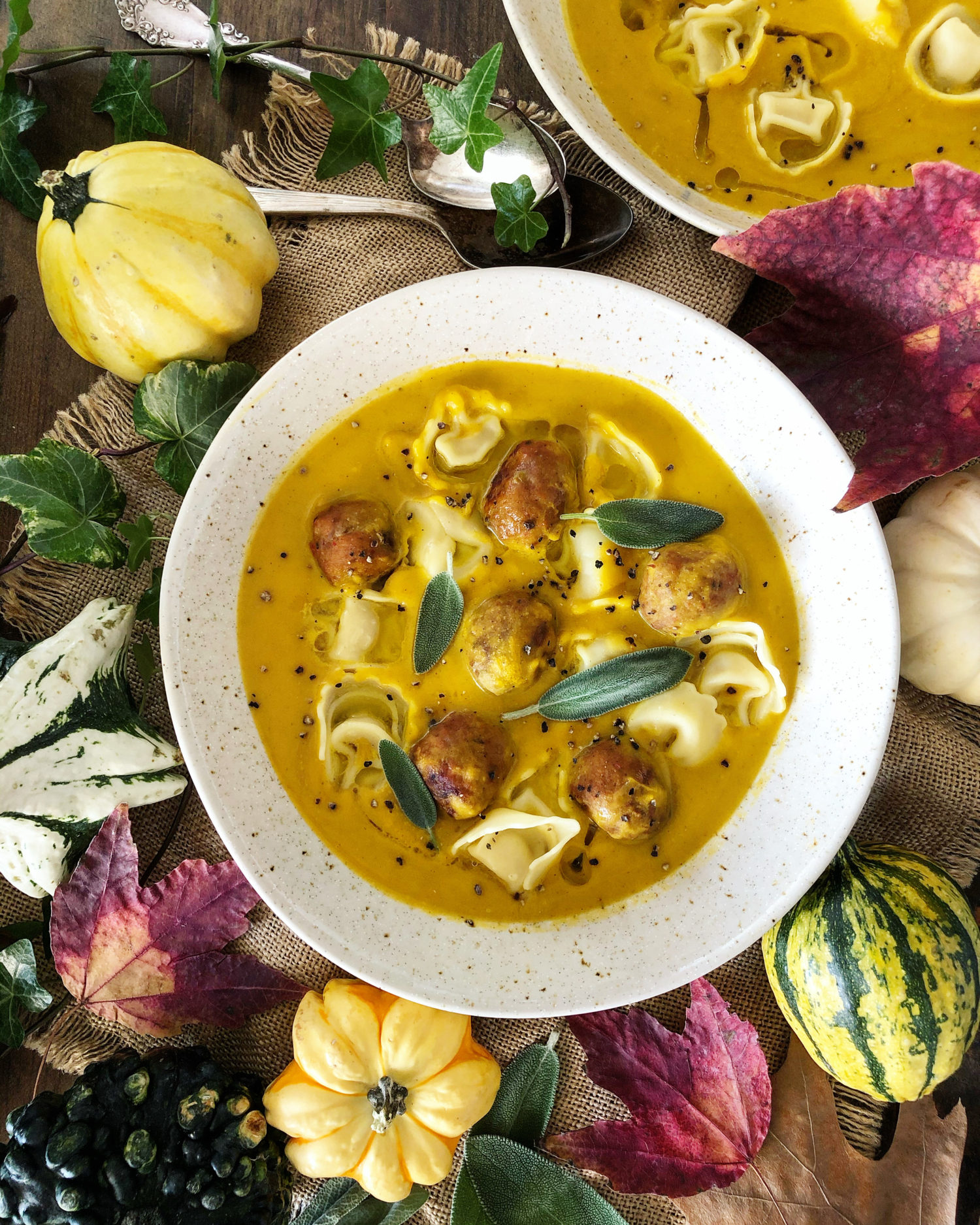 Butternut Squash Soup with Turkey Meatballs and Tortellini