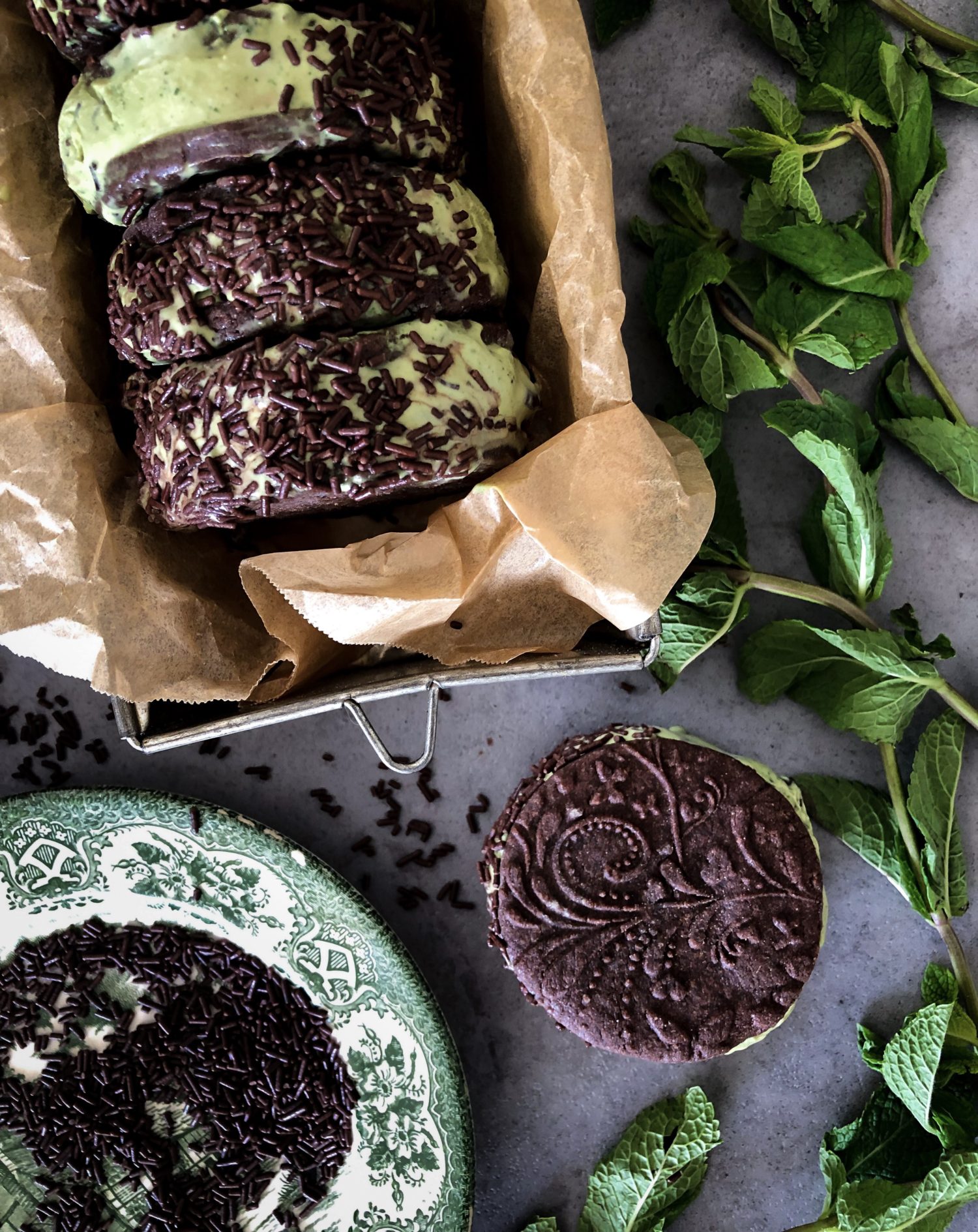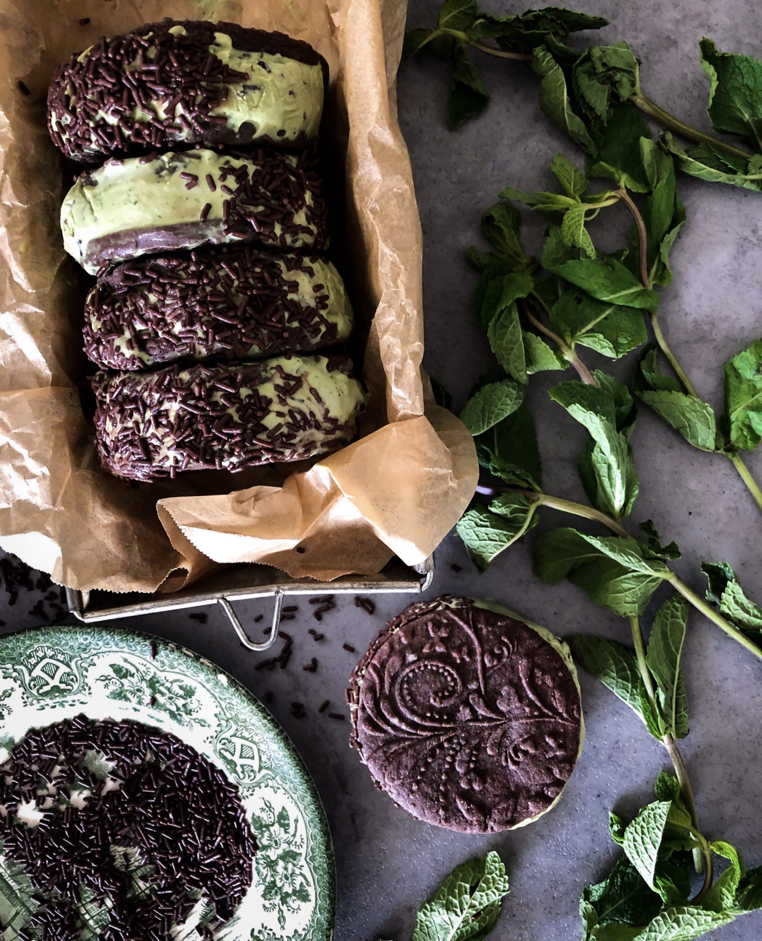 Through the years it continued to show up as a sweet treat theme. Next to Coffee Crisp, my favourite candy bars were Peppermint Patties, and Aero Mint bars, both of which I would store in the fridge- the flavours were even better when chilled. And remember going to the corner store and getting an ice cream sandwich from the cooler- I always chose the mint one.