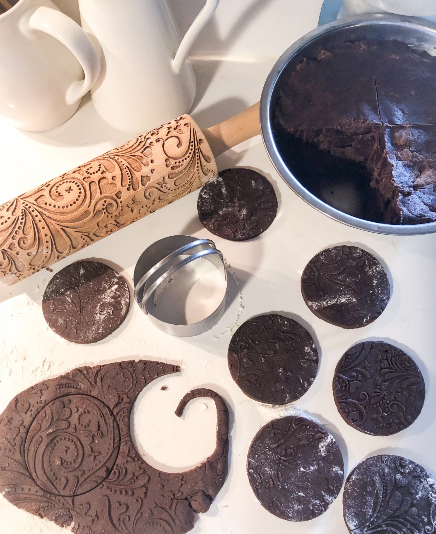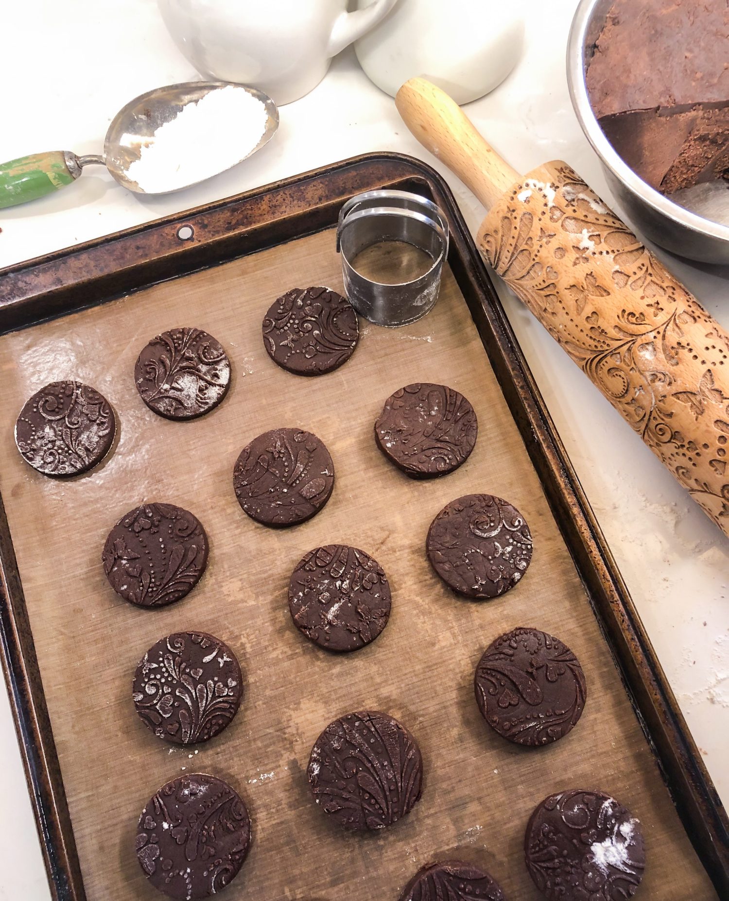 For these sandwiches, I roll them out to 1/6 inch, a bit thinner than the usual 1/4 inch. I want to be able to actually take a bite of the sandwich and fit it into my mouth. I used a 2 1/2 inch cutter. But before I cut them, I pulled out my embossed rolling pin, just for fun. In no way is this a necessary part of the recipe. But it sure is fun! So I have embossed cookies for my sandwiches. And since I used my embossed roller, I did flour the top of the dough a bit more than usual, but no worries, the flour basically bakes off in the oven.