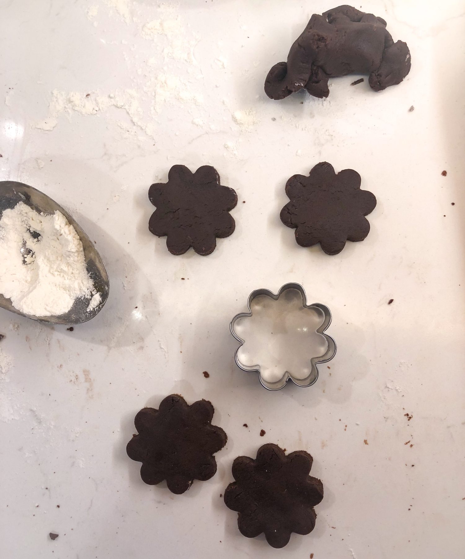 - Roll out cookie dough on floured counter. Cut into desired shapes, brushing extra deposits of flour off the top. (It does disappear once baked, though, so don’t overly fret if they go into the oven looking white.)