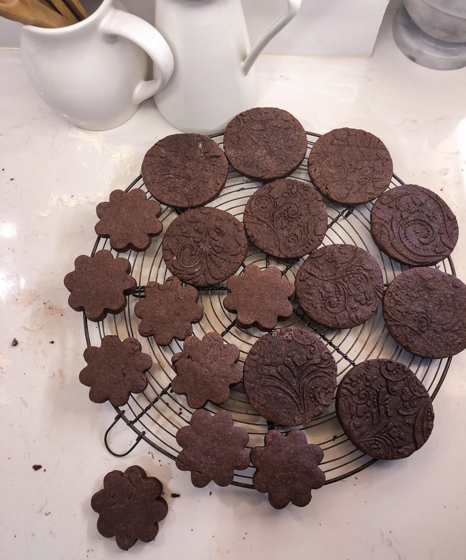 This is a fabulous cookie adapted from a recipe from the Smitten Kitchen. I’ve used it as a base for all sorts of recipes and desserts throughout the years. It is tender and soft, does not shatter, and has the perfect chocolate flavour. It’s a simple rolled out cookie dough, that you use cutters to shape the cookies. I decided to add bourbon (because it goes so great with mint) and chocolate bitters, to bring out the chocolate flavour a bit more.