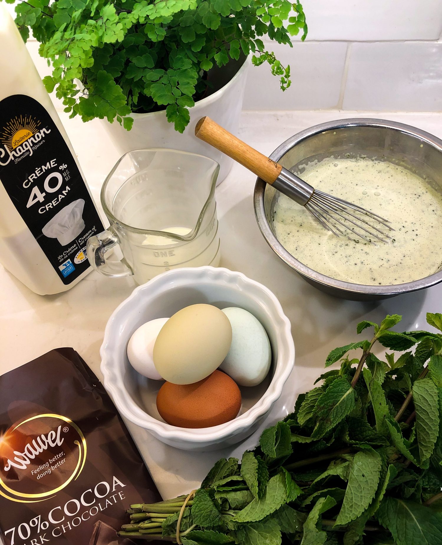 To get the mint flavour and colour, a large bunch of fresh mint leaves gets scalded with hot water and then chilled in an ice water bath. Dry in a tea towel and then add to a heavy duty blender with the chilled custard. It all gets puréed together till the mint leaves have practically disintegrated. The whole batch gets pushed through a fine mesh sieve to capture the last bits of mint leaf and any matcha powder that didn’t dissolve. Here is my extra addition: mint bitters. You will really get the mint flavour full force if you add bitters or a mint extract of sorts. Do both, I do! Back into the fridge to chill overnight.