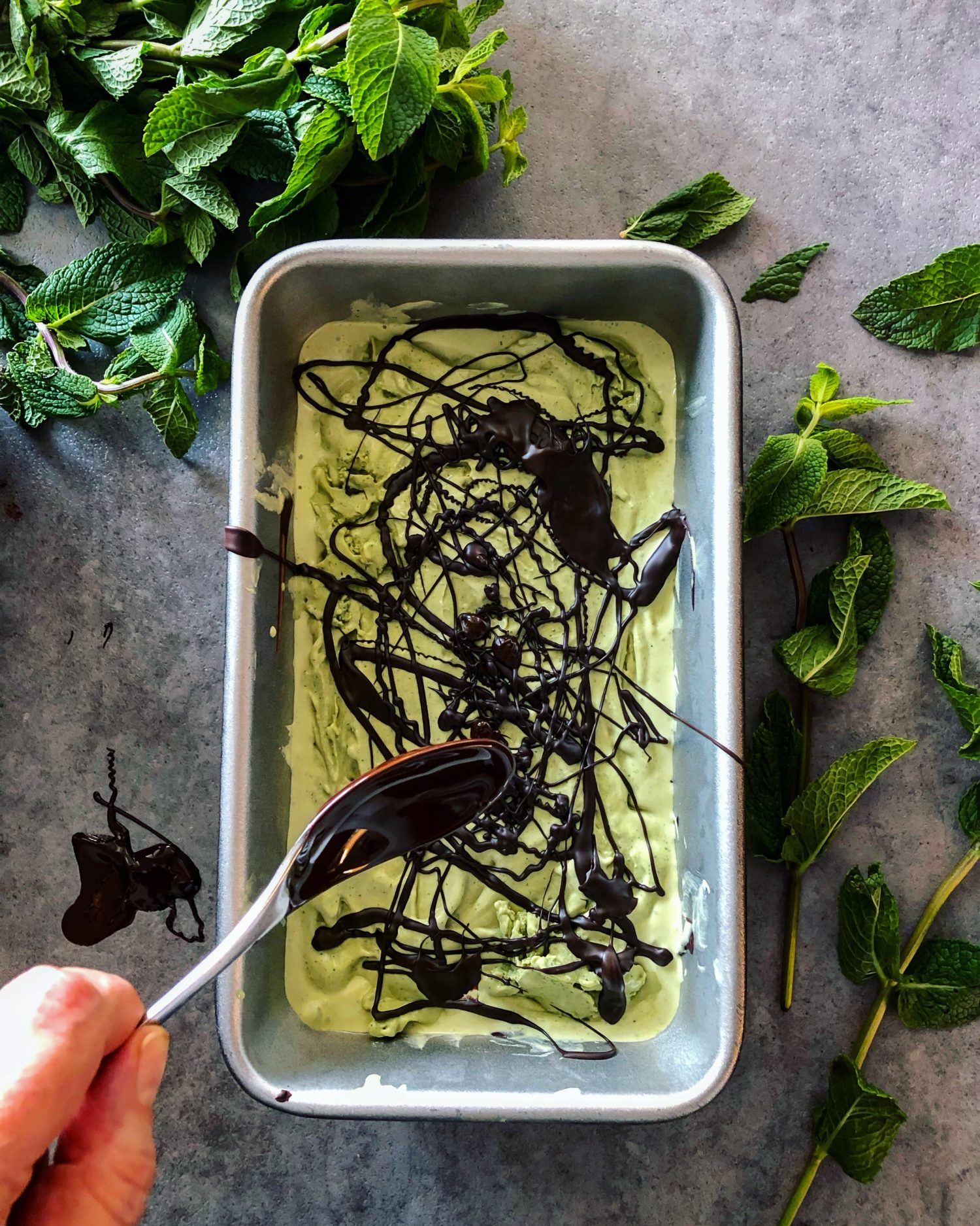 The next day you’ll pull out your ice cream maker, turn that custard into ice cream and prep some chocolate while it’s happening. Melted and slightly cooled chocolate is drizzled over the ice cream as it is ladled into your container. There will be chocolate in about four layers of the ice cream. Because you have a great ole time drizzling it around and over, it creates thick and thin patches of chocolate. Later when you go to scoop some out, the best sound happens as the chocolate cracks and shatters into the scoop!