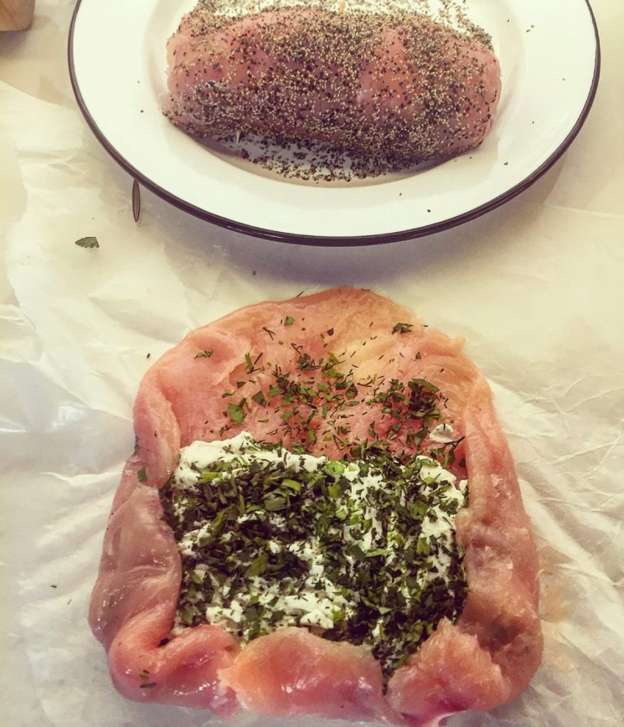 It really is an easy recipe. Butterfly your chicken, and spread open on wax paper. Cover with another sheet of wax paper. Pound out till uniformly thin (about 1/4 inch or so) Spread some goat cheese across the lower half or so, and sprinkle with a goodly amount of freshly chopped herbs. Tuck in the sides, and roll up, making sure that the ends stay closed inside. Secure with toothpicks. Roll in coarsely ground pepper. Then you’ll sear them on all sides in a sauté pan. Once all sides are a lovely brown, add wine and chicken stock, cover and simmer for another 20 minutes. Then you’ll remove the breast rolls to rest, while you reduce the cooking liquid into a sumptuous gravy. And there you have it!!