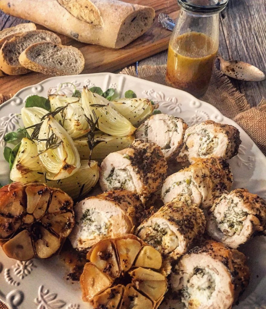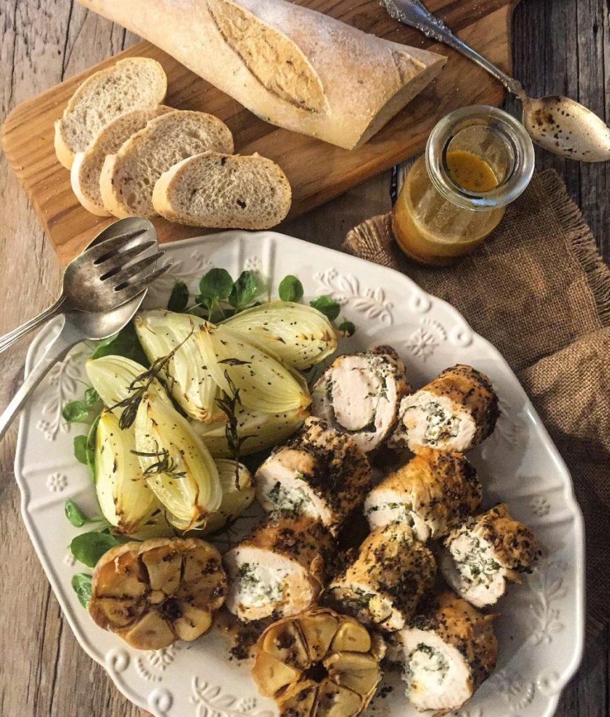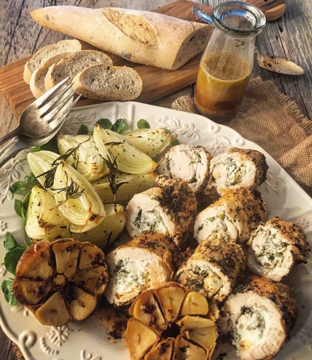 Tender, juicy chicken breasts rolled around chèvre and fresh herbs, with a pepper crust, all of which enhance the most amazing gravy. Perfect for family dinners, and yet totally company worthy.