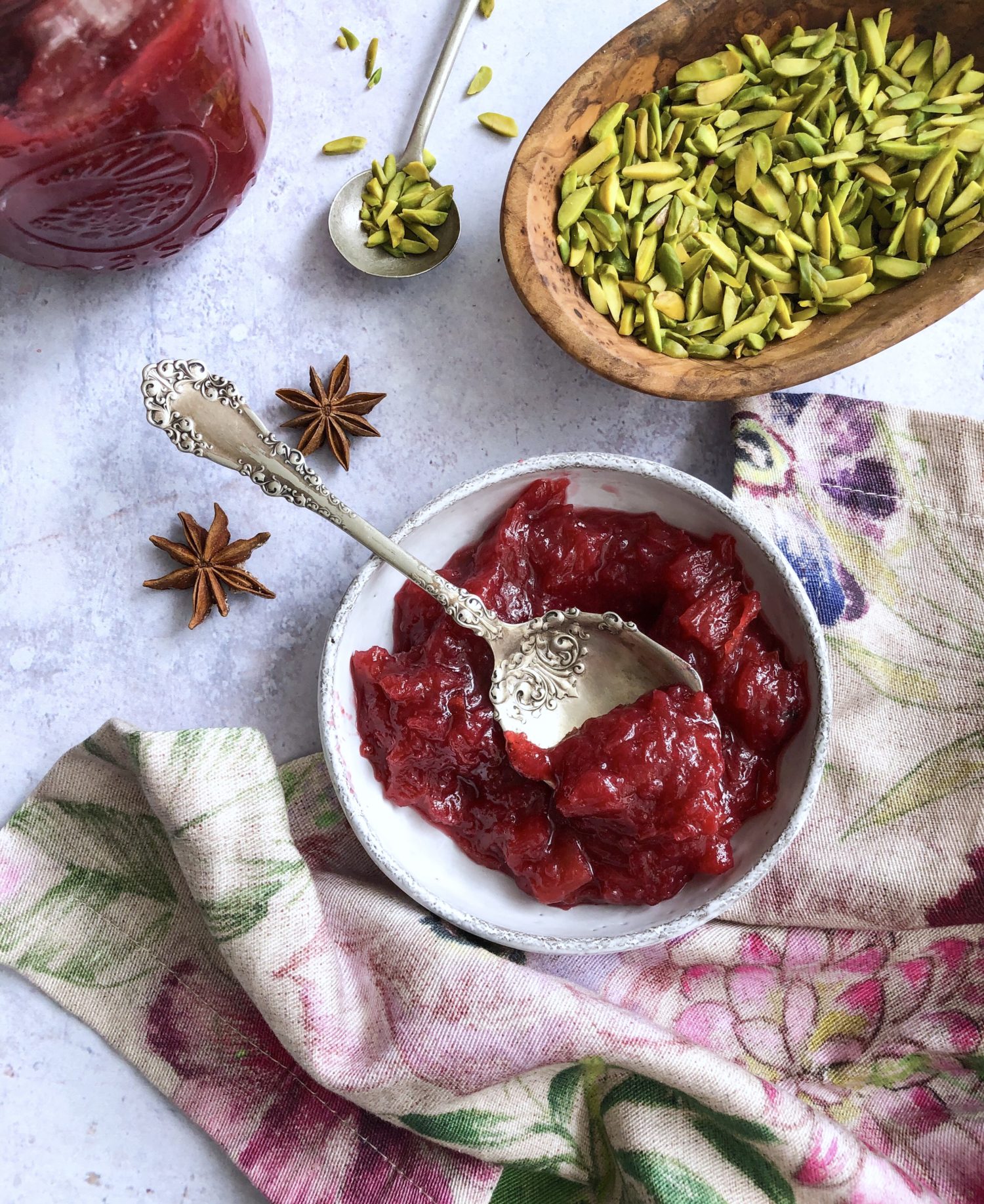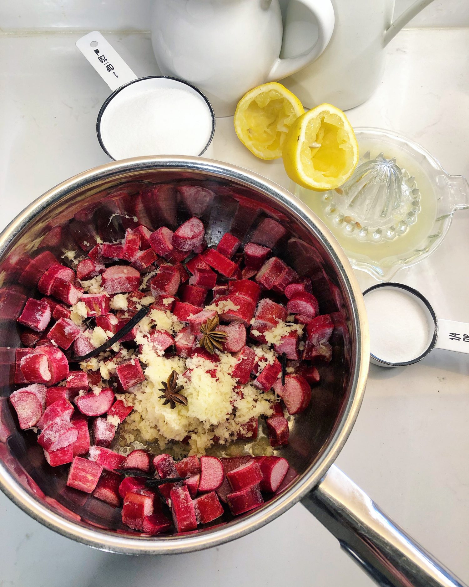 A spicy Rhubarb Compote is created easily on the stove top.  Chopped rhubarb, spices like ginger, vanilla bean, sugar, star anise and cloves are all added to a pot, and marinade together with some lemon.  Then after the sugar has pulled out some of the rhubarb juices, you’ll boil it till it thickens, stirring it occasionally. Remove the star anise and vanilla pod and store the cooled compote in sealed jars.  You can even treat this like jam for toast or to use in smoothies.  Make up a good batch, freeze it and you’ll be tasting springtime in the middle of December!