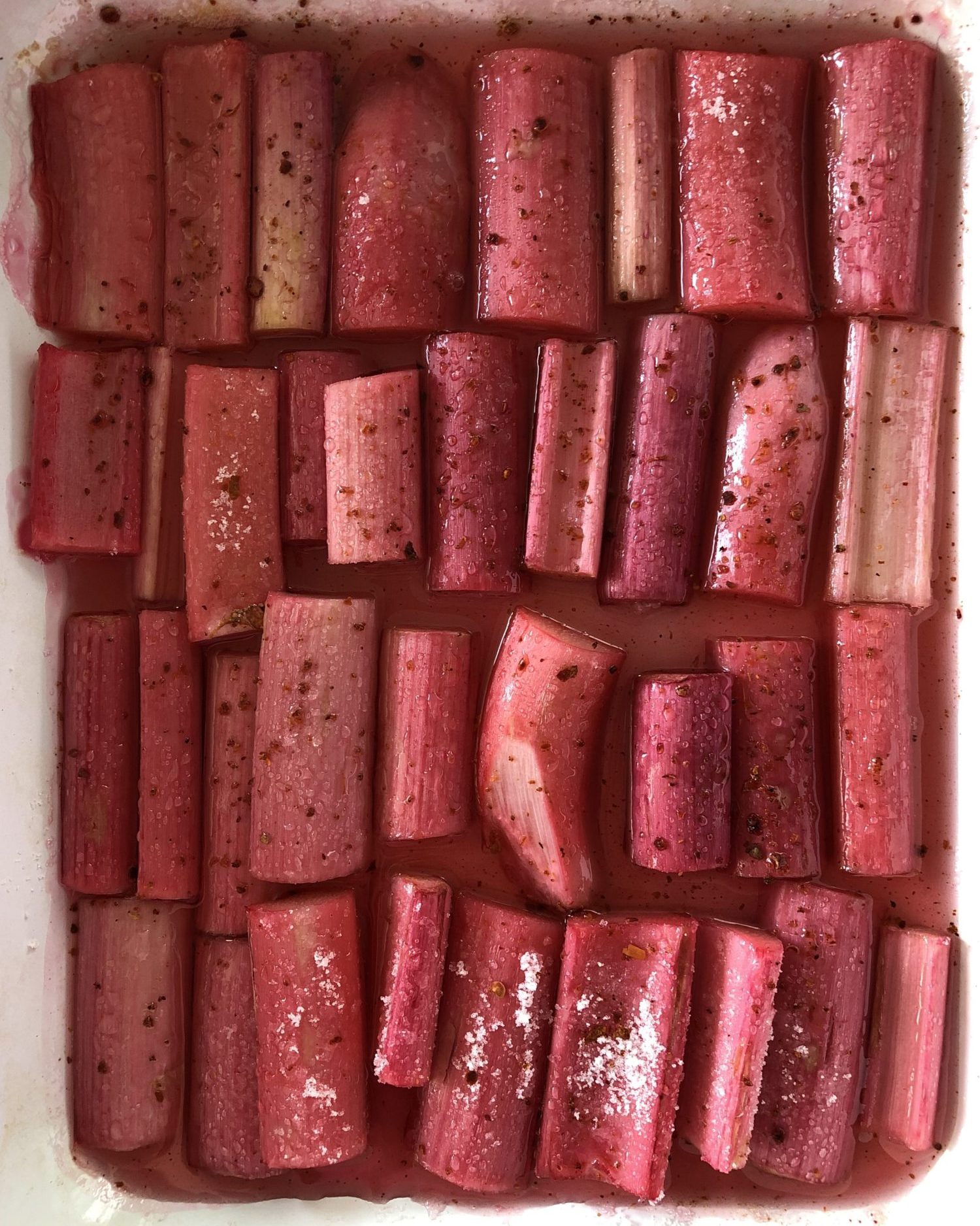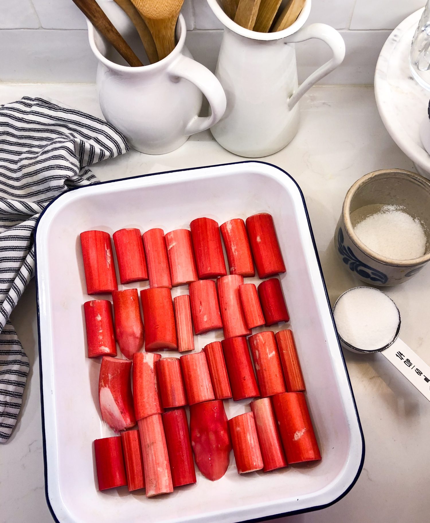 3. Slice the rhubarb stalks into 2 inch pieces and put them into a baking dish large enough to hold them all in one layer.