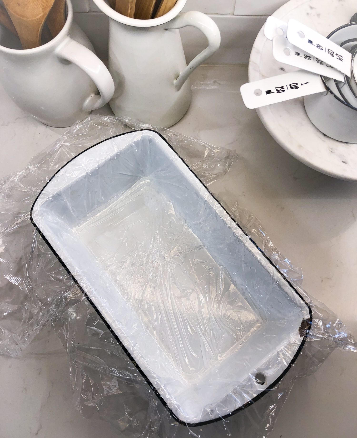 2. Line a 9x5x3 inch loaf pan with plastic wrap, making sure there is at least 3 inches of overhang on each side.