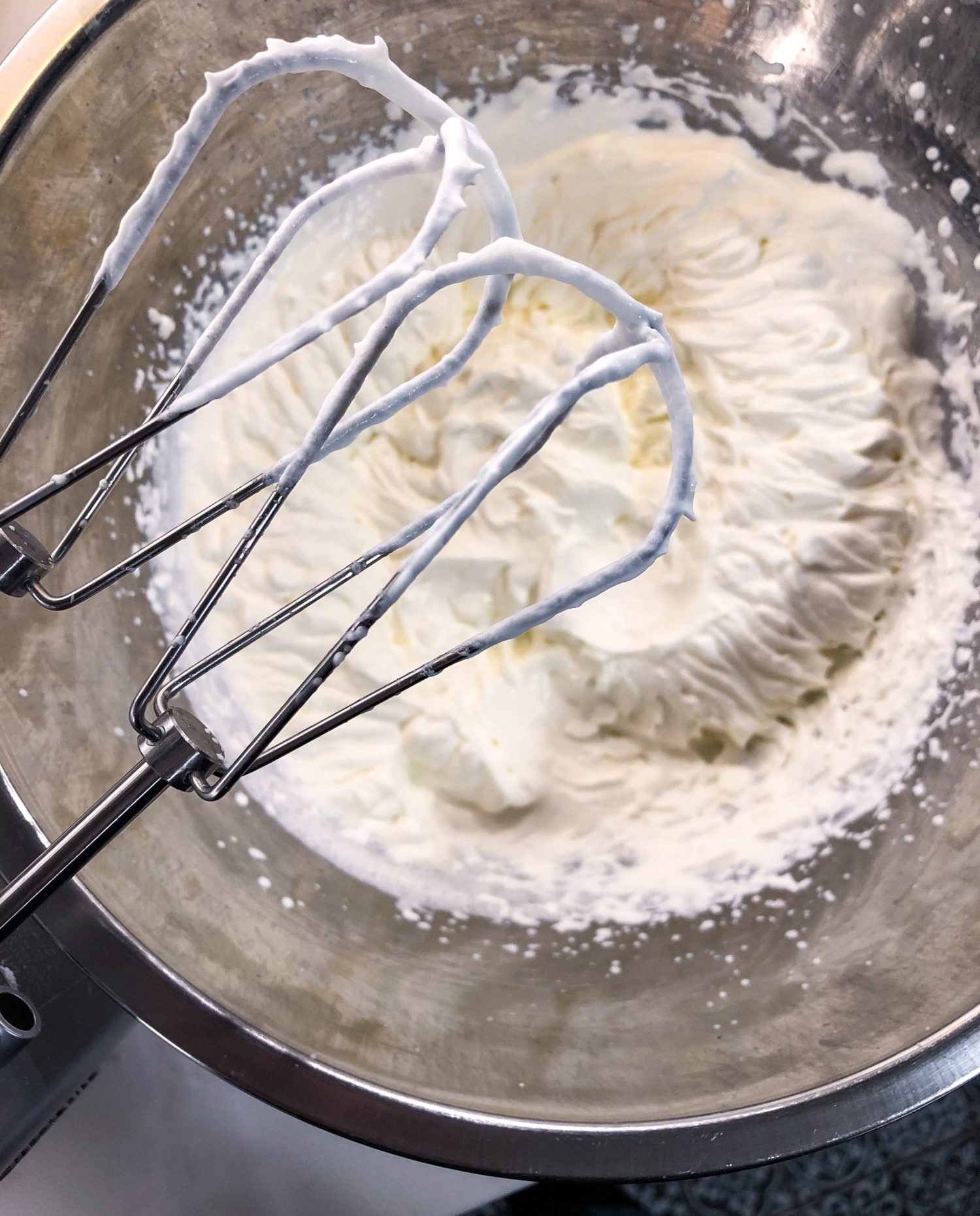 2. In a separate bowl, whip the cream with clean beaters. Start of slow but gradually increase speed till it is on high. Whip until the cream has achieved peaks, just not stiff ones.