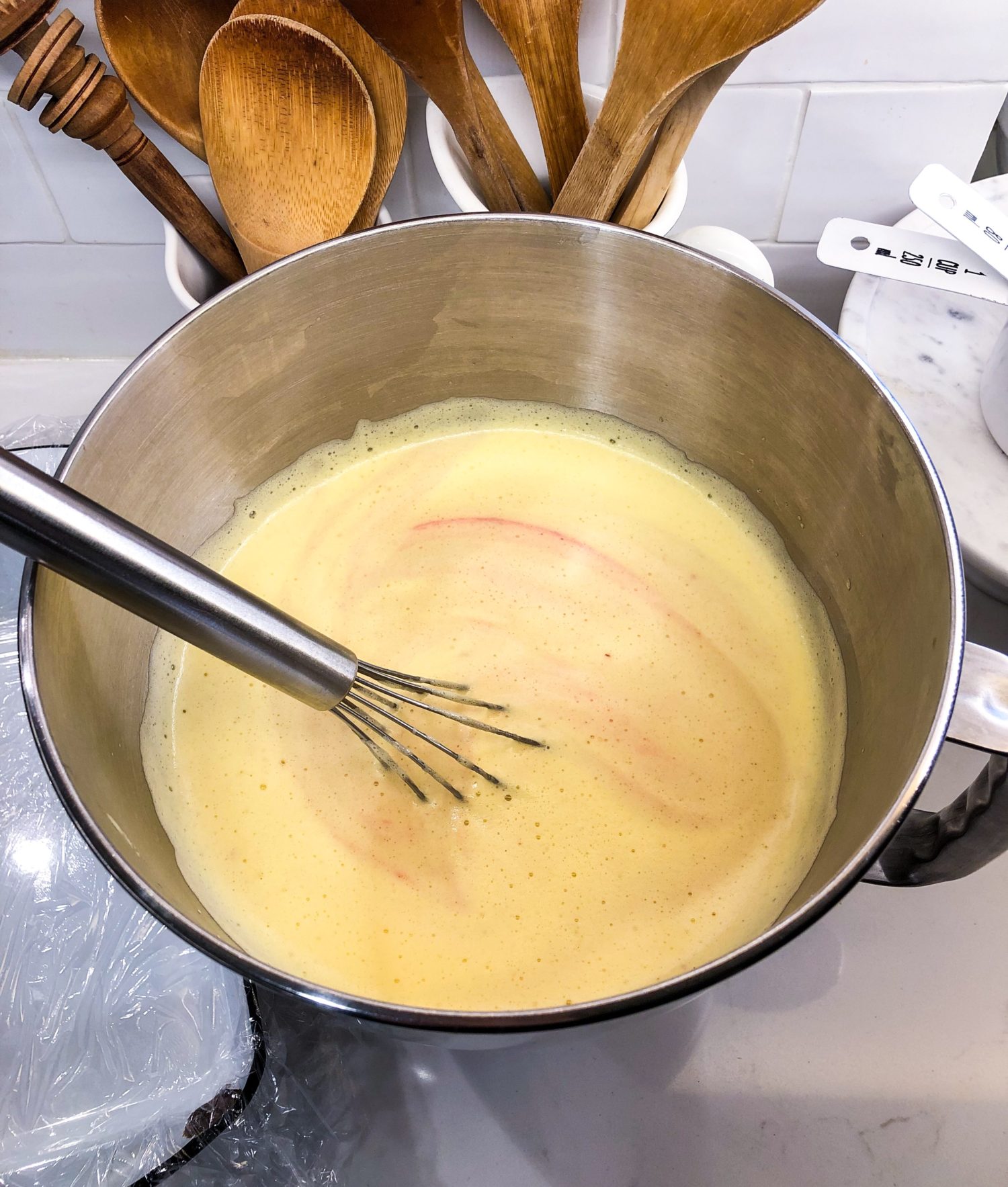 When ready, whip up the eggs and sugar.  For this a stand mixer is best.  Because it will take a little while.  But when you return after about 7-8 minutes, they have turned into the most amazing pale yellow mass that has grown in volume.